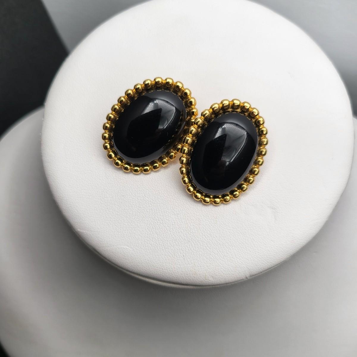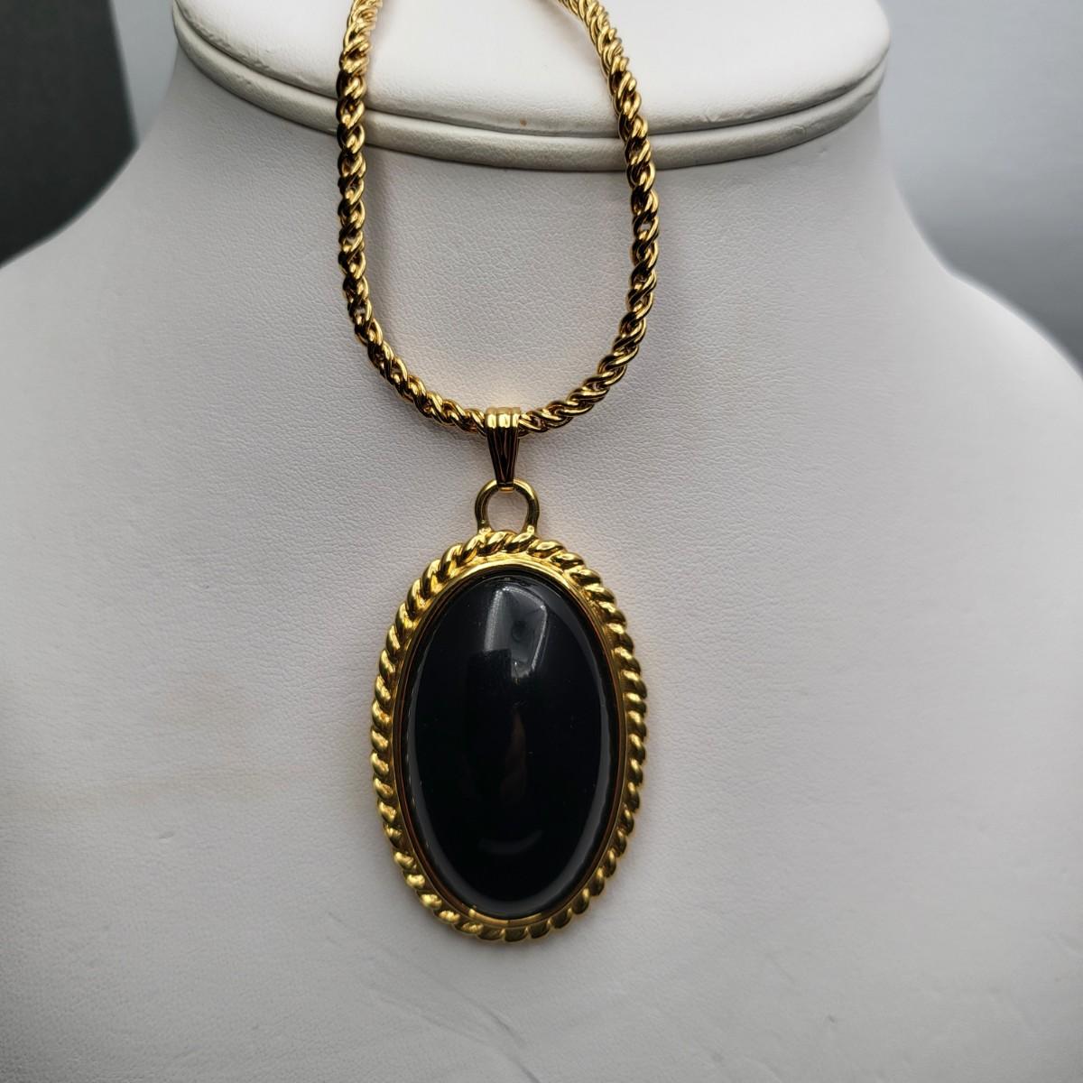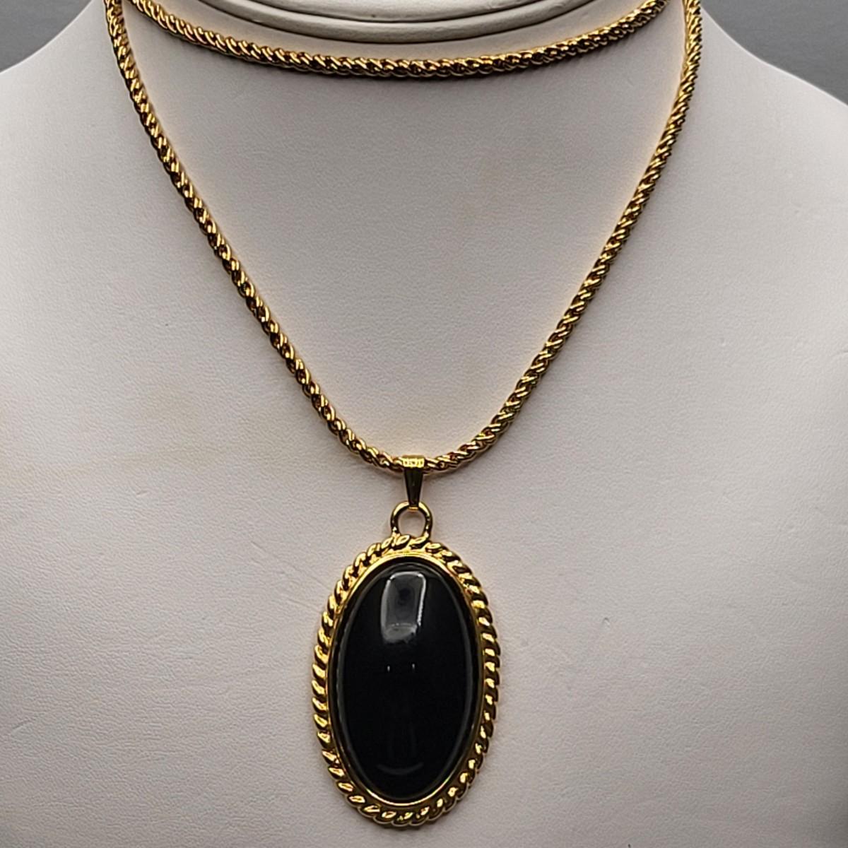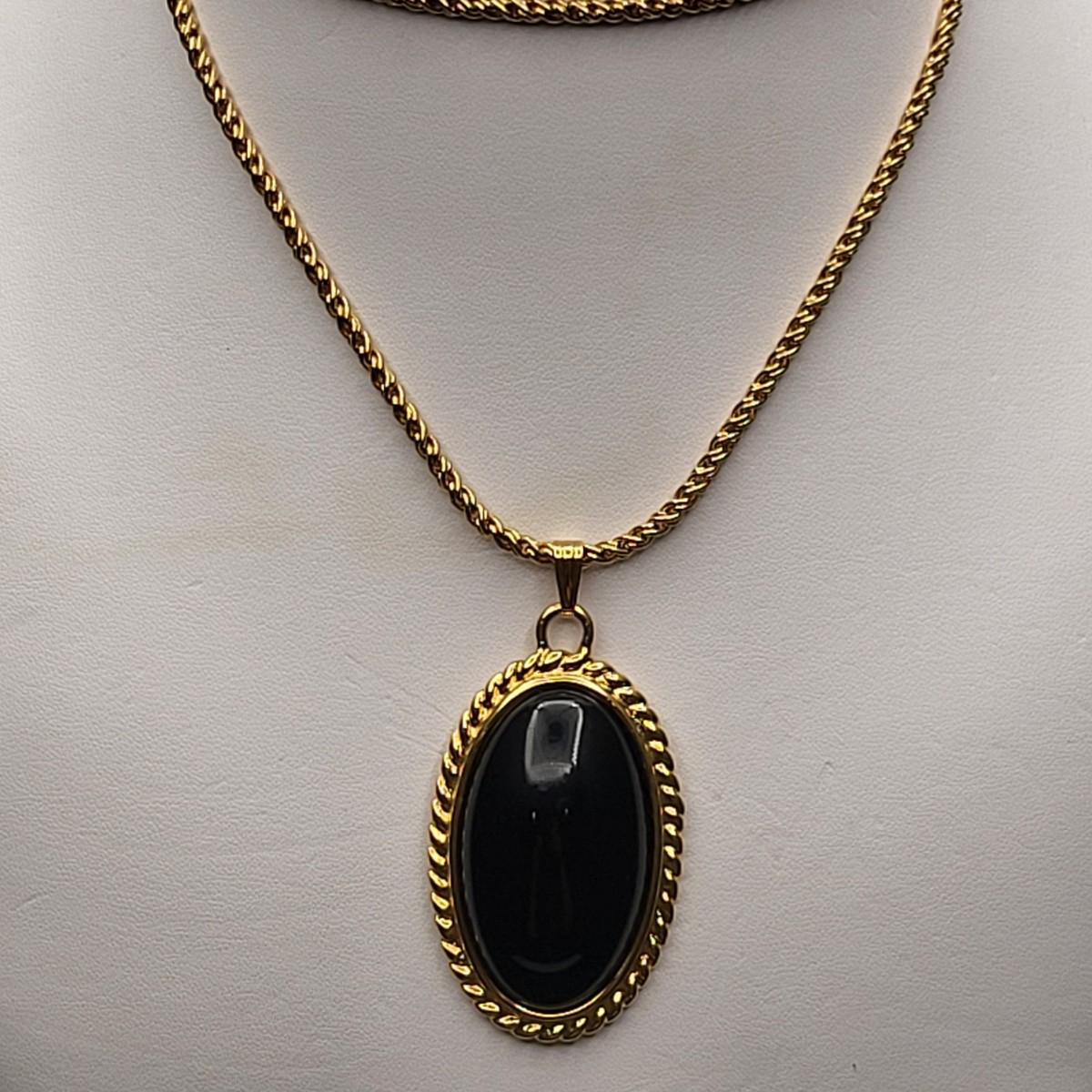 Gold tone and oval black thermoset inserts necklace and clip earring set by designer Monet. The unique twist chain is 27" long.