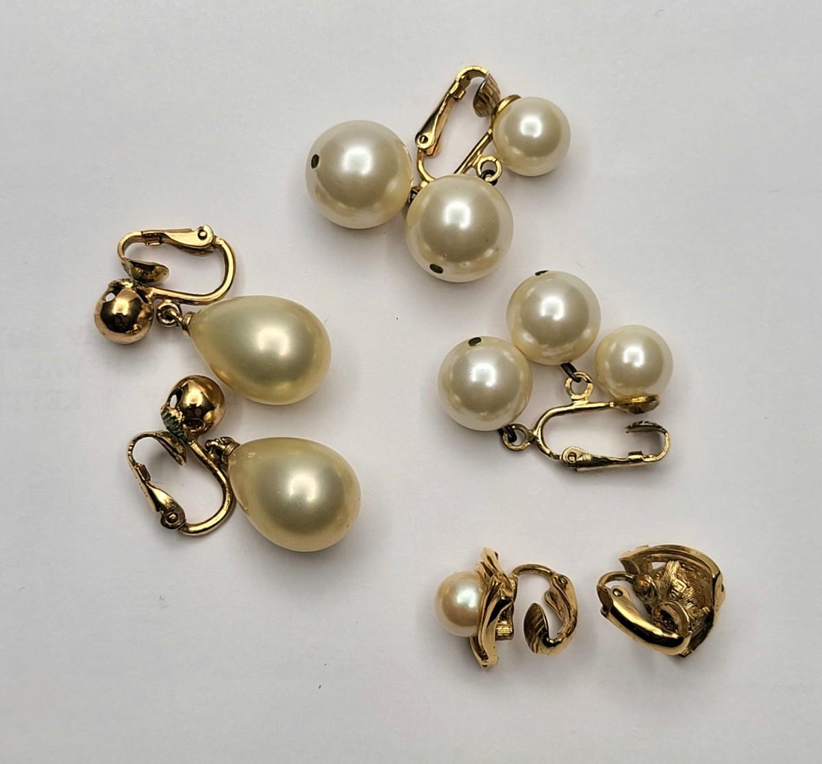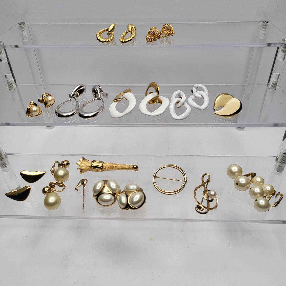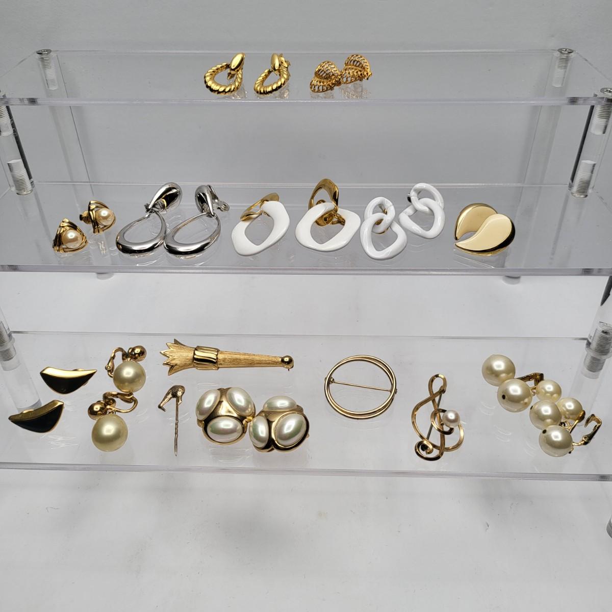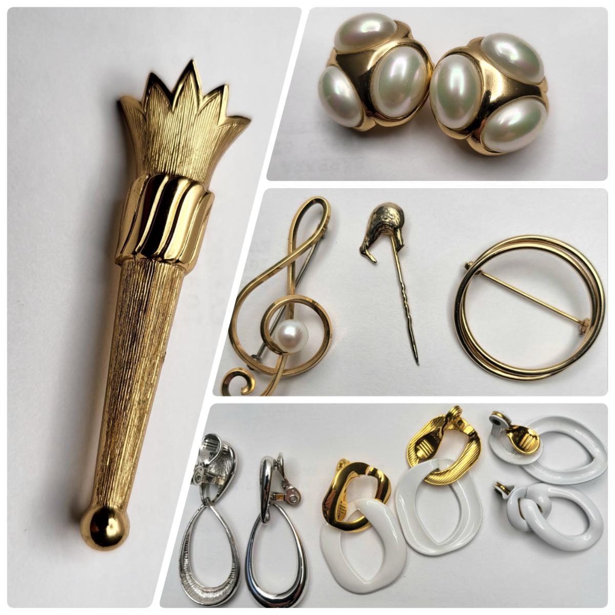 Clip earrings & pins. Monet clip earrings and gold tone brooch, Trifari, Christian Dior, Krementz and more. Gold filled circle and real pearl musical note pins, Krementz. Small kiwi stick twist pin. Looks like a marking is on pin part but cant make it out, gold? Faux pearl, enamel. Nice variety.