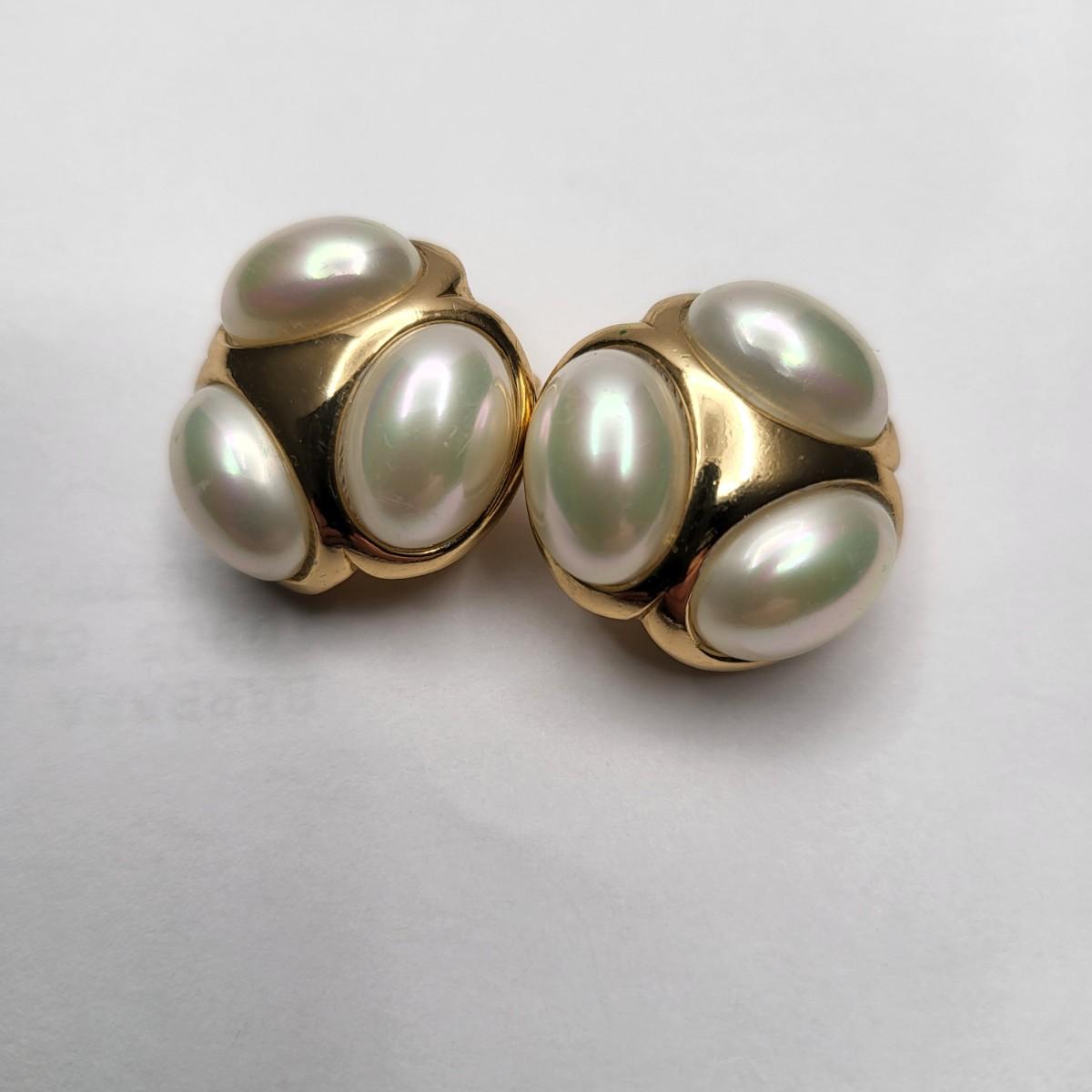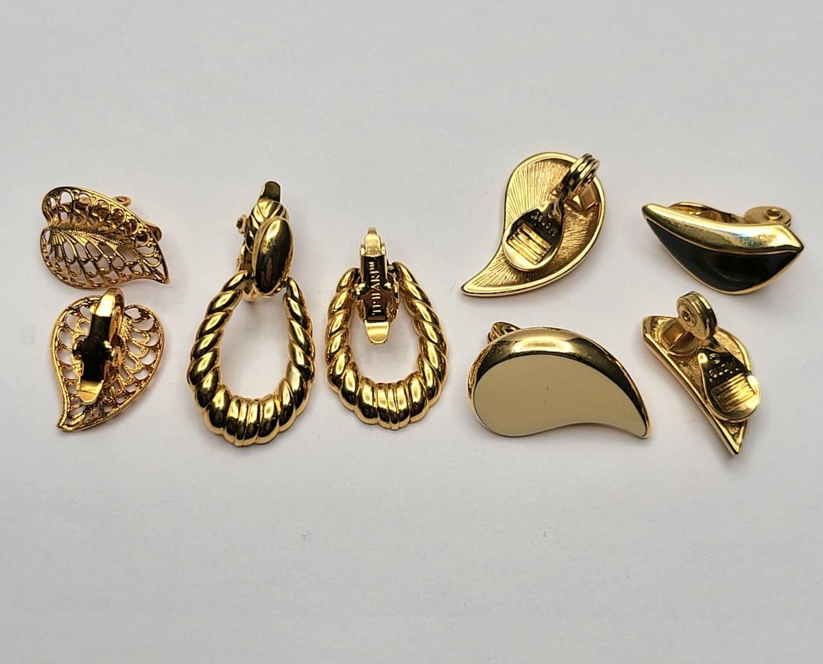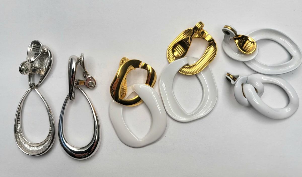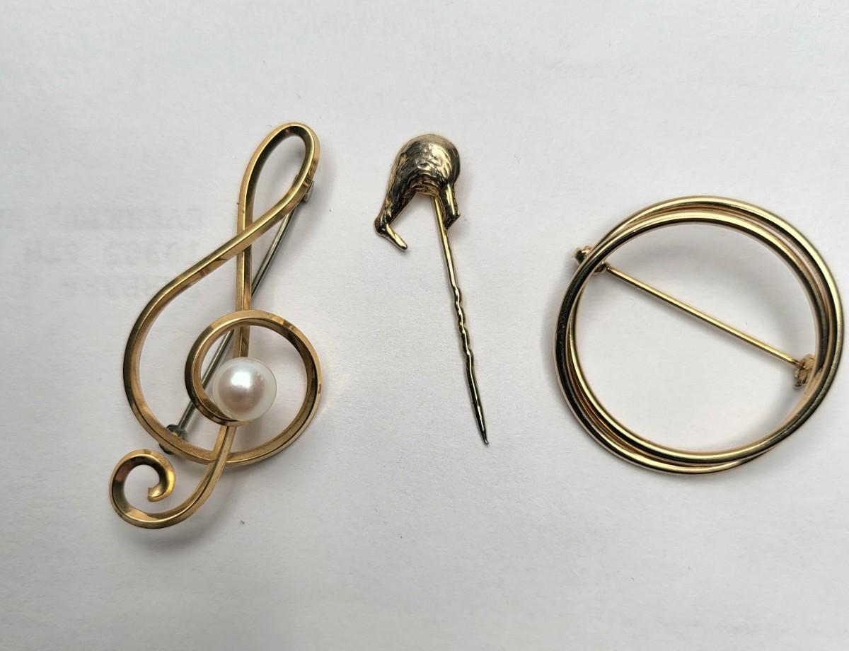 Clip earrings & pins. Monet clip earrings and gold tone brooch, Trifari, Christian Dior, Krementz and more. Gold filled circle and real pearl musical note pins, Krementz. Small kiwi stick twist pin. Looks like a marking is on pin part but cant make it out, gold? Faux pearl, enamel. Nice variety.