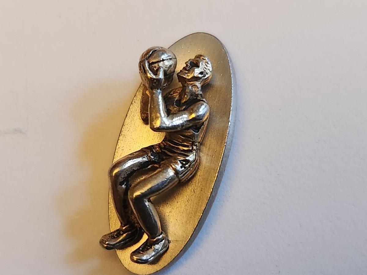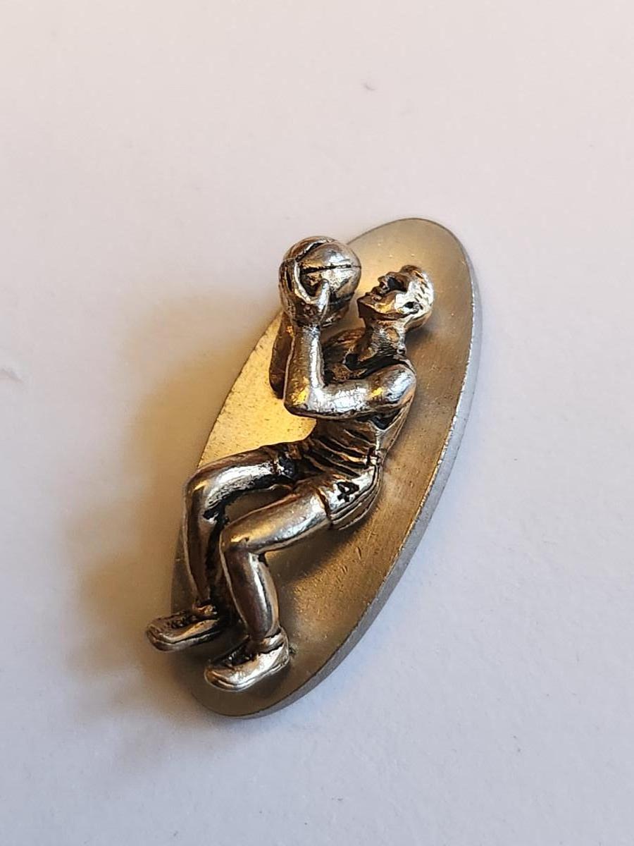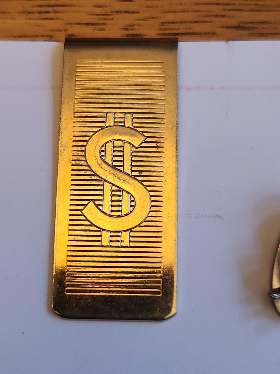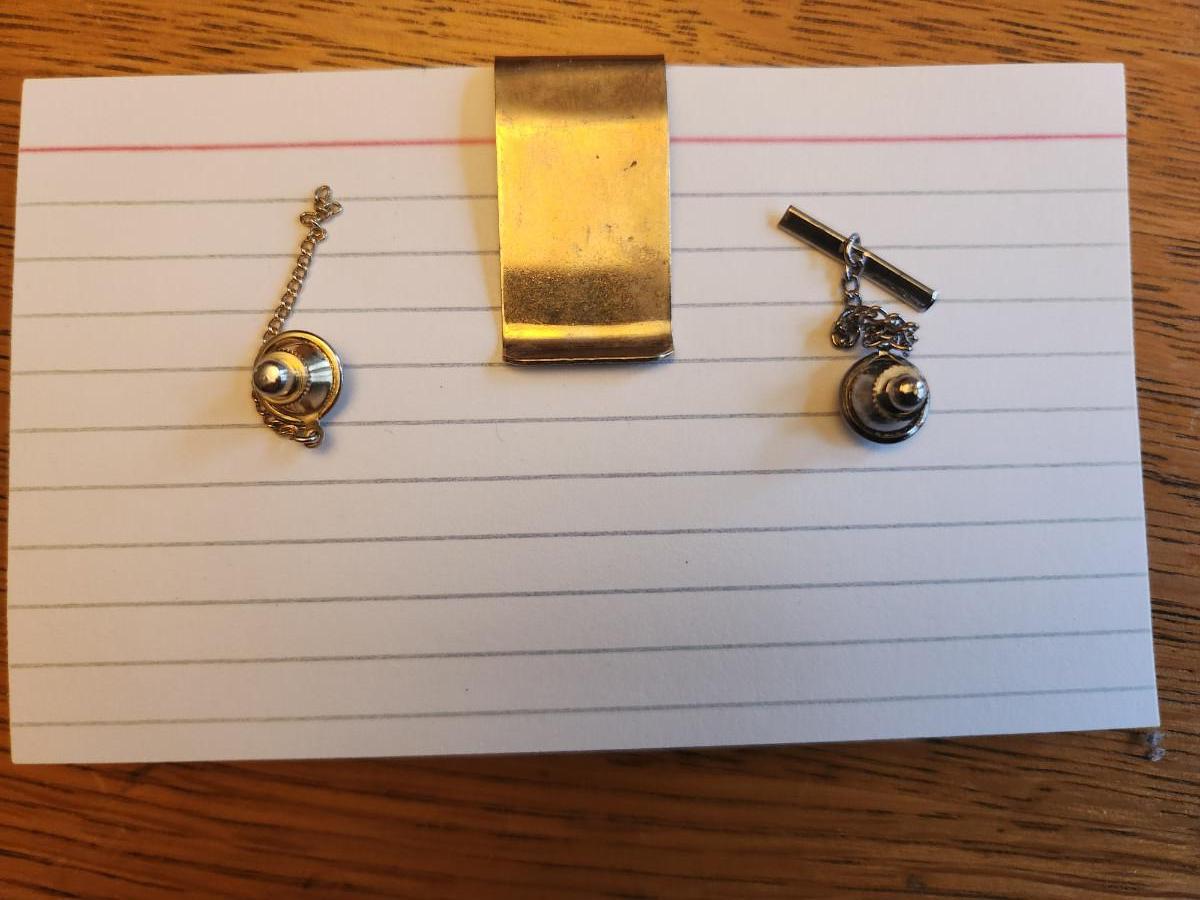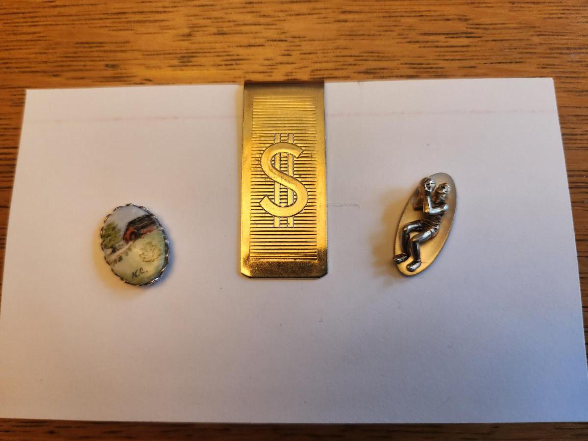 This auction lot is for a Collection of Tie Pins and Clips, The money clip is stylish with the dollar sign design. One of the tie clips is a basketball player and the other is a hand-painted barn scene.