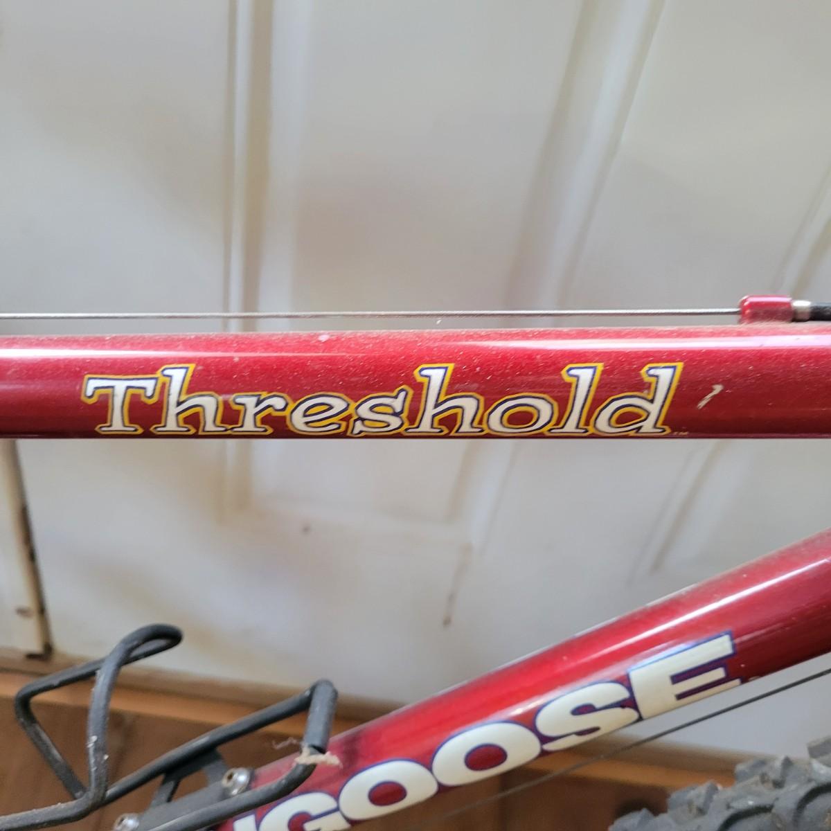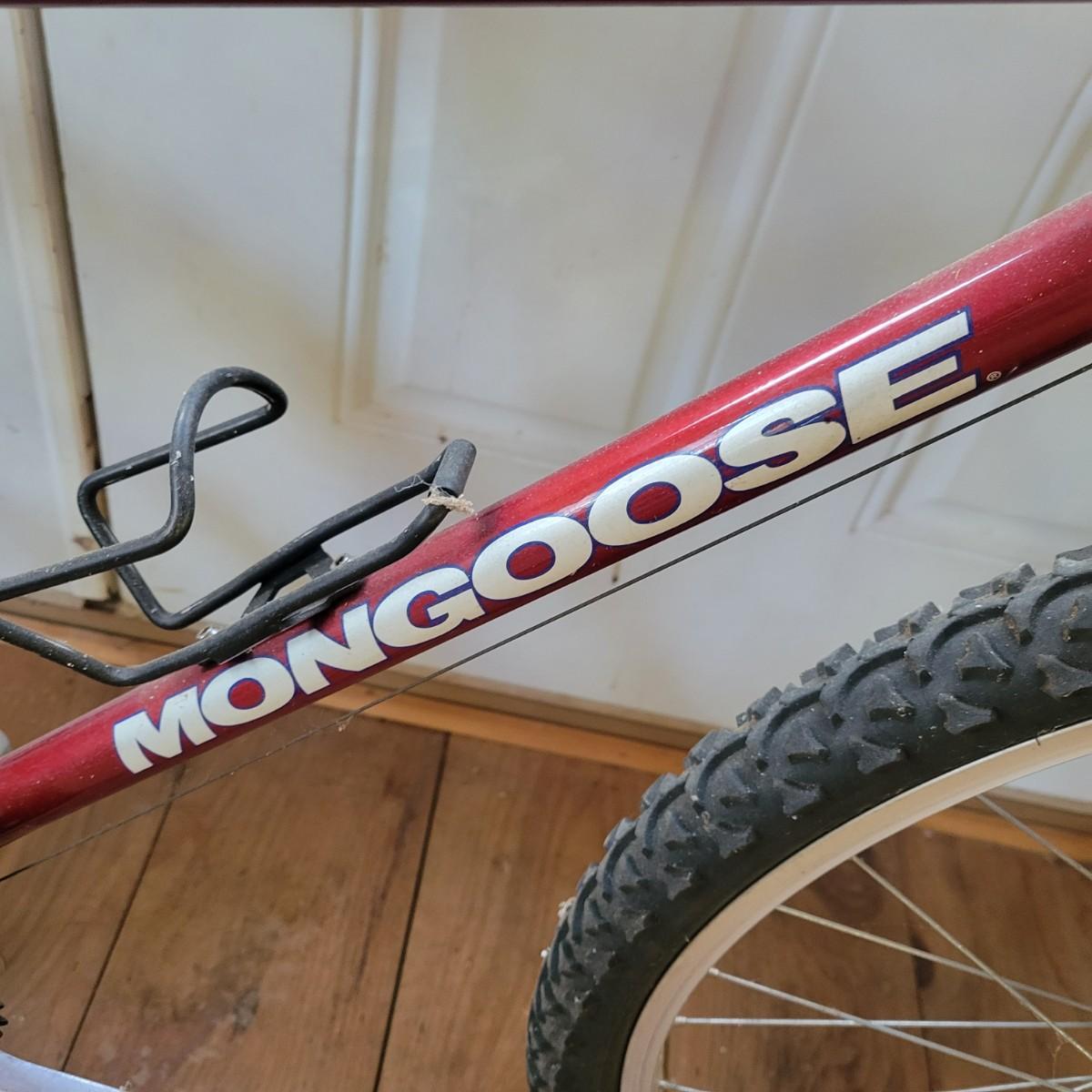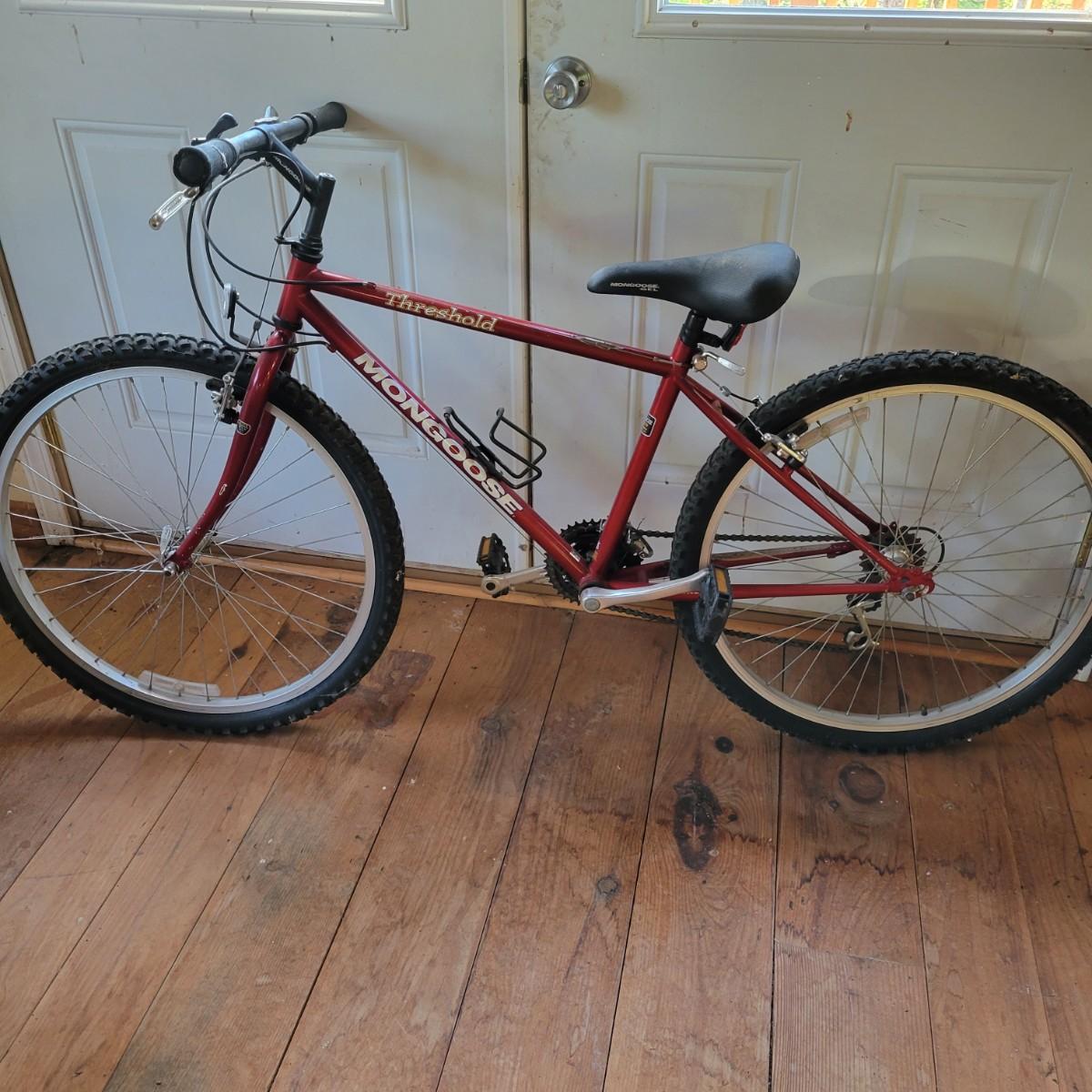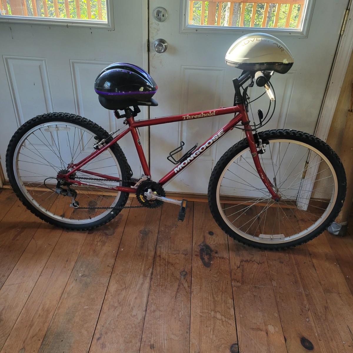 A Mongoose Threshold mountain bike with 26" wheels with 3 x 6 gearing. This bike features a steel frame with cantilever brakes with thumb shifting and has a 13.5 frame size. There is one notable rub mark on the frame and the tires are flat. Also included are two helmets, sizes are not marked. Local pickup only