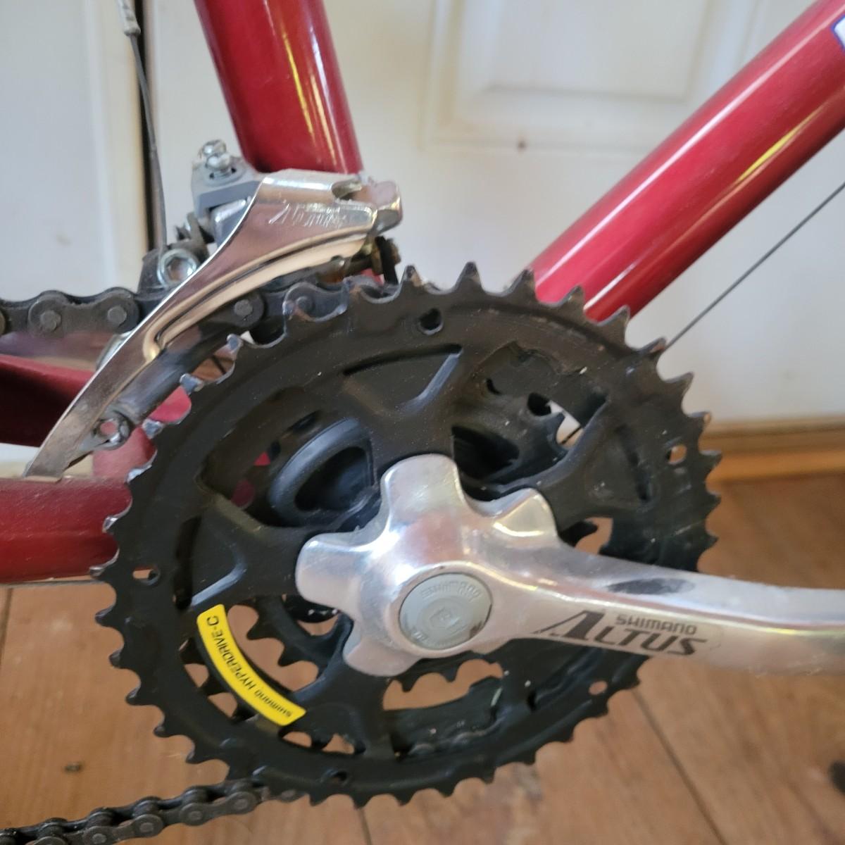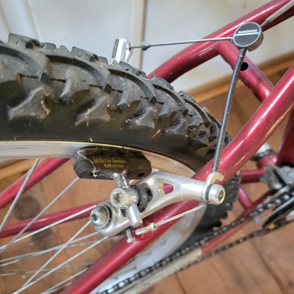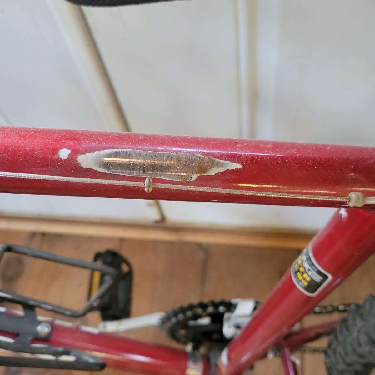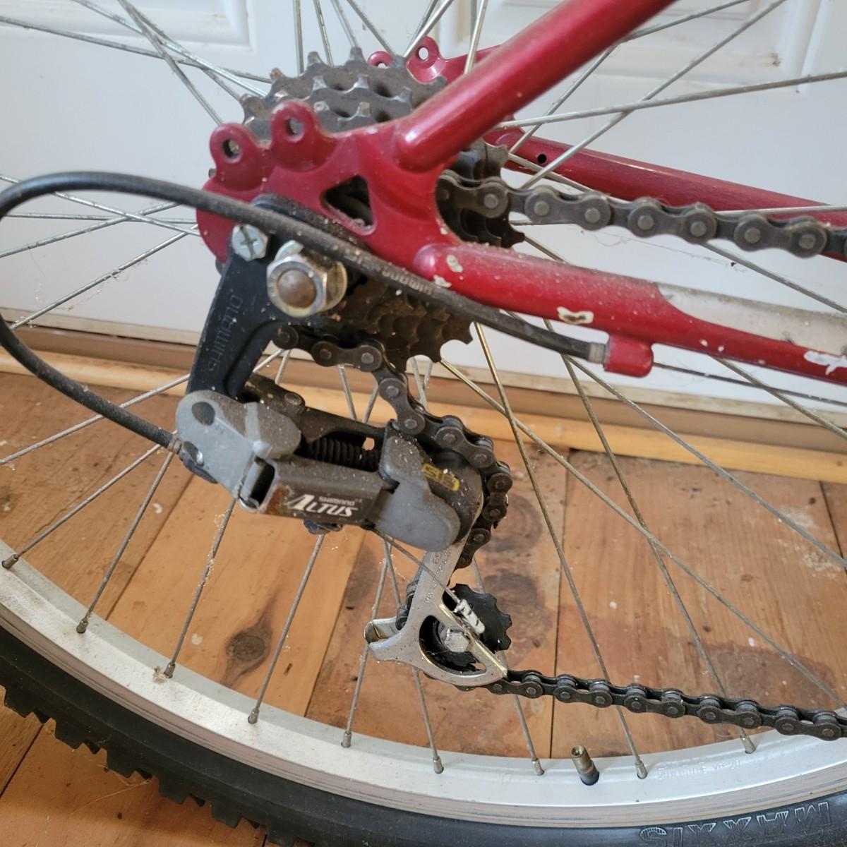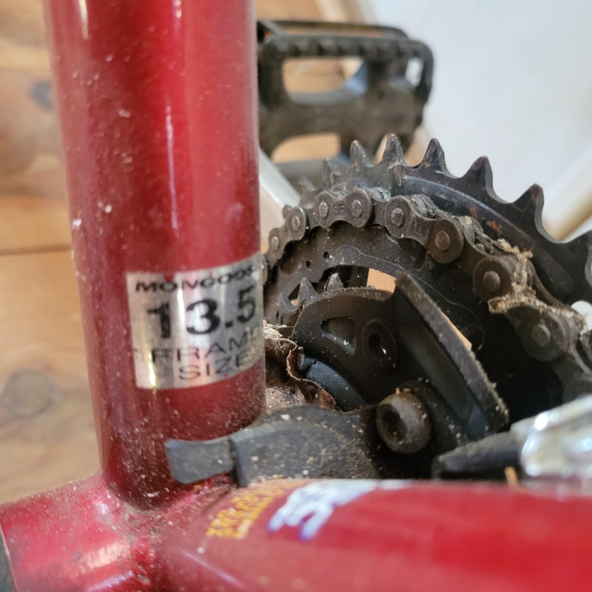 A Mongoose Threshold mountain bike with 26" wheels with 3 x 6 gearing. This bike features a steel frame with cantilever brakes with thumb shifting and has a 13.5 frame size. There is one notable rub mark on the frame and the tires are flat. Also included are two helmets, sizes are not marked. Local pickup only