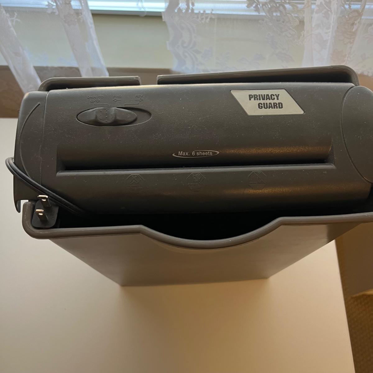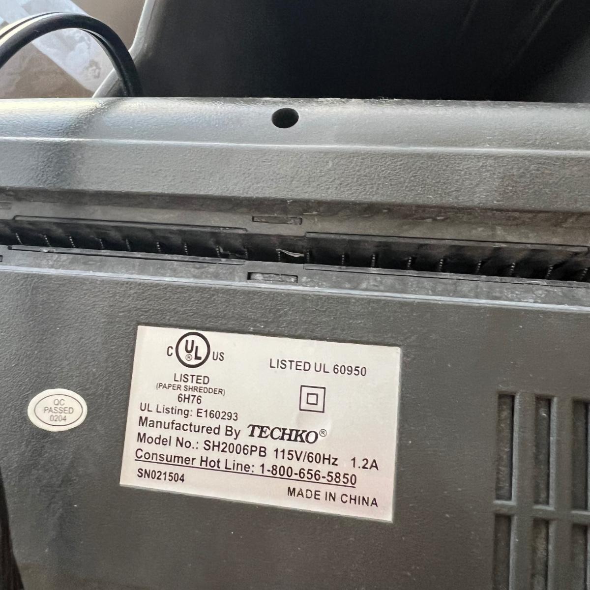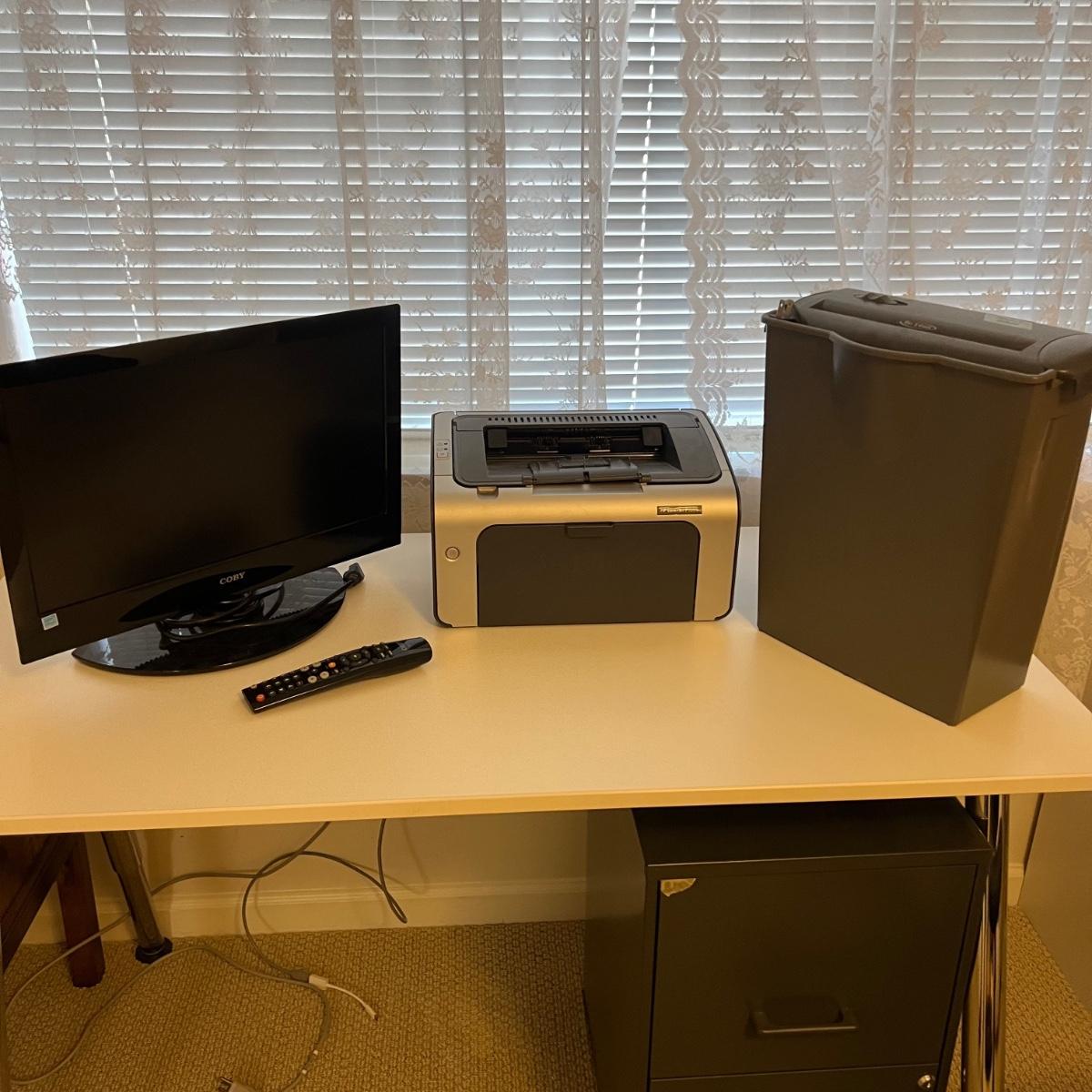Coby 19" TV also able to function as a monitor measures 18” x 7” (base) x 12”H. The unit comes with a remote control. HP LaserJet P1006 printer measures 14” x 8.75” x 8”H. The Techko shredder measures 12” x 6” x 15”H. All equipment powered on when plugged in.