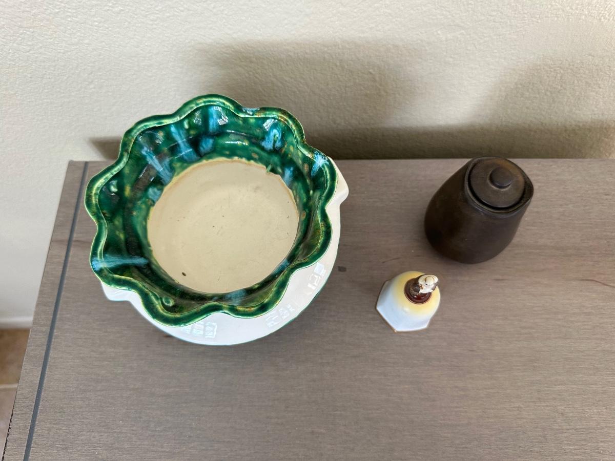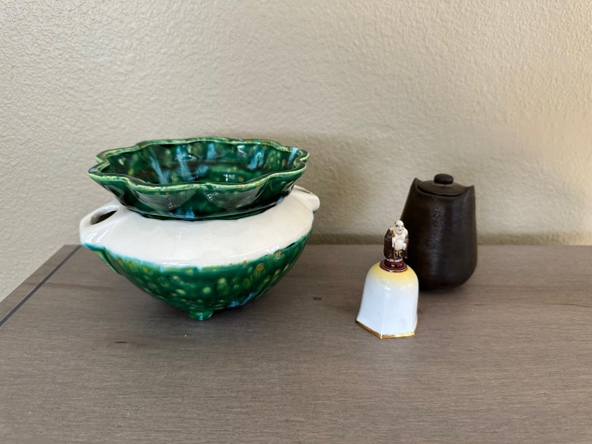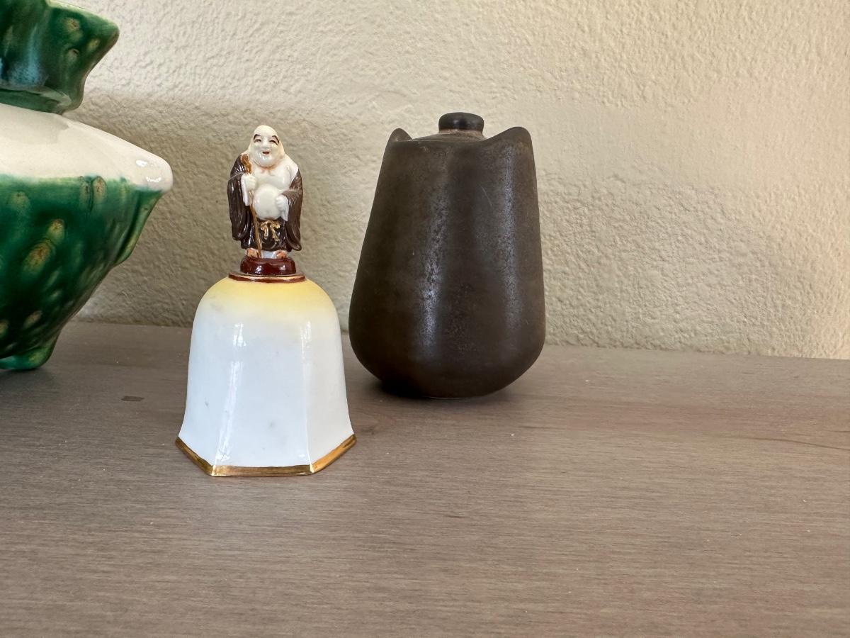 MONK PORCELAIN BELL, CLAY CONTAINER WITH LID AND A CERAMIC BOWL WITHIN A BOWL