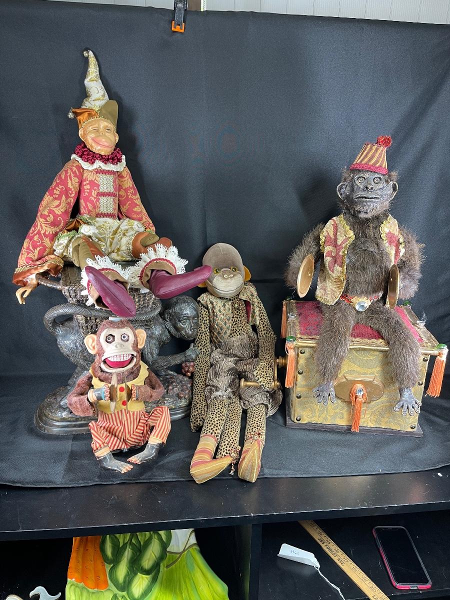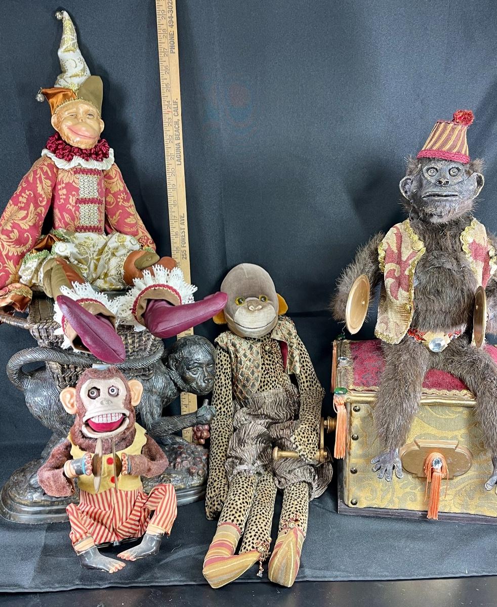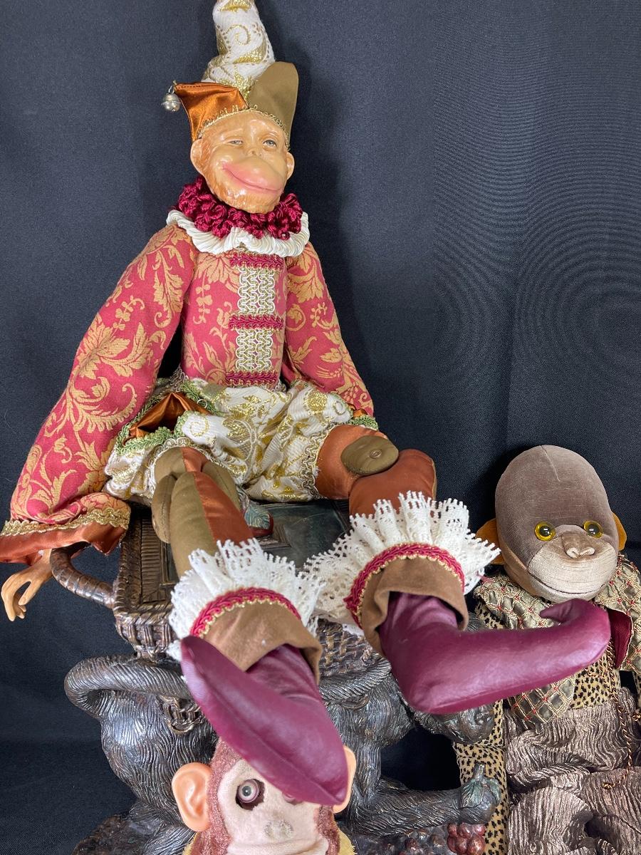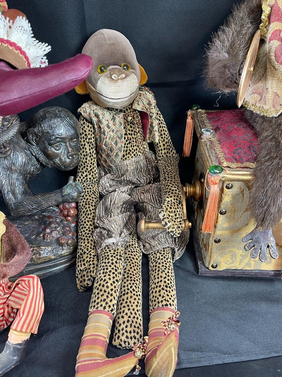 Mixed lot of monkeys. Wayne Kleski, Jolly Chimp, a bronze monkey statue basket, a doll, and a music box. See photos.