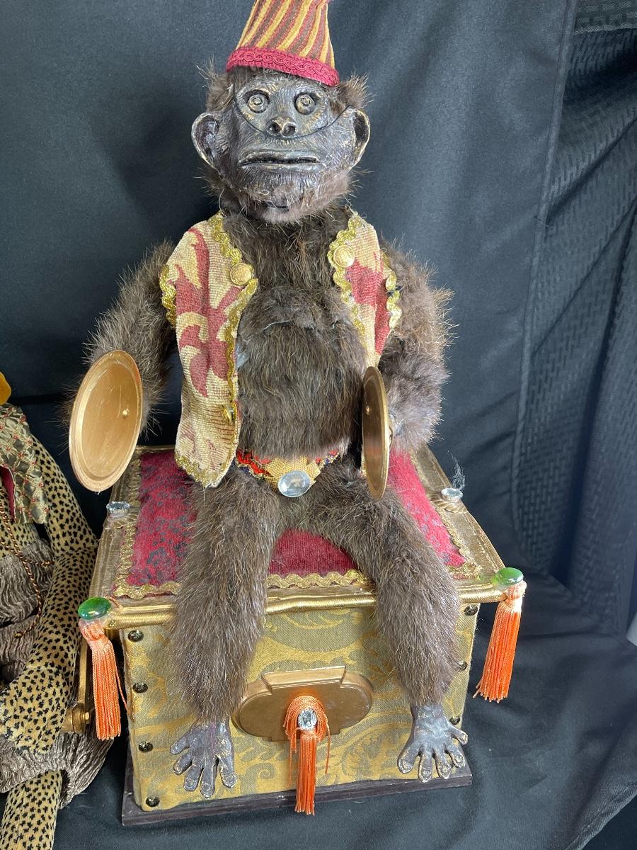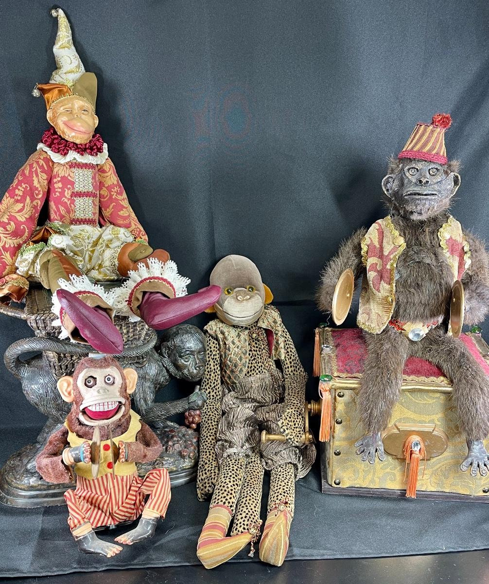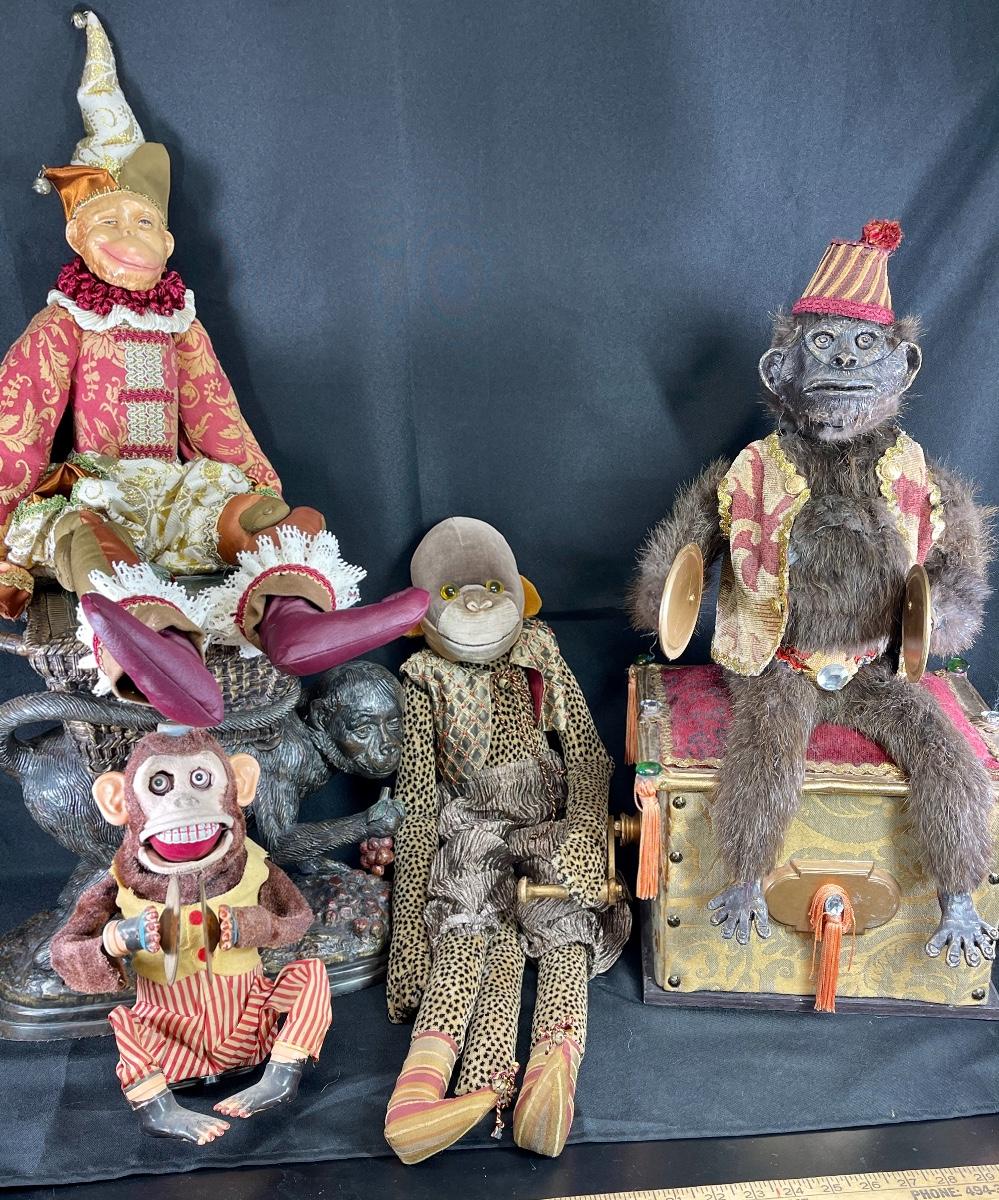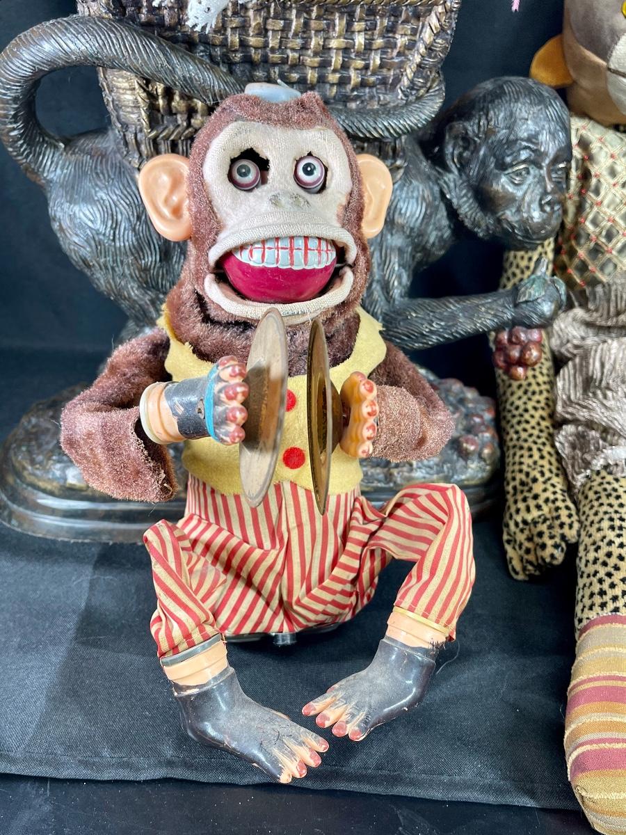 Mixed lot of monkeys. Wayne Kleski, Jolly Chimp, a bronze monkey statue basket, a doll, and a music box. See photos.