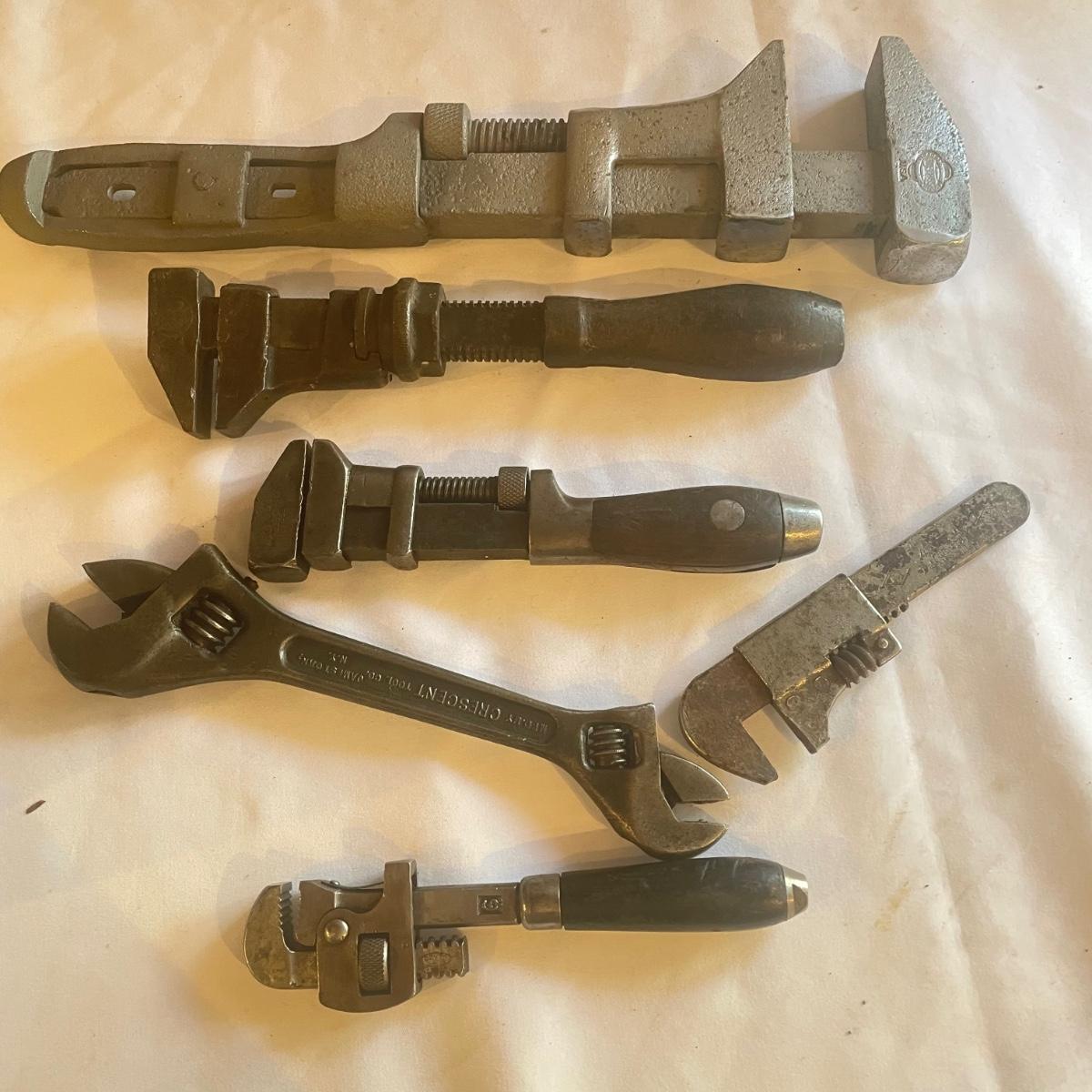 Five vintage adjustable monkey wrenches here that include Pexto, L & N, Under L Coes and more. Also included is an original Crescent wrench.