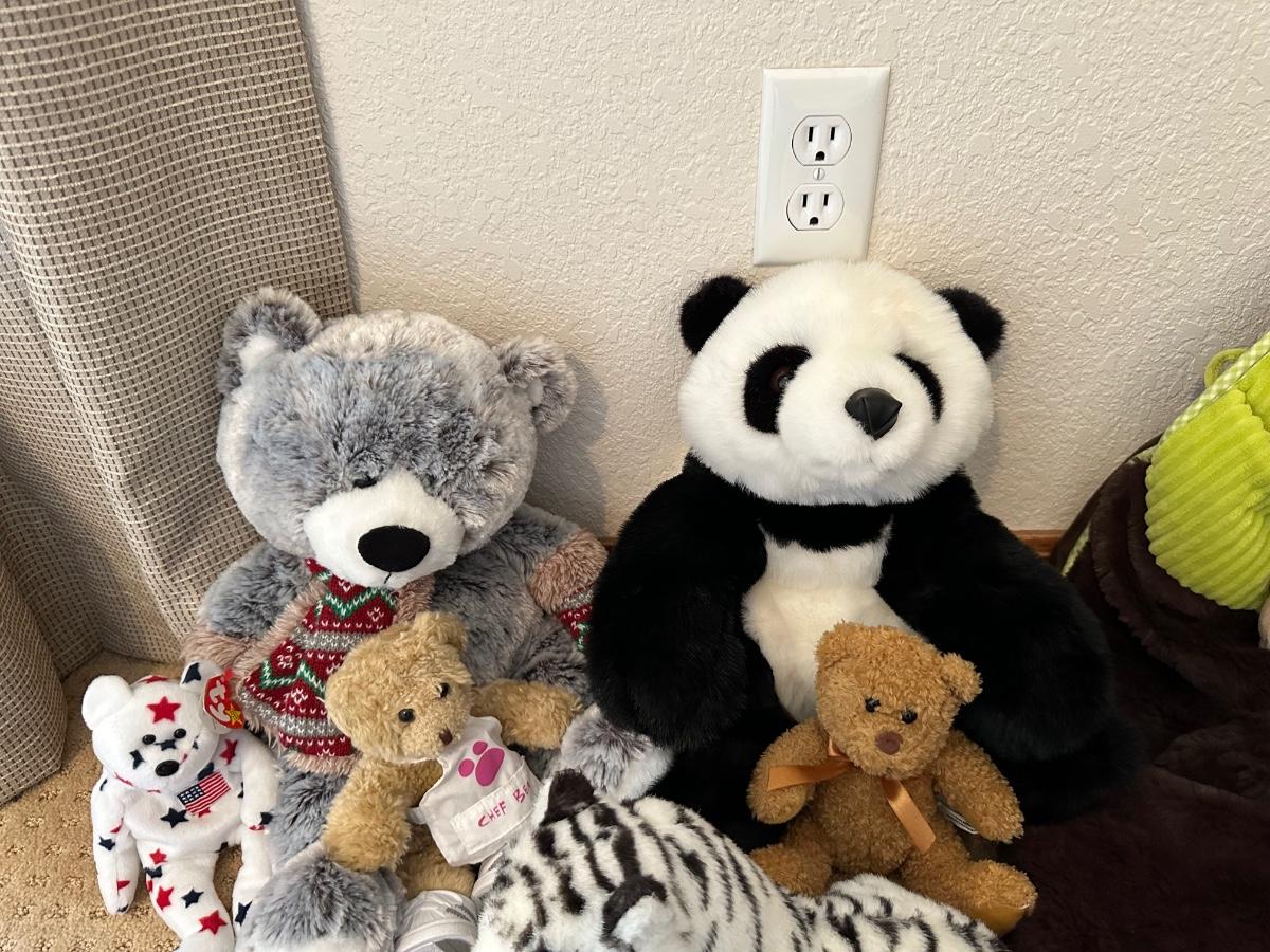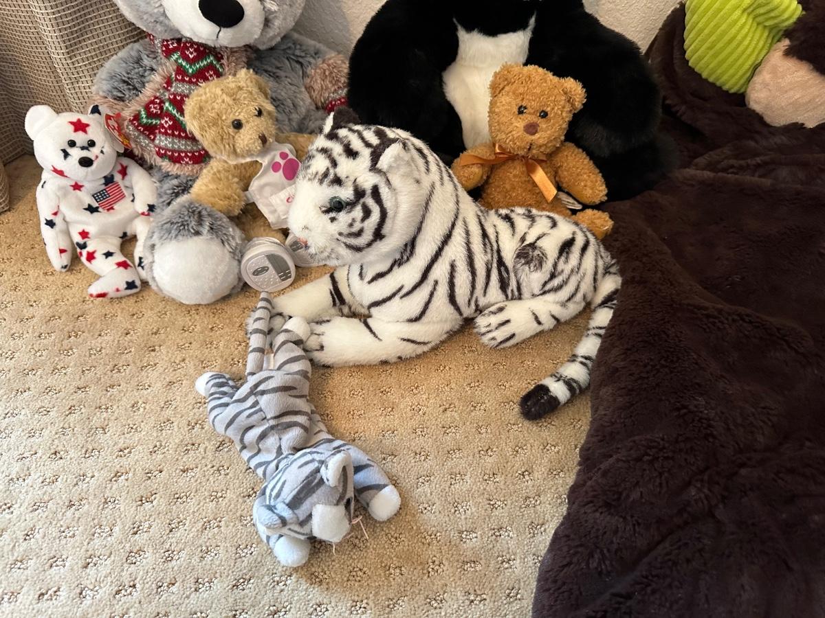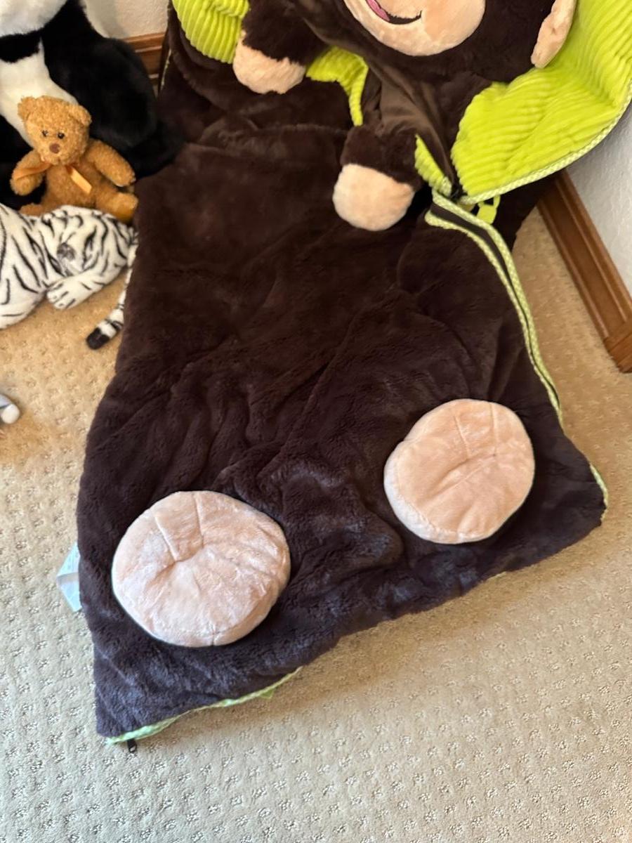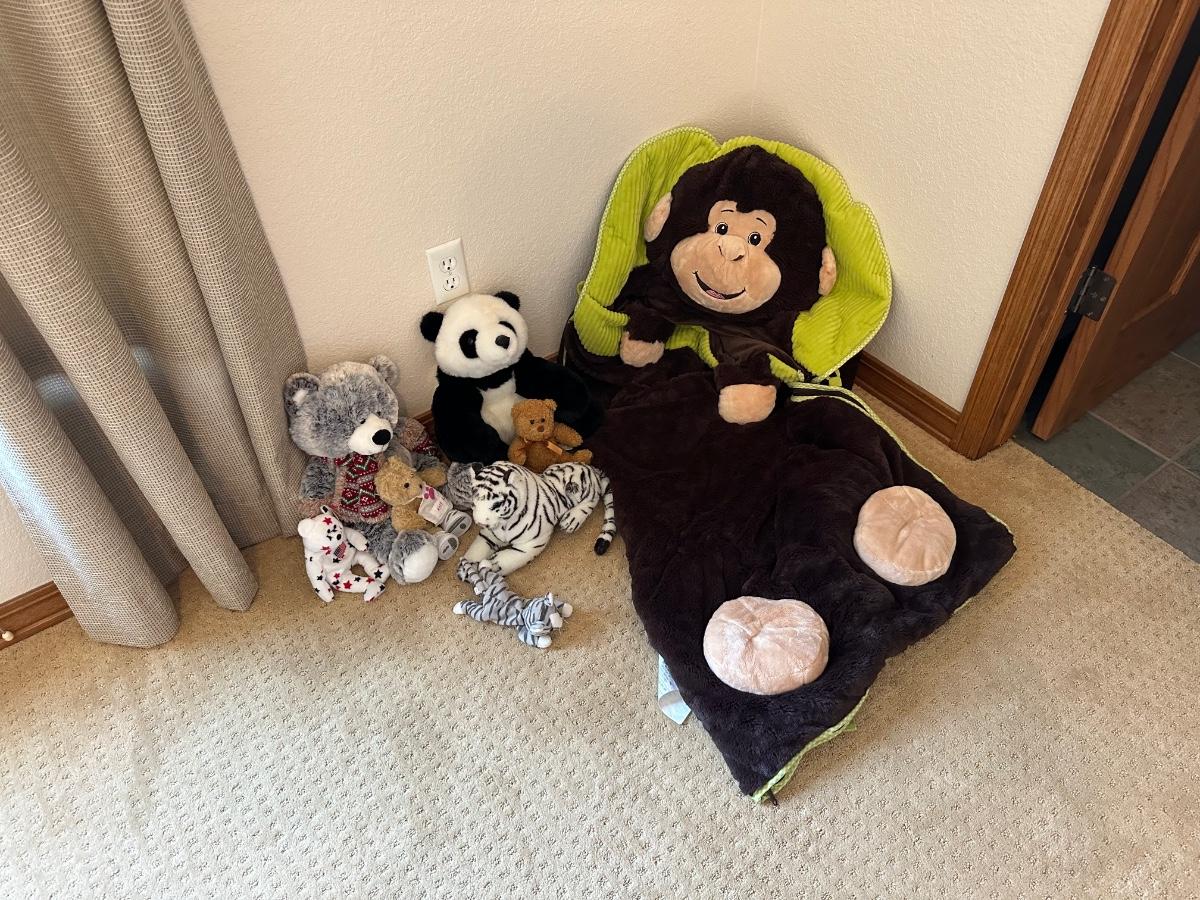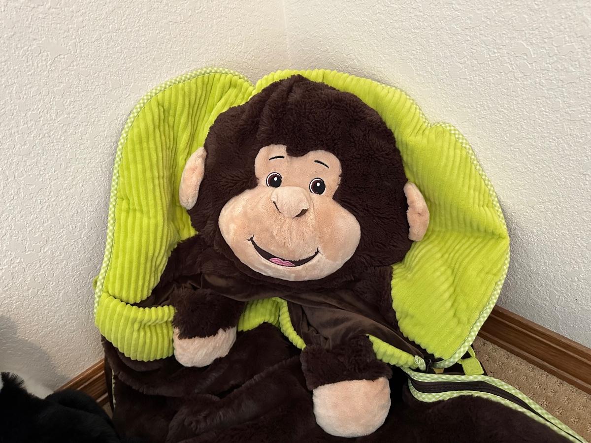 MONKEY SLEEPING BAG AND SEVERAL PLUSH ANIMALS