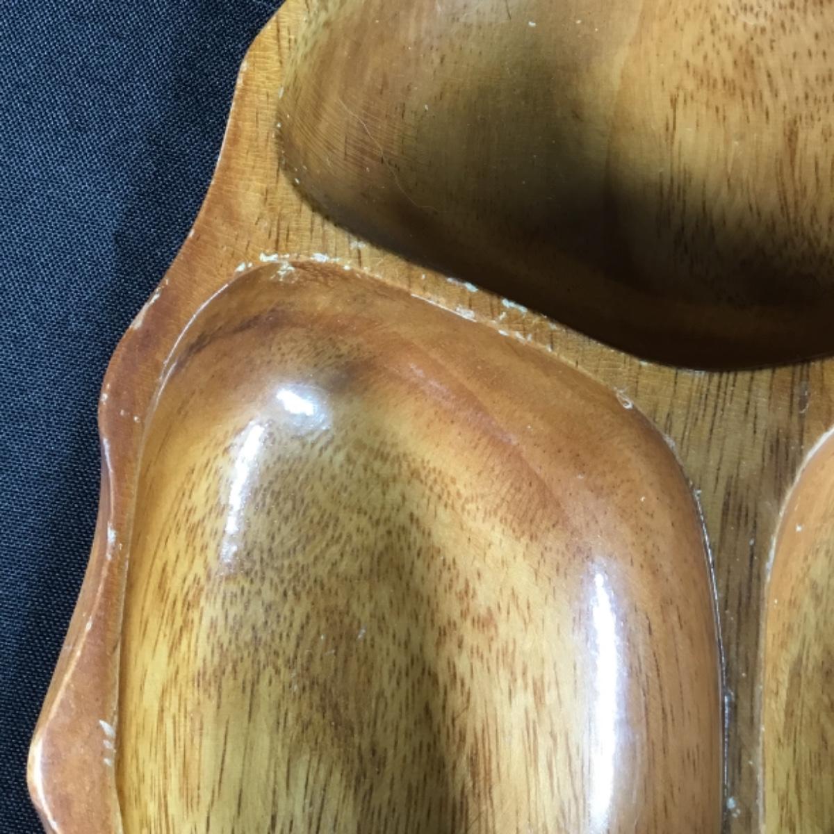 Up for auction is a three compartment Monkey-pod Wood divided bowl. It is used and has some scratches; see pictures.
