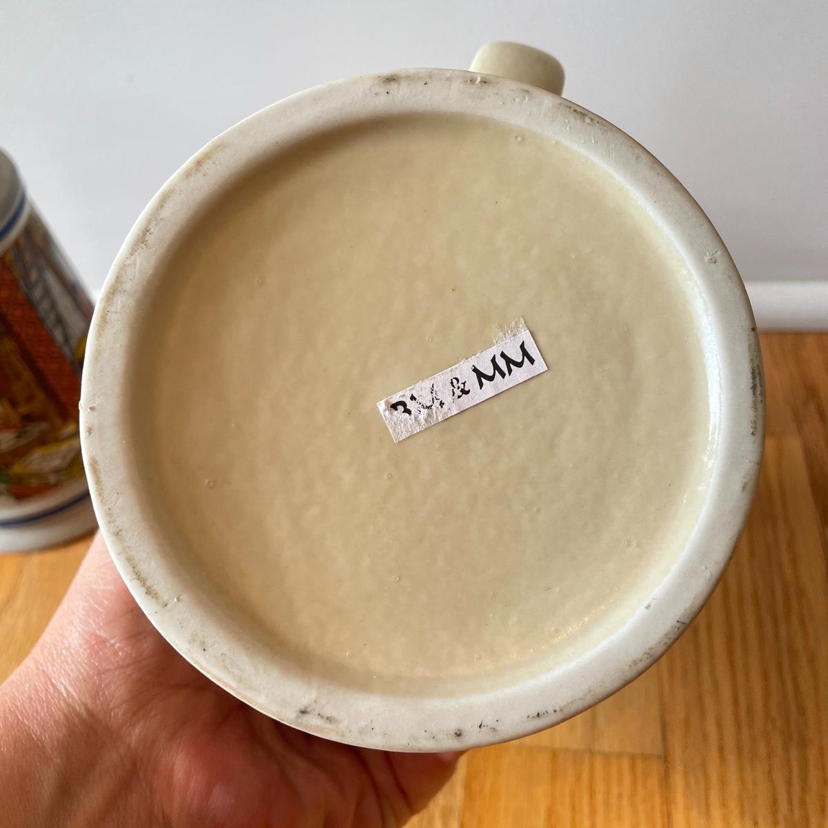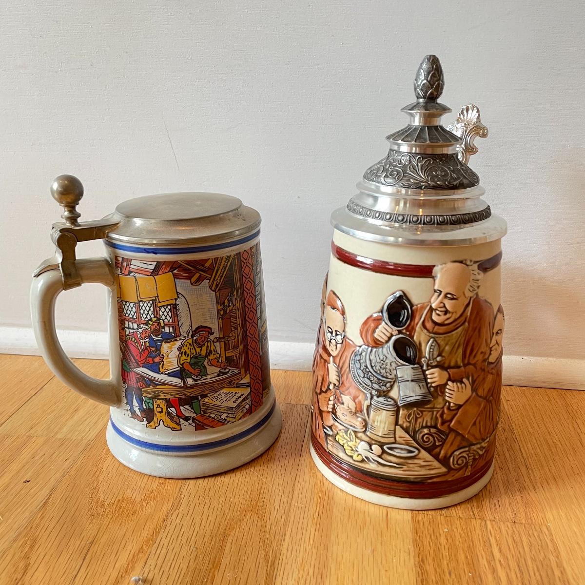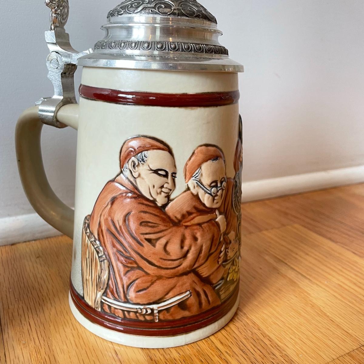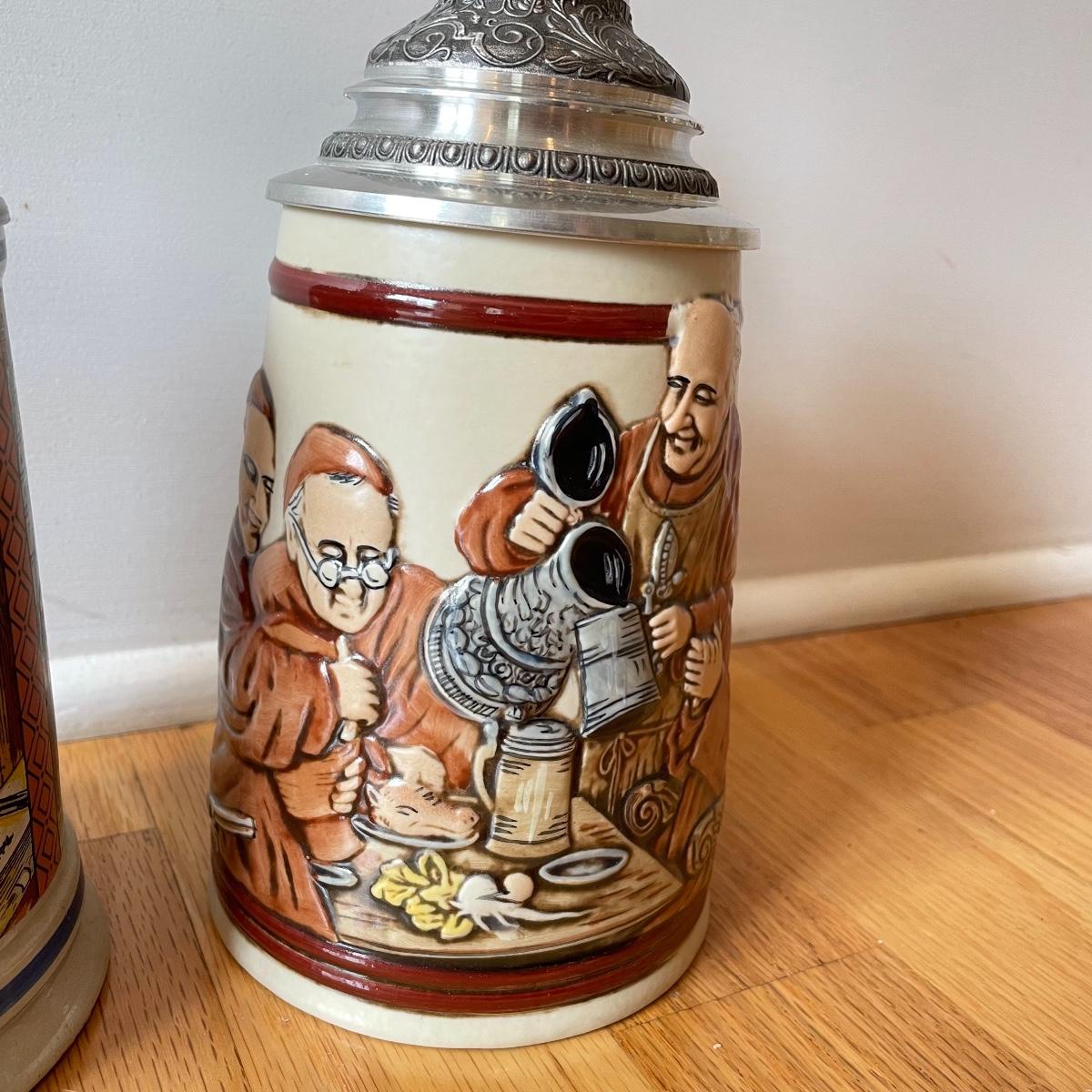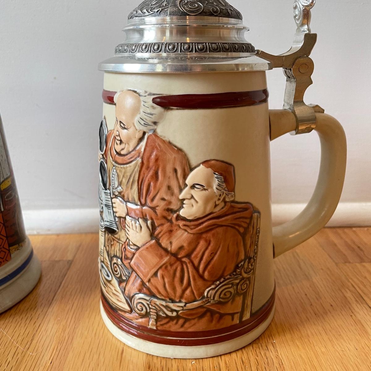 Two ceramic steins. The 9” tall textured Monk stein comes with a hand written note stating it was purchased in 1999 in Slovakia. The other stein has a number on its hinge and what appears to be a “6” on the bottom. Shipping available.