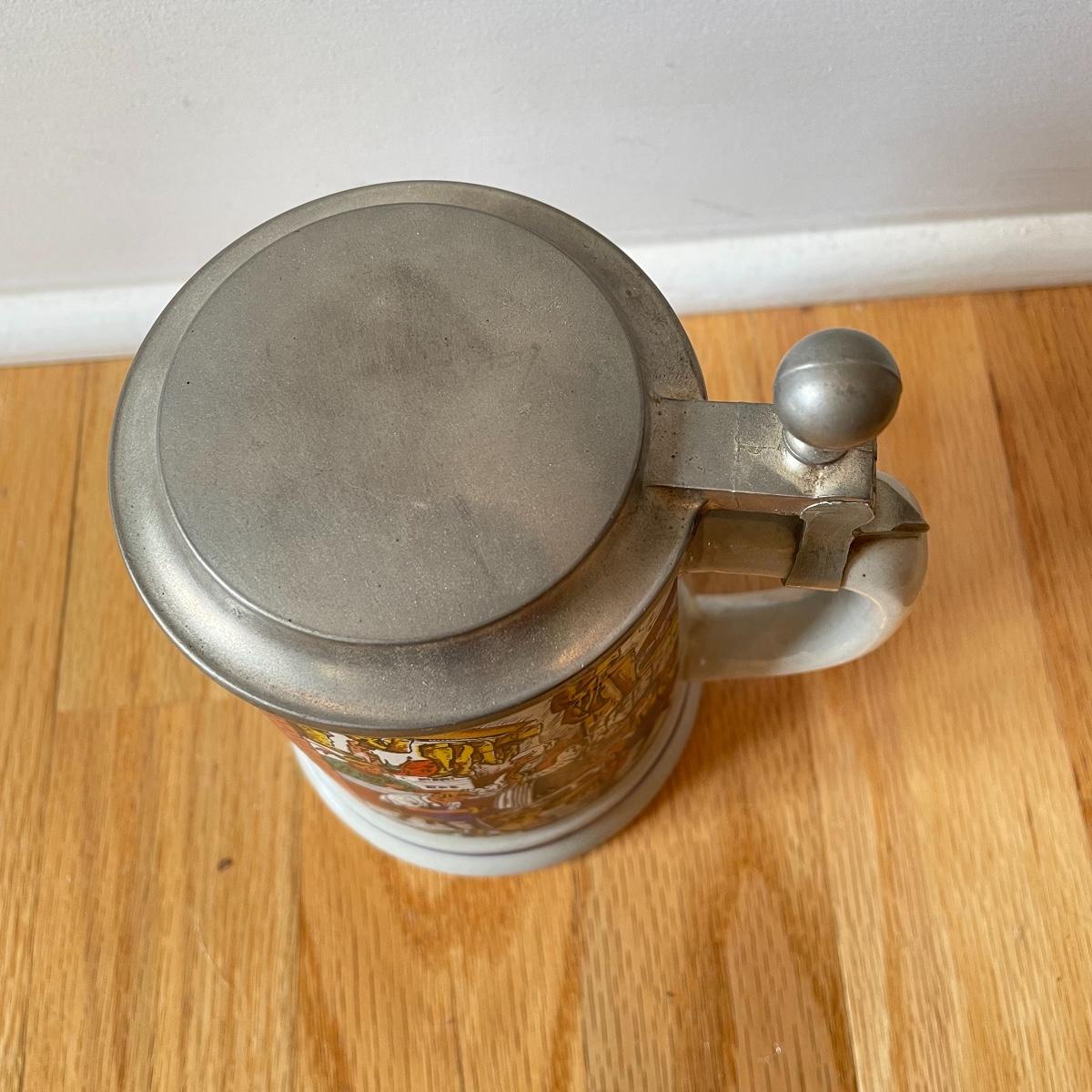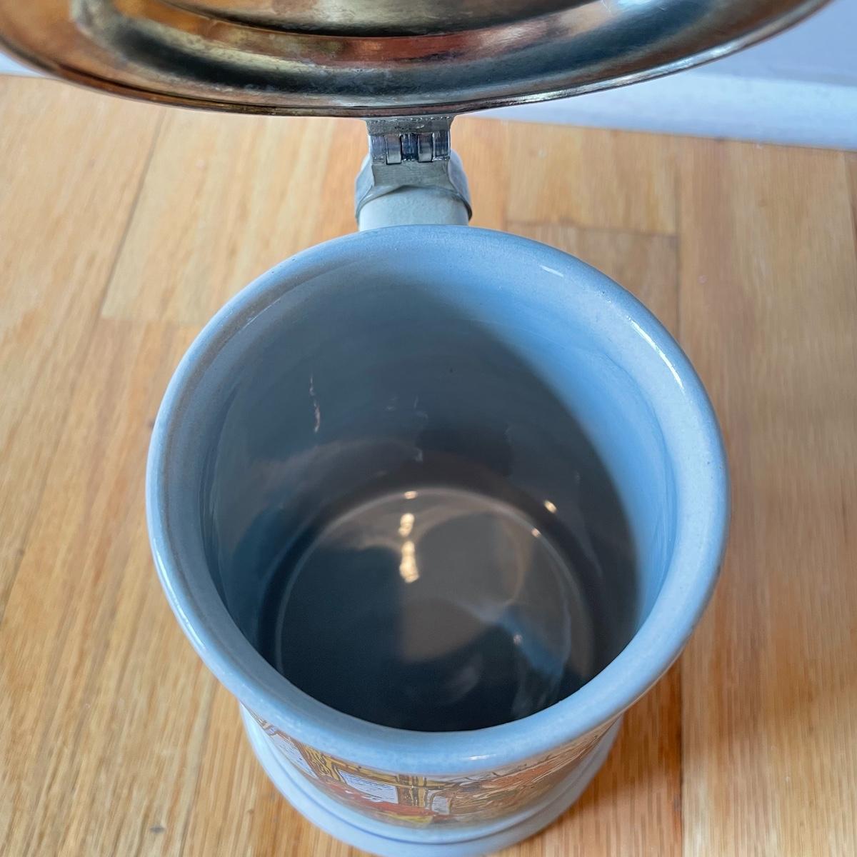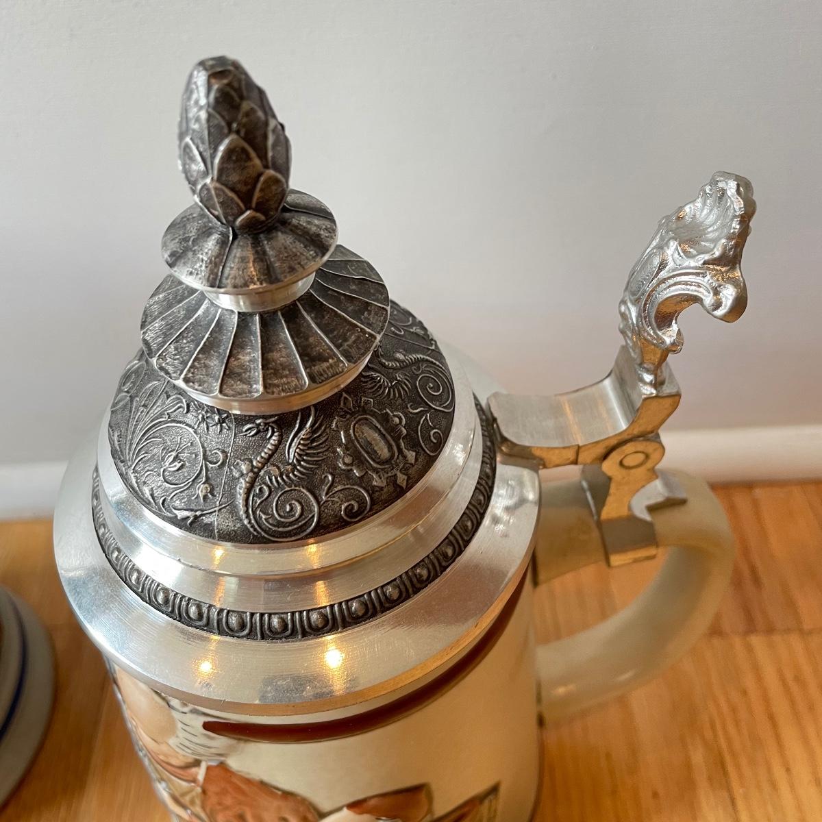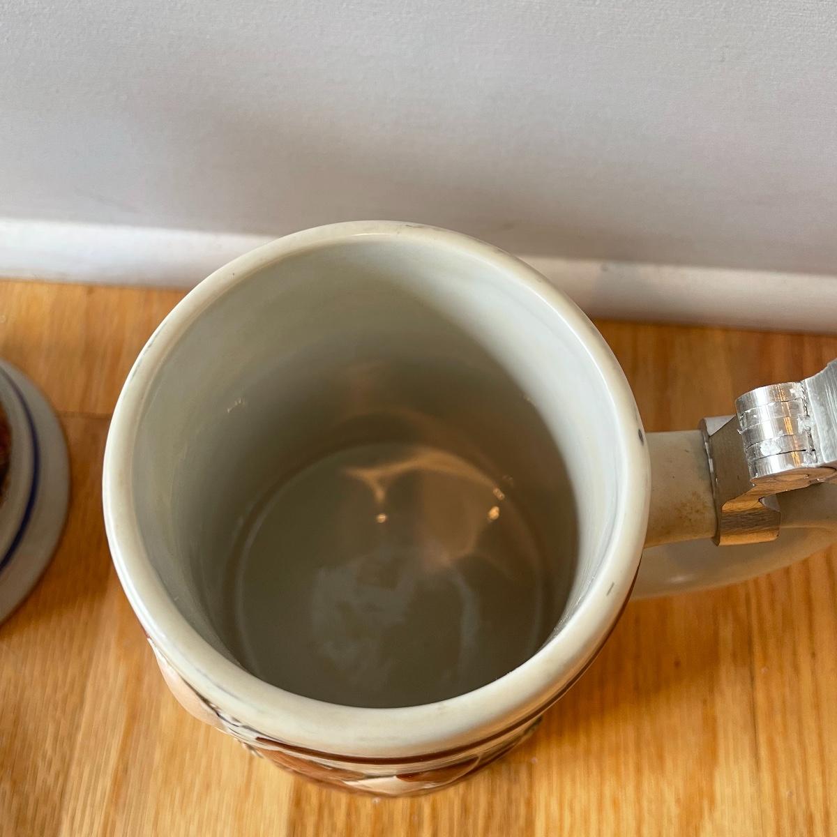 Two ceramic steins. The 9” tall textured Monk stein comes with a hand written note stating it was purchased in 1999 in Slovakia. The other stein has a number on its hinge and what appears to be a “6” on the bottom. Shipping available.
