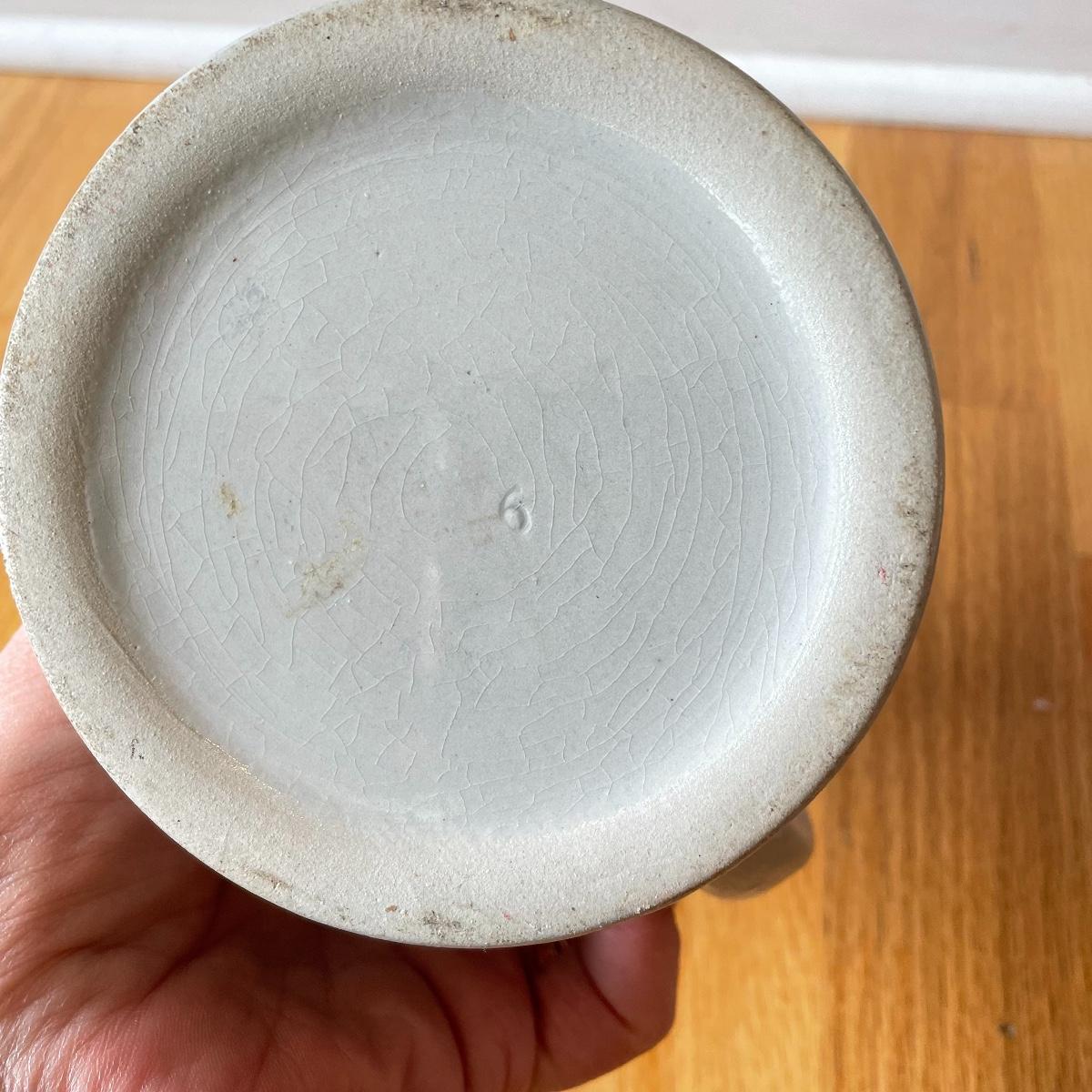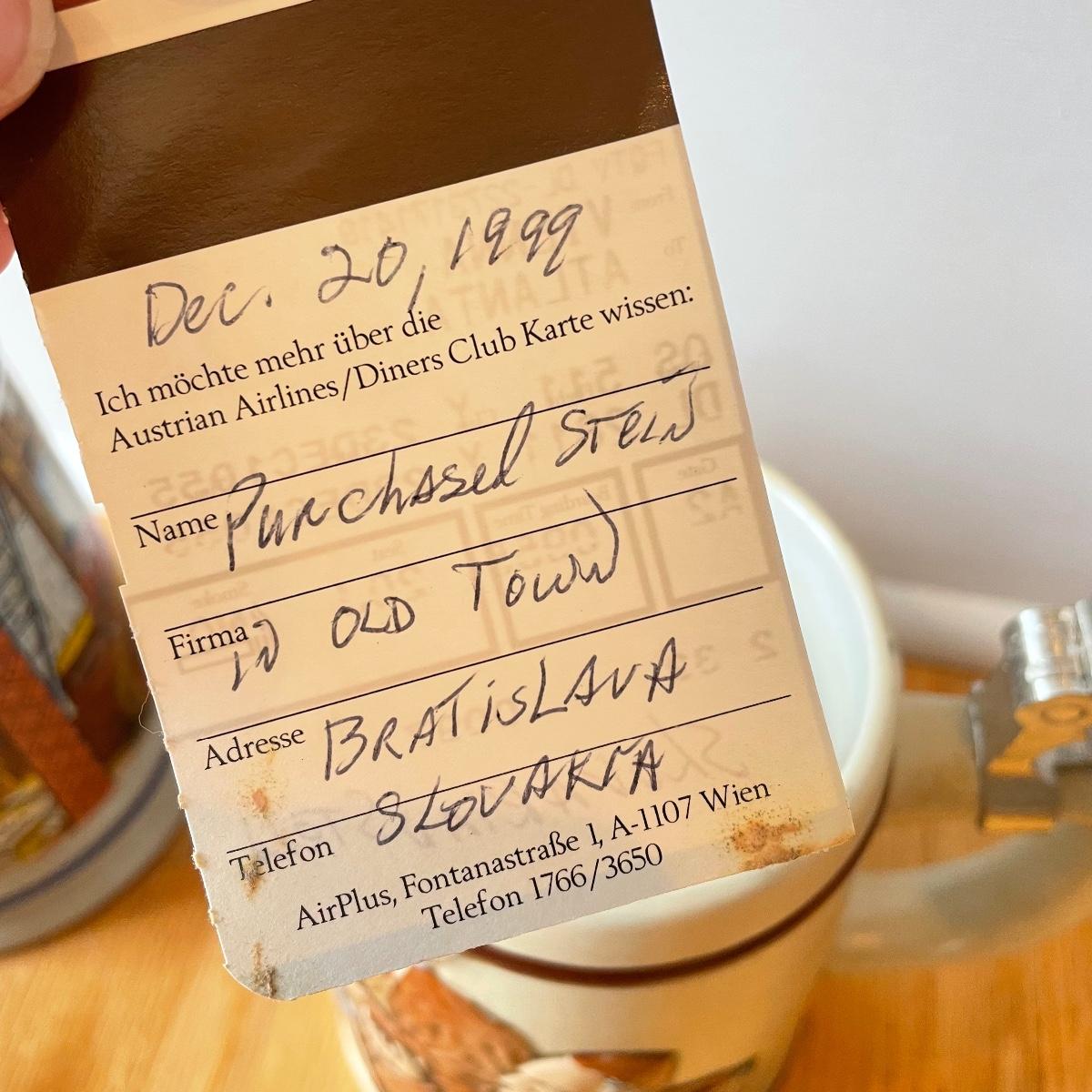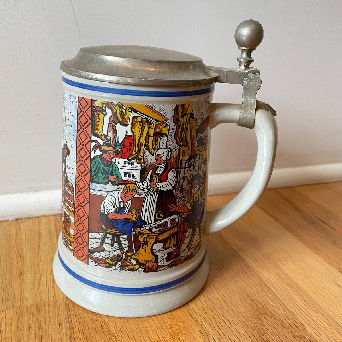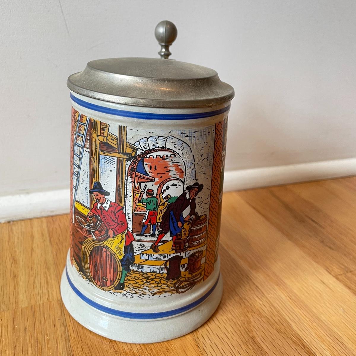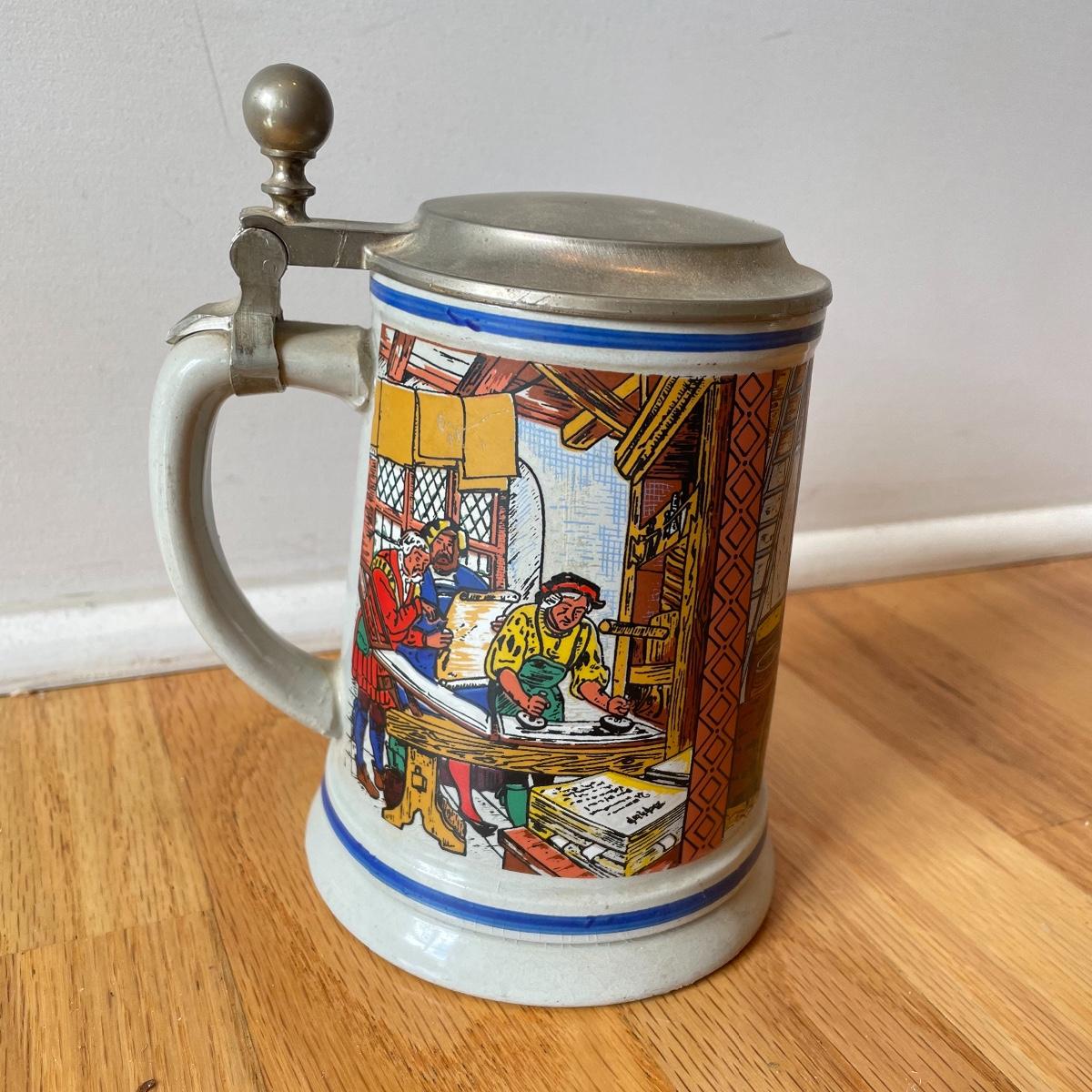 Two ceramic steins. The 9” tall textured Monk stein comes with a hand written note stating it was purchased in 1999 in Slovakia. The other stein has a number on its hinge and what appears to be a “6” on the bottom. Shipping available.
