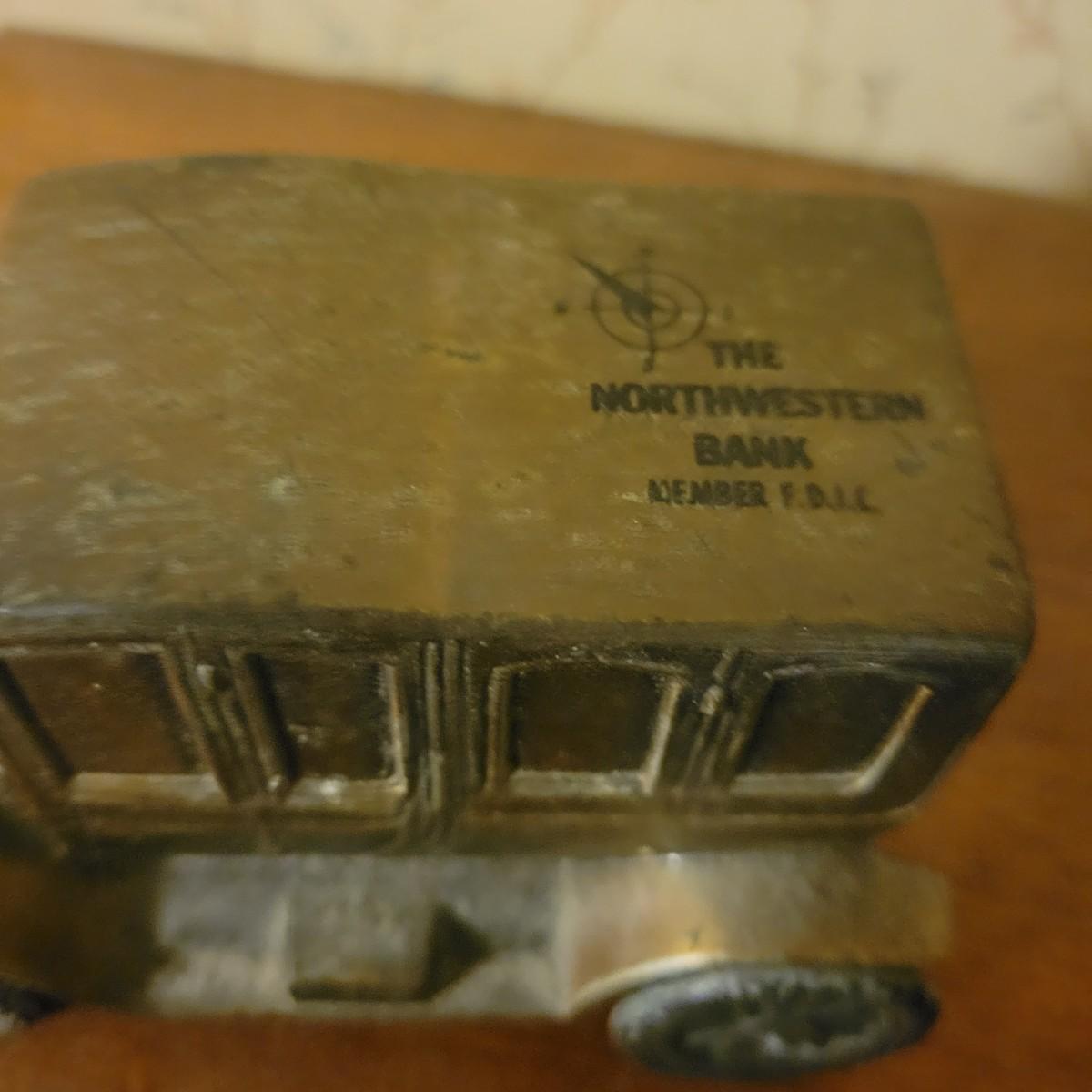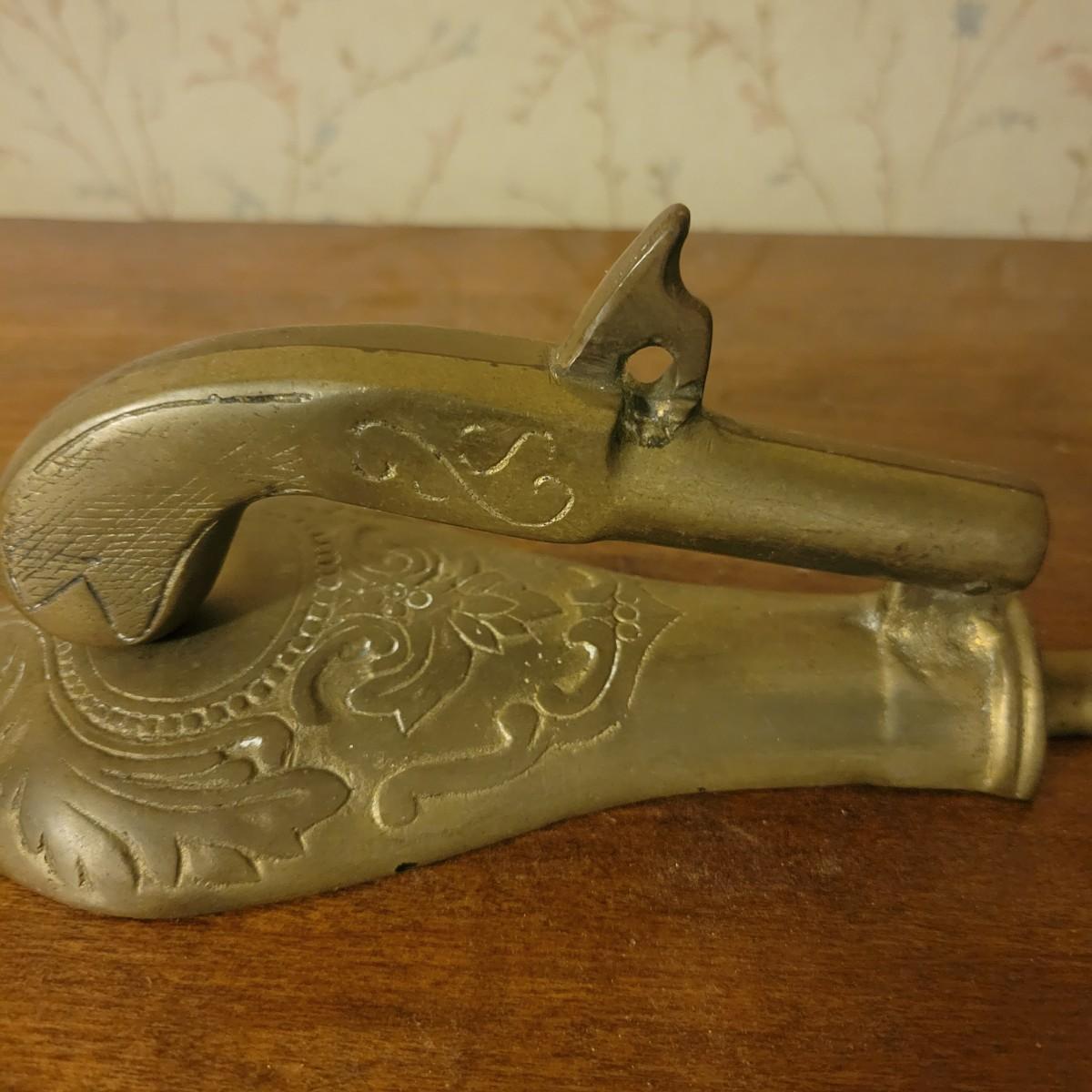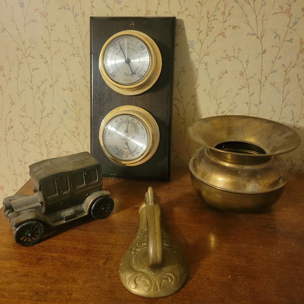 An assortment of four items in good condition. Included is a monolog weather station with temperature, humidity and barometer, a die cast piggy bank, a small brass spitoon and a brass door knocker with a flint lock for its knocker. Spitoon measures approximately 6" x 4.5" Shipping available