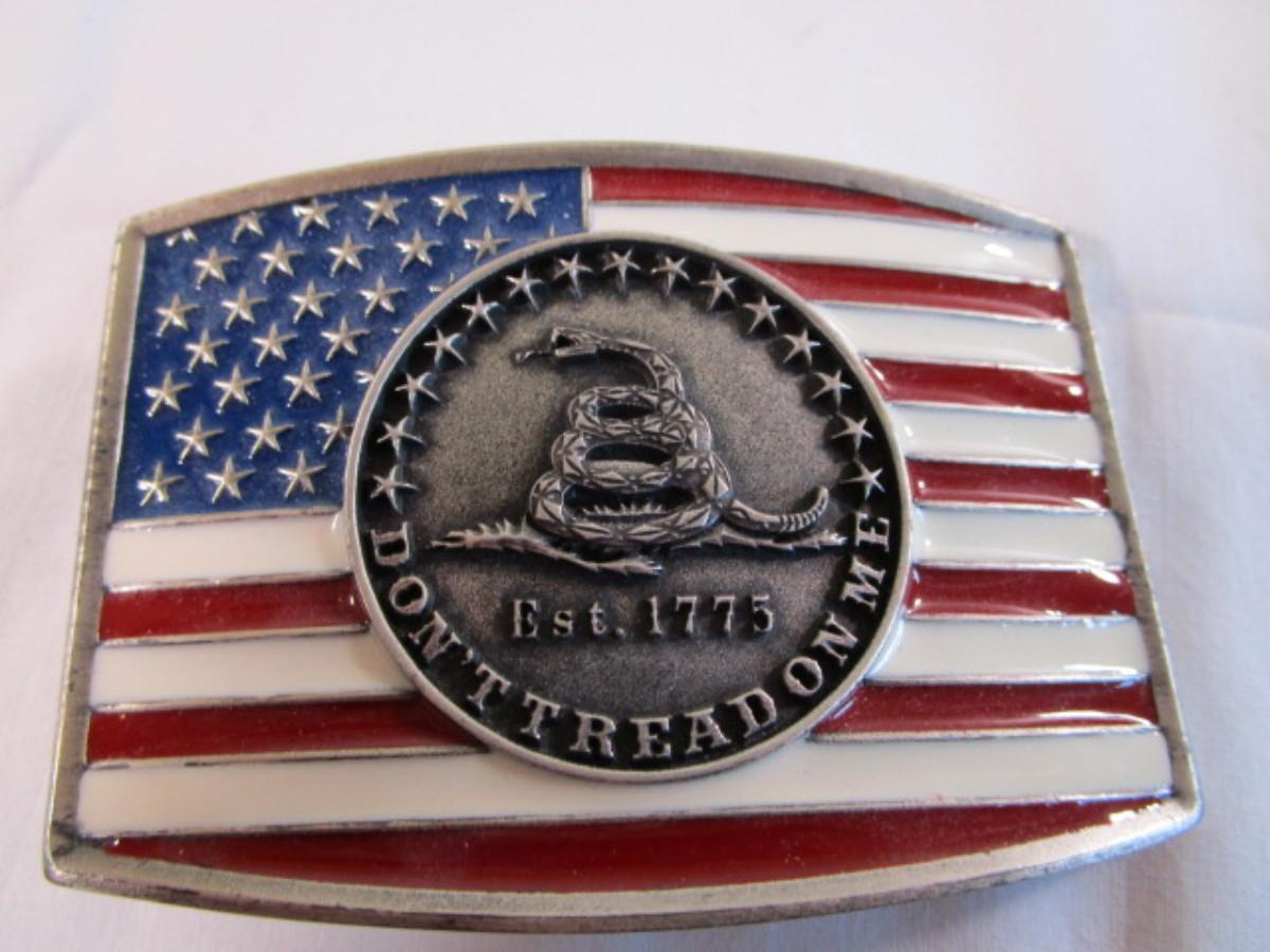 Has flag with snake, inscription: "Don't Tread On Me", 3-3/4" x 2-5/8"
