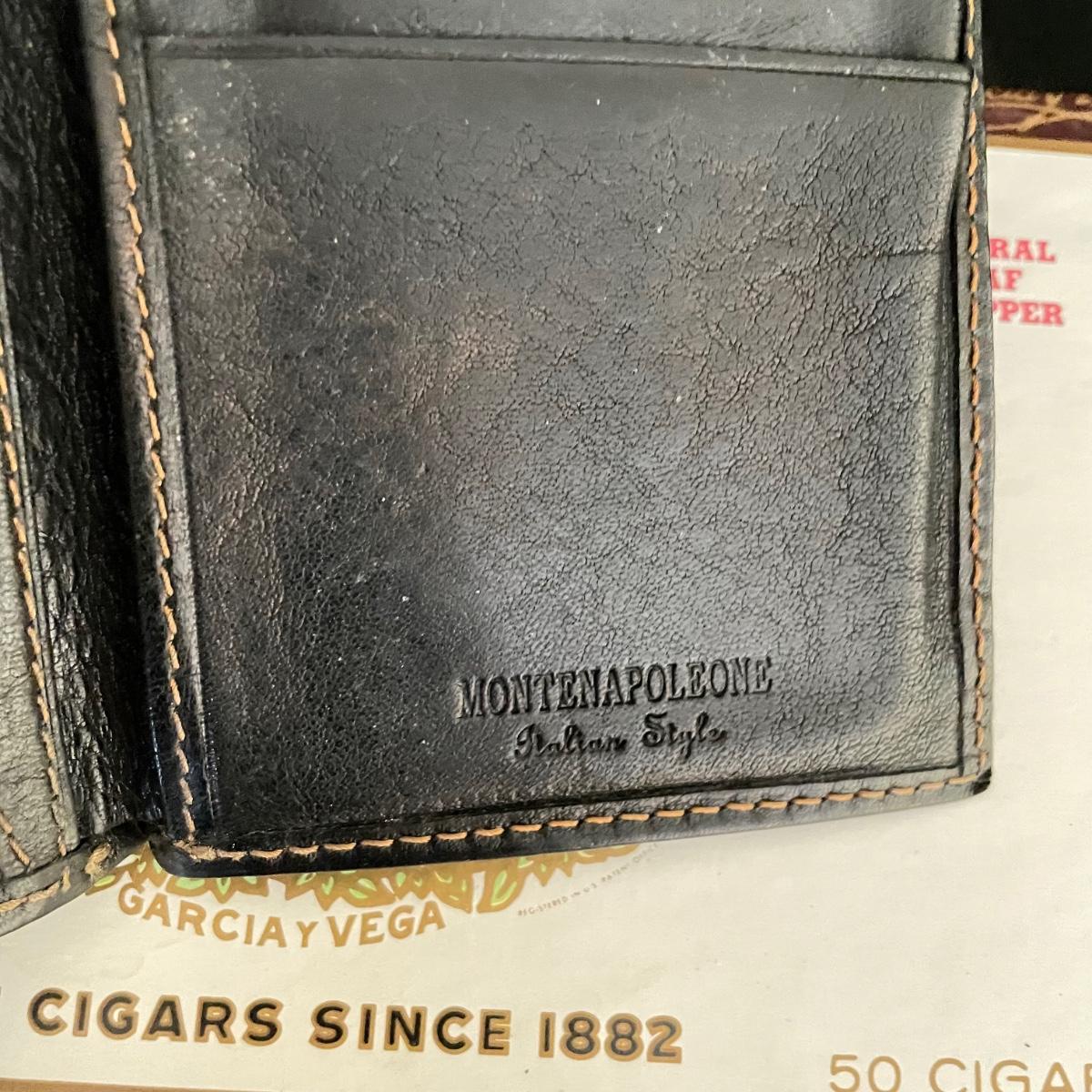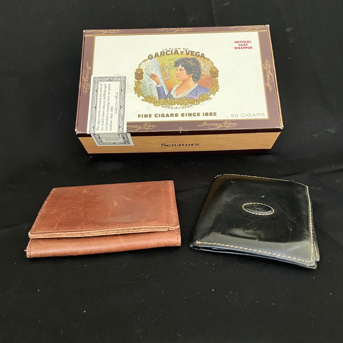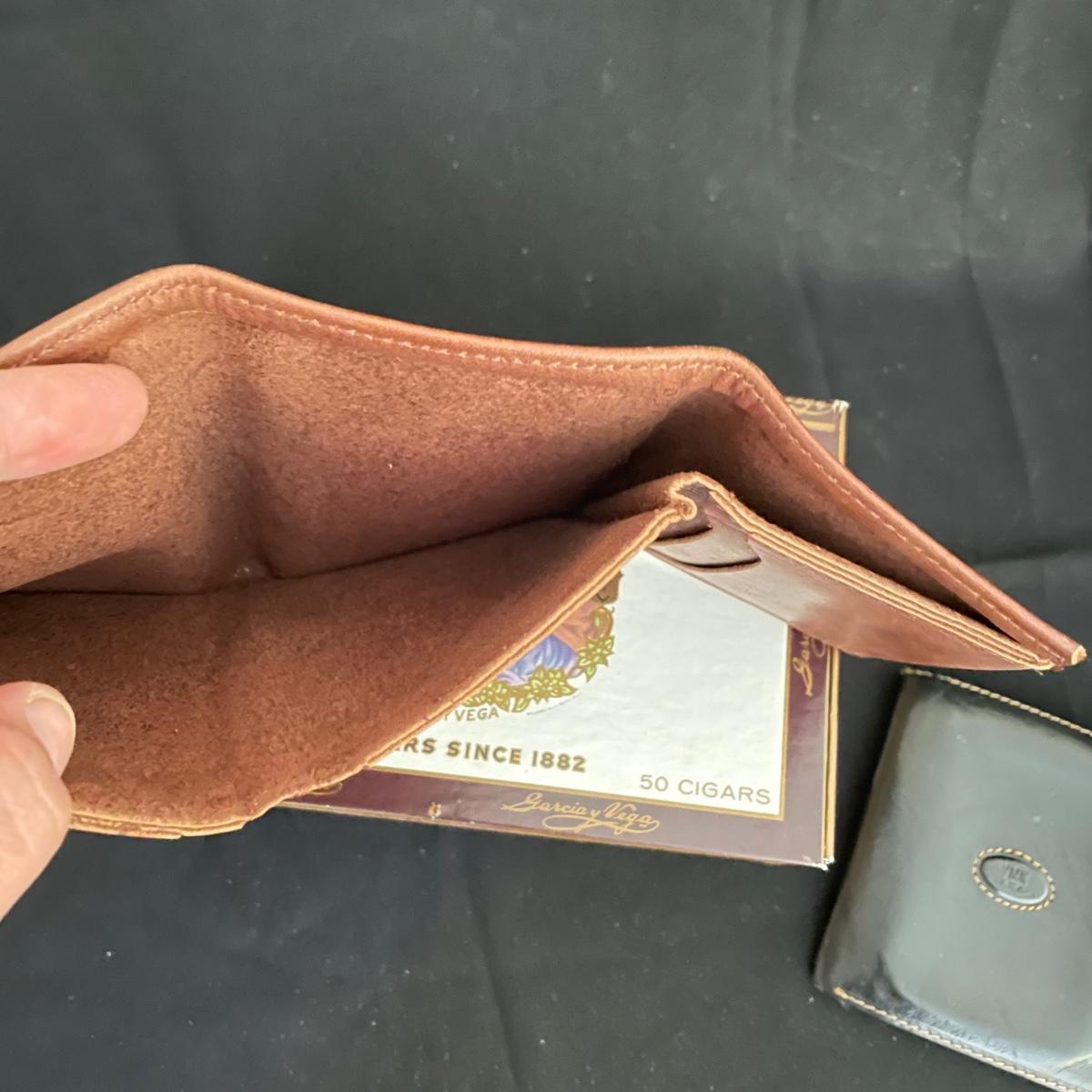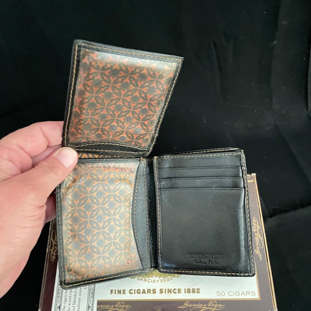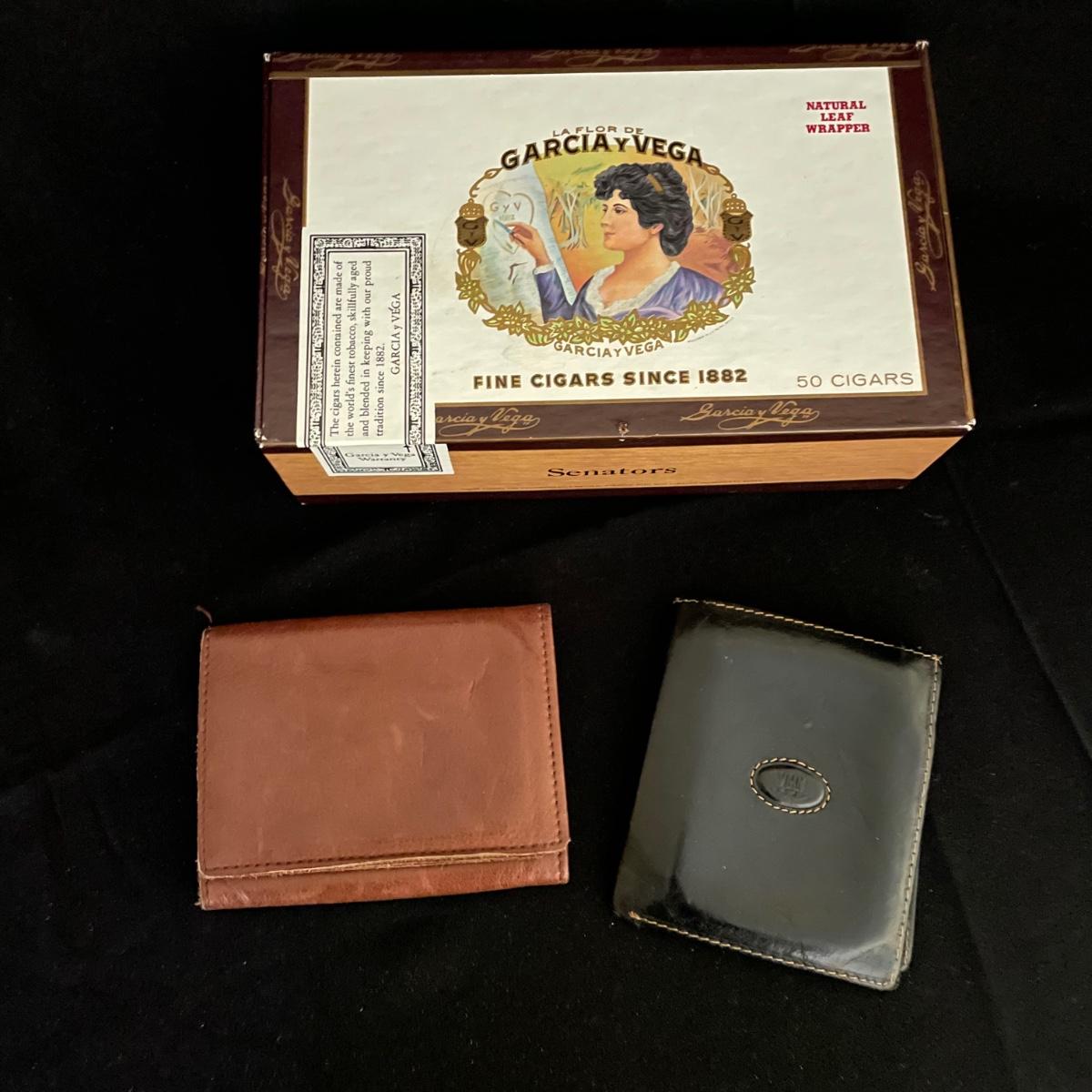 Like new brown leather wallet with a black Montenapoleone wallet. Both wallets appear in great shape and come with a Garcia y Vega Senators Cigar box. See images. Shipping available.