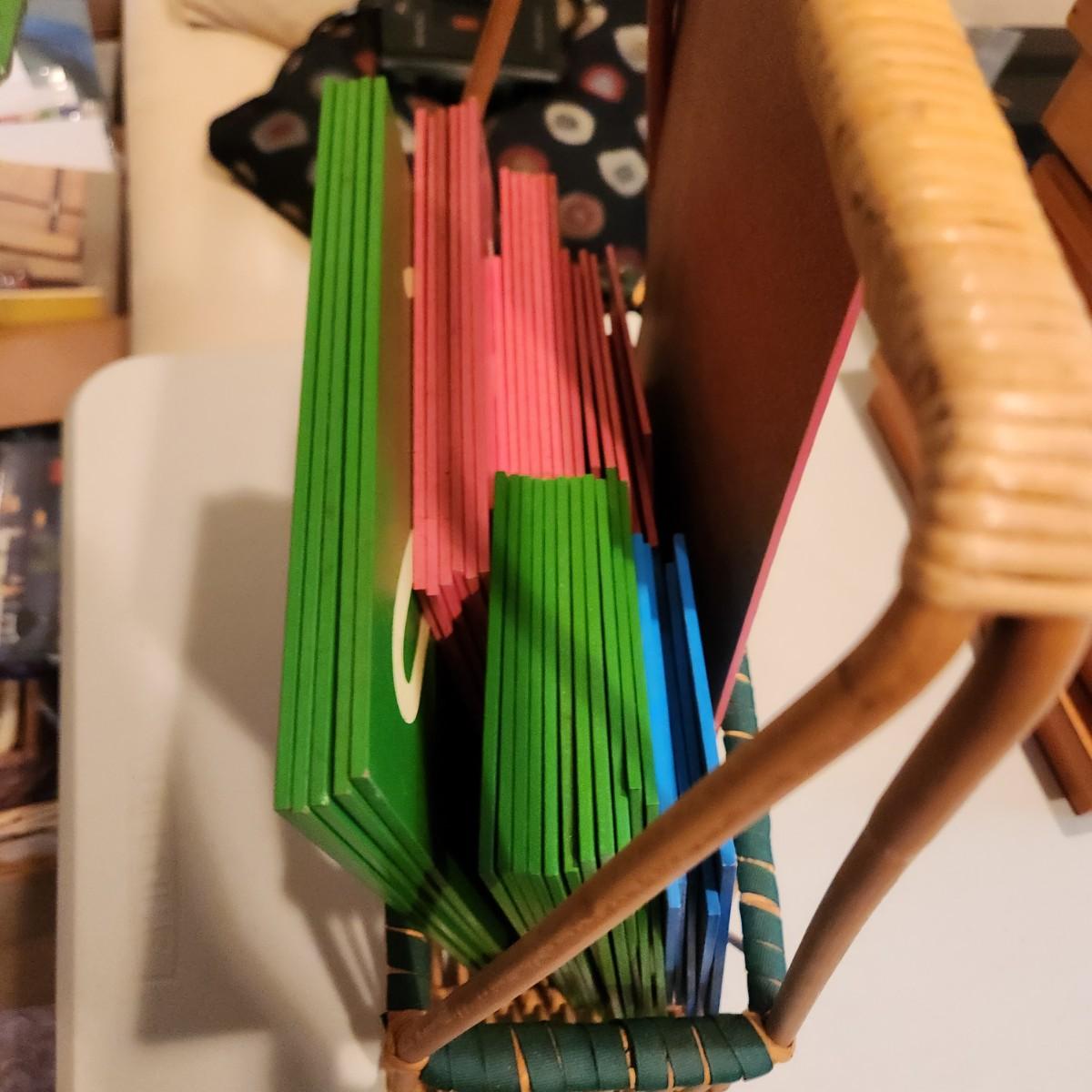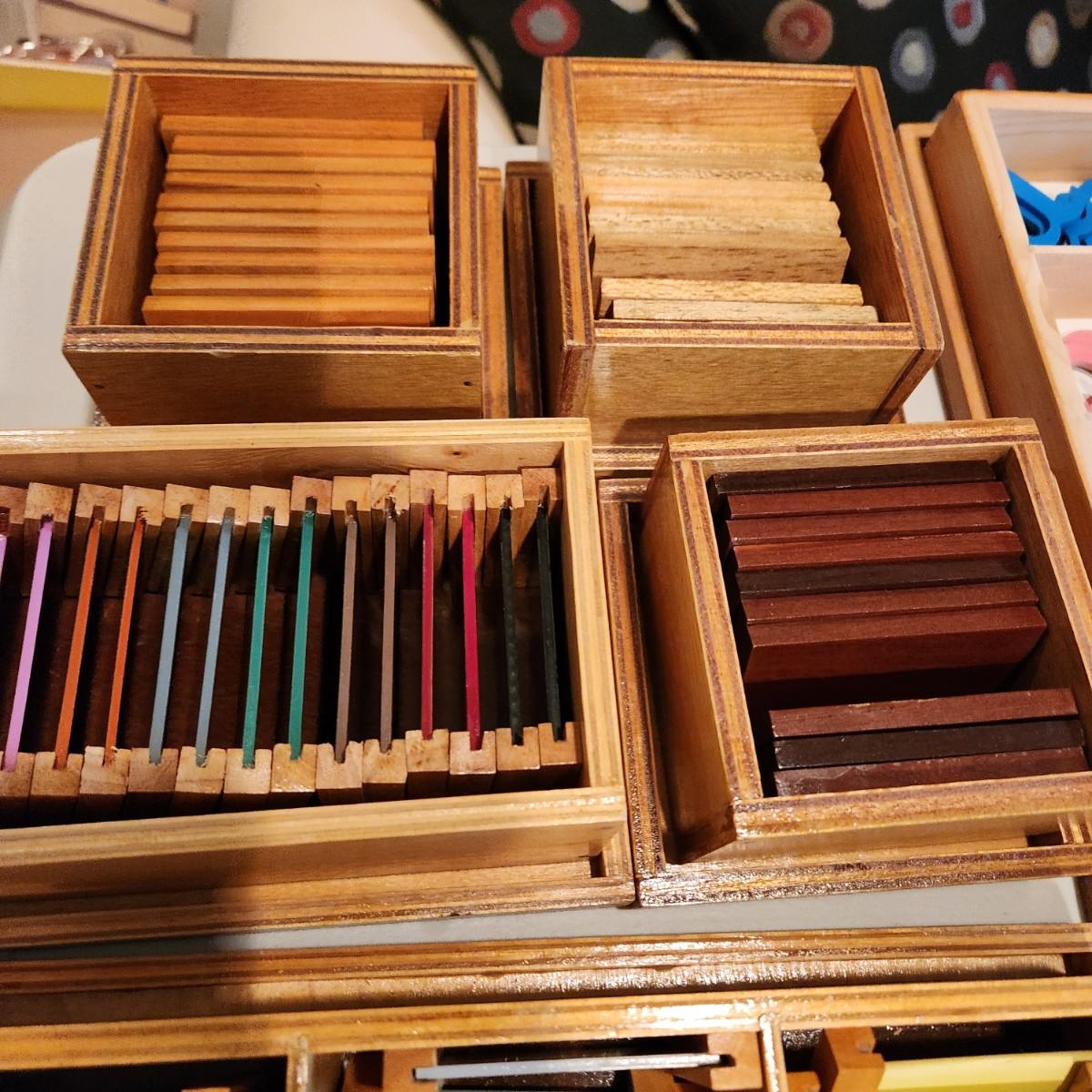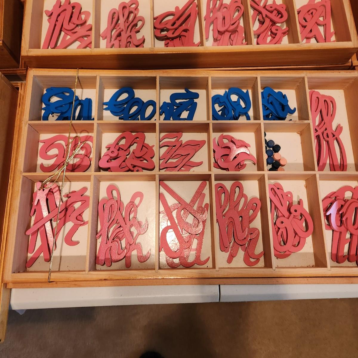 Montessori Home School Blue & Pink Cursive Moveable Alphabet Color Tablets w Wooden Storage Boxes