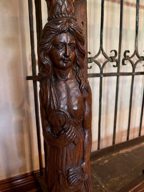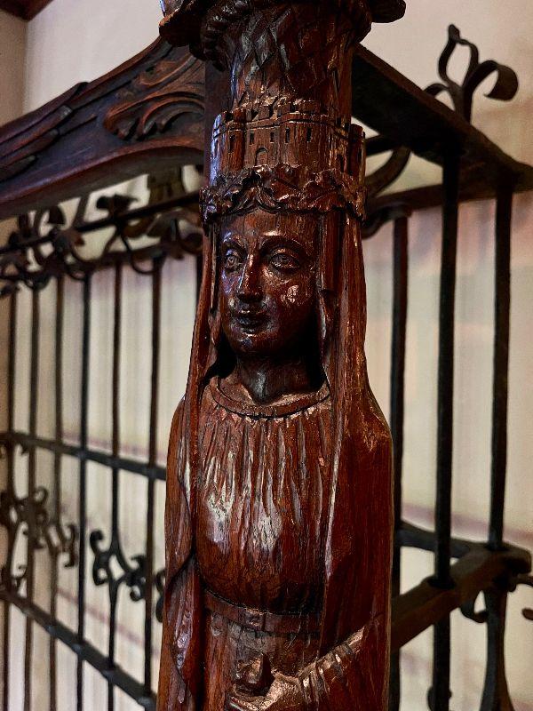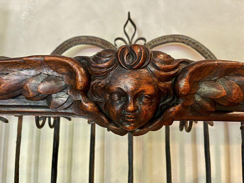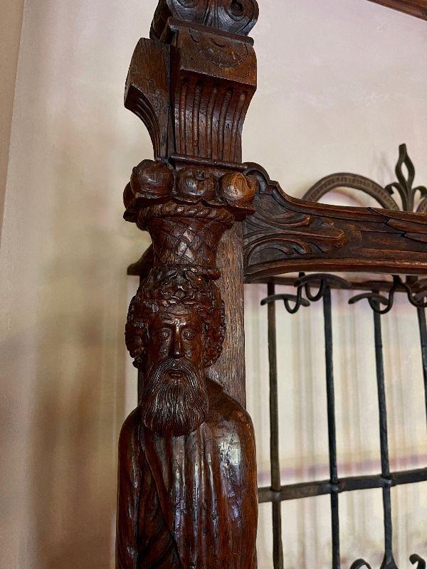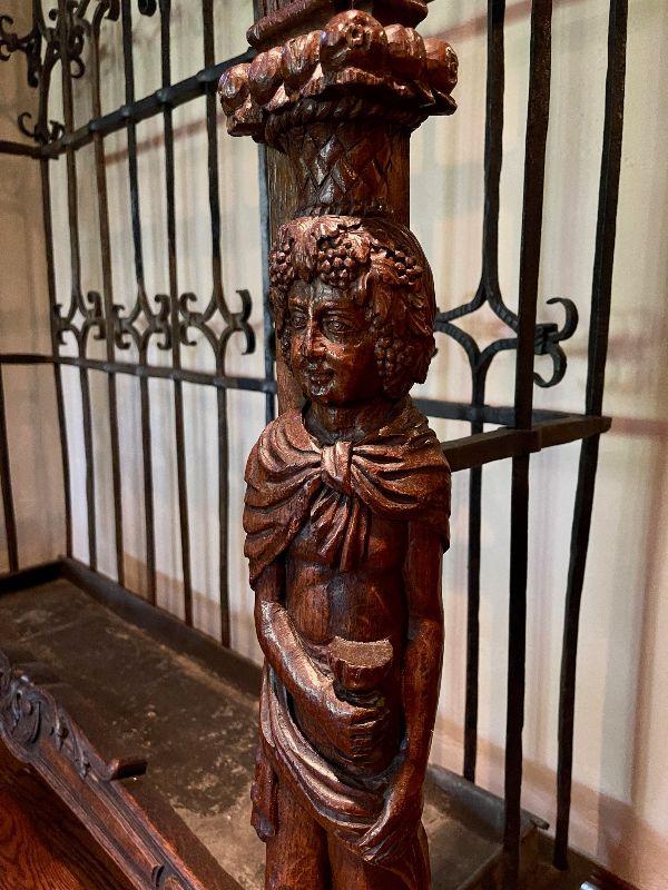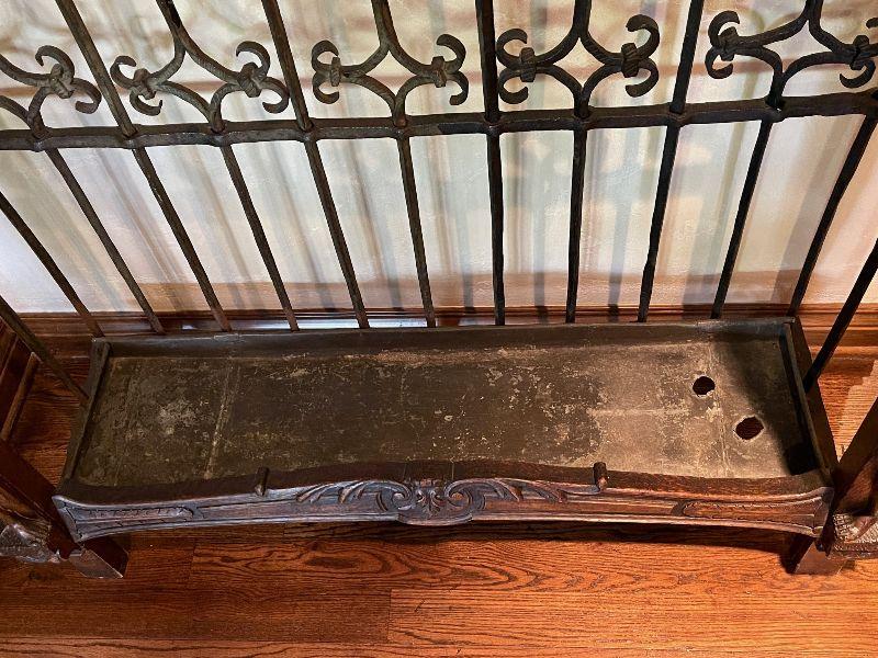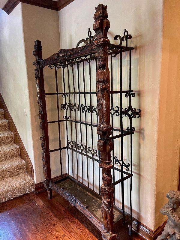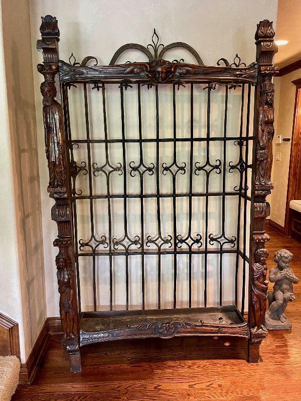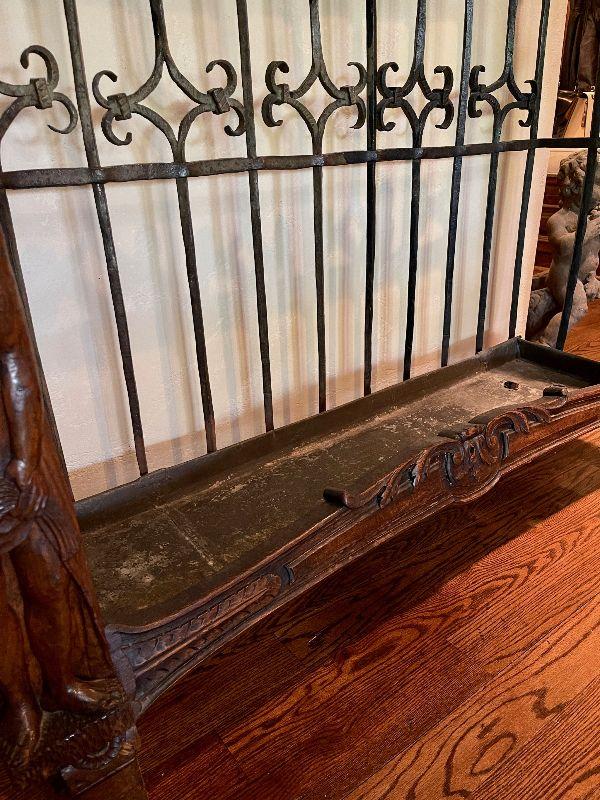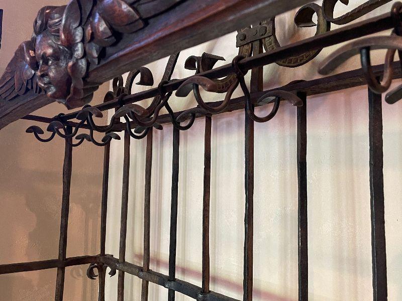 The subject item is a free-standing antique French hanging rack with 17th C. carved figural support framing dressed with 19th C. Spanish iron grill work. This is a unique, and elegant solution to display/store entry or mudroom, coats and hats or for its original intention, to hang wild game! The rack could also work for the convenient storage/display of cooking vessels and pots.