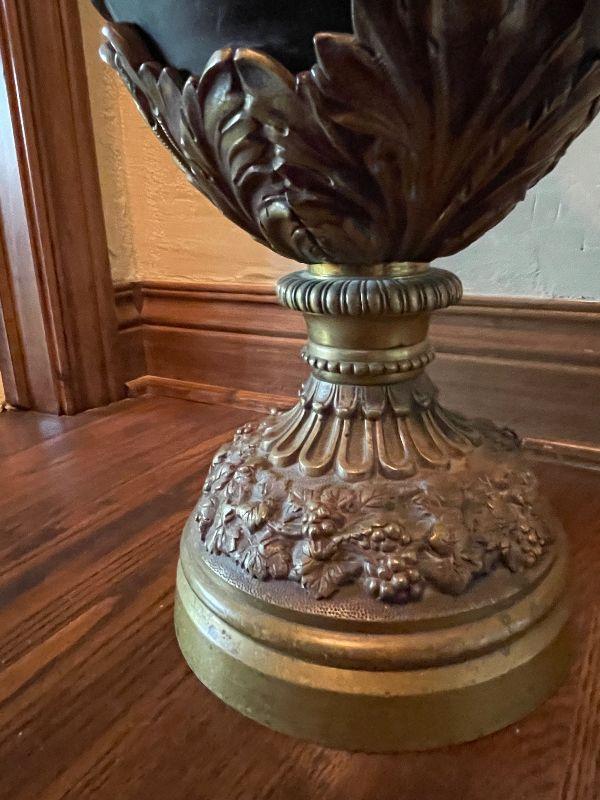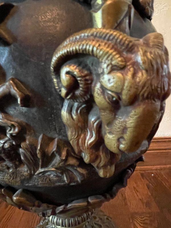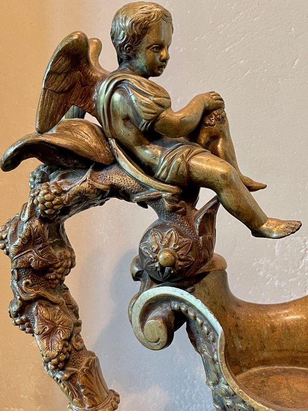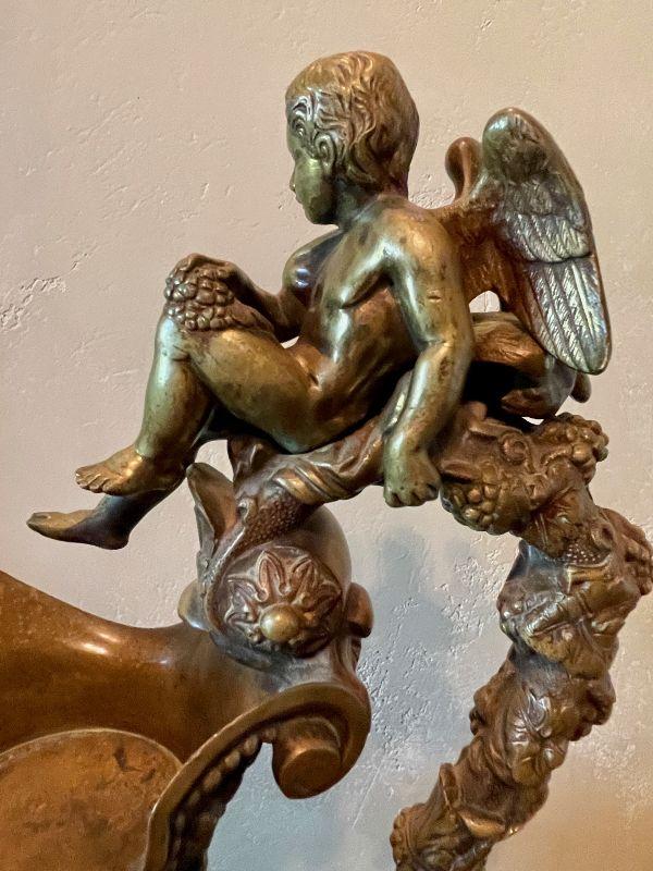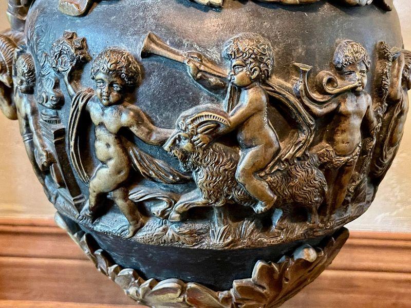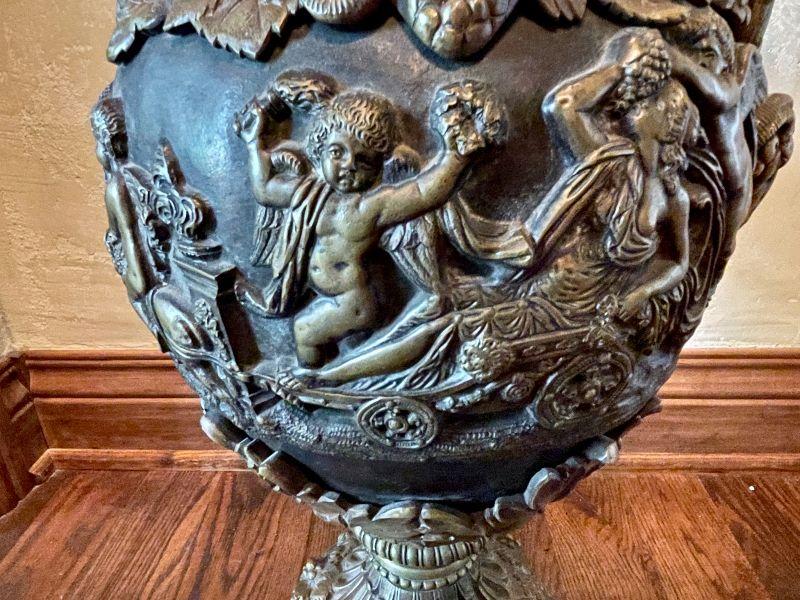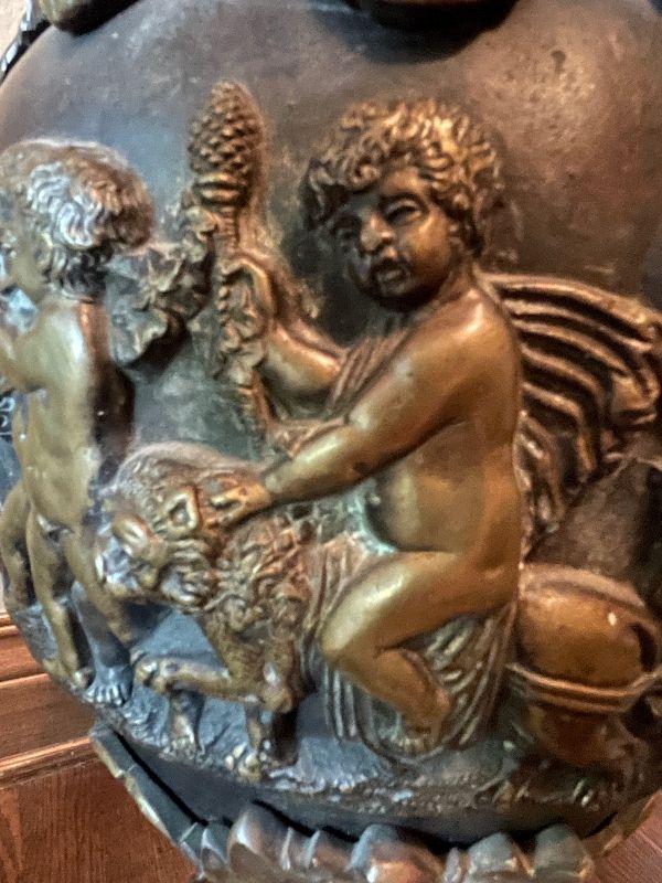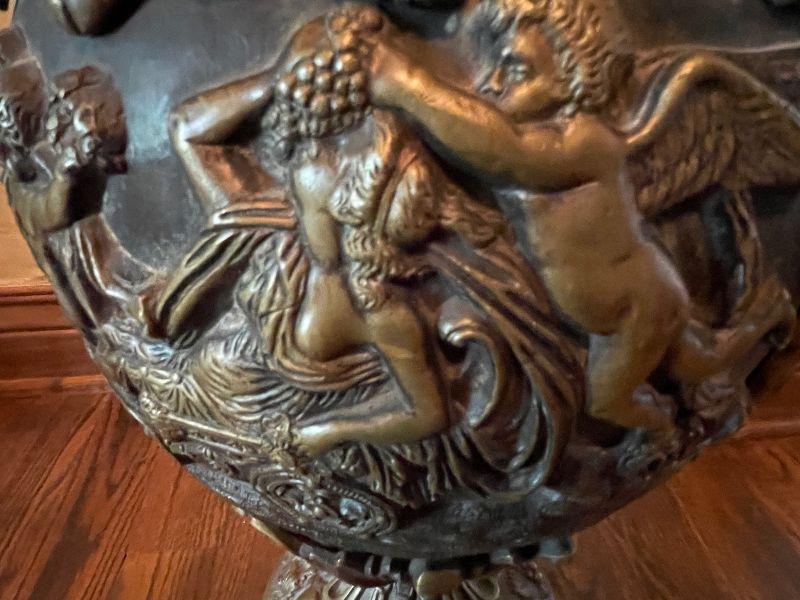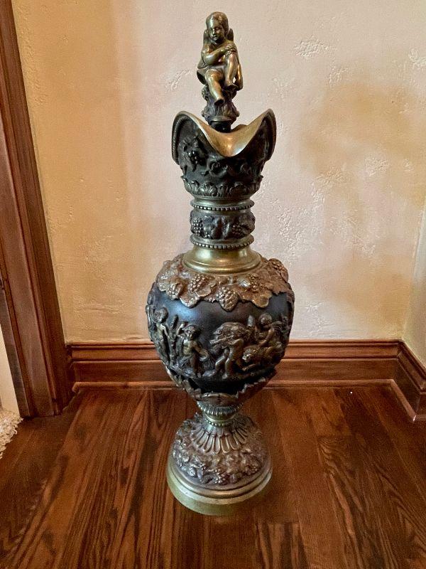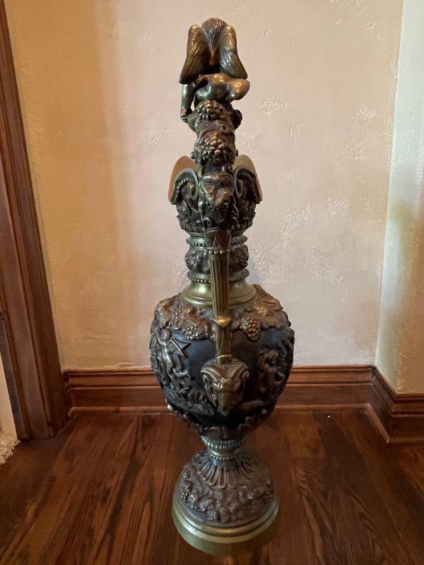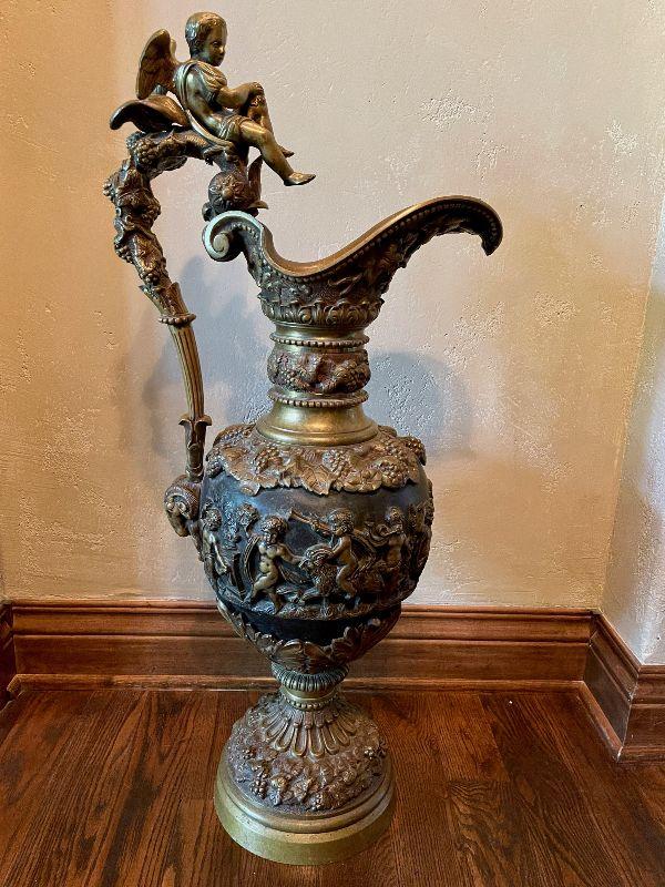 Monumental Greek Baroque ewer features bronze construction with all-over high relief featuring grape and vine decoration with cherub scenes. the handle of which is crowned with a Putti seated on a leafy thrown. The frieze surrounding the body of the piece too is peopled with putti blowing trumpets and celebrating natures gifts, including bunches of grapes and acanthus leaves. This grand antique bronze decorative ewer is quite impressive. The workmanship and time and expert craftsmanship in this piece is stunning. At nearly 3' tall, this substantial piece weighs over 80 lbs. Please see detailed photos.