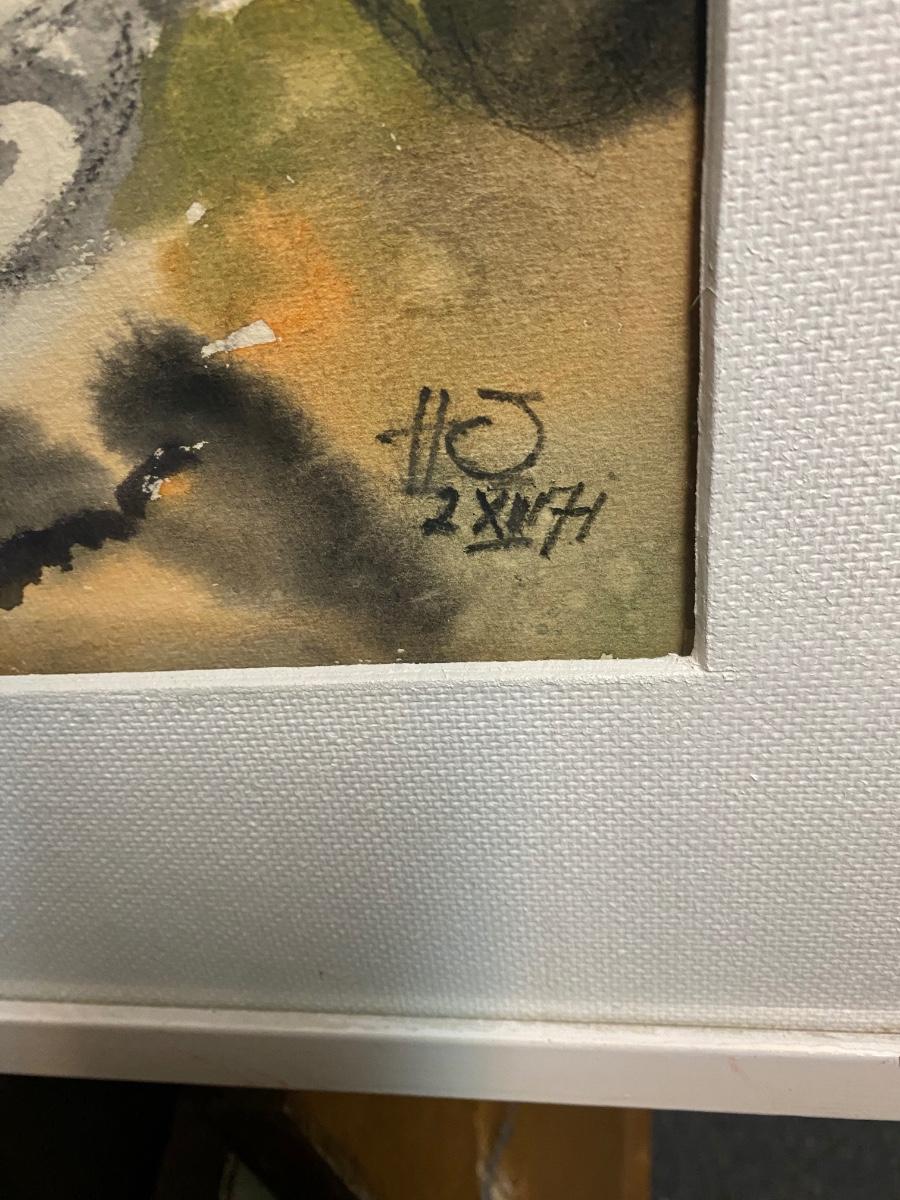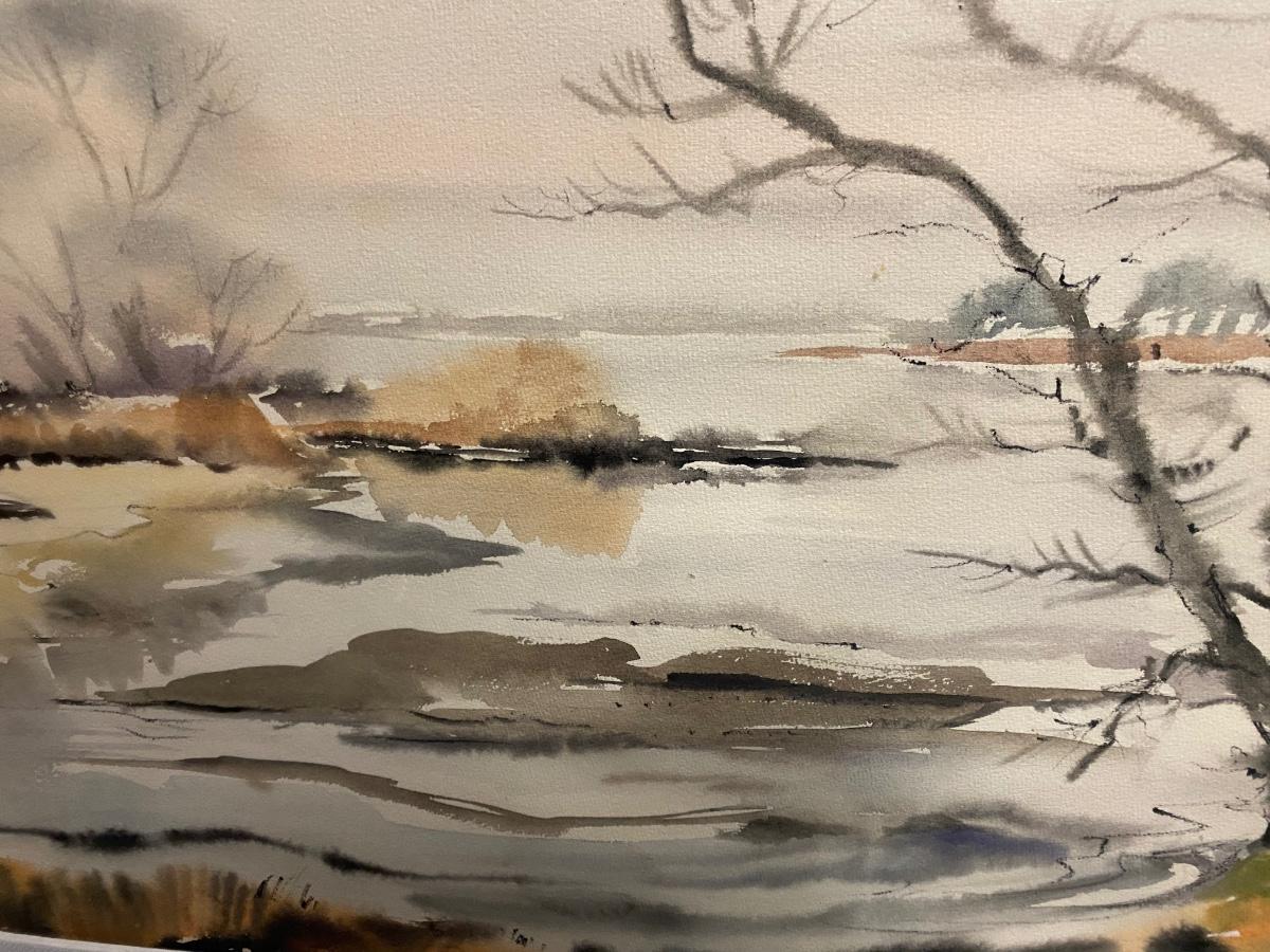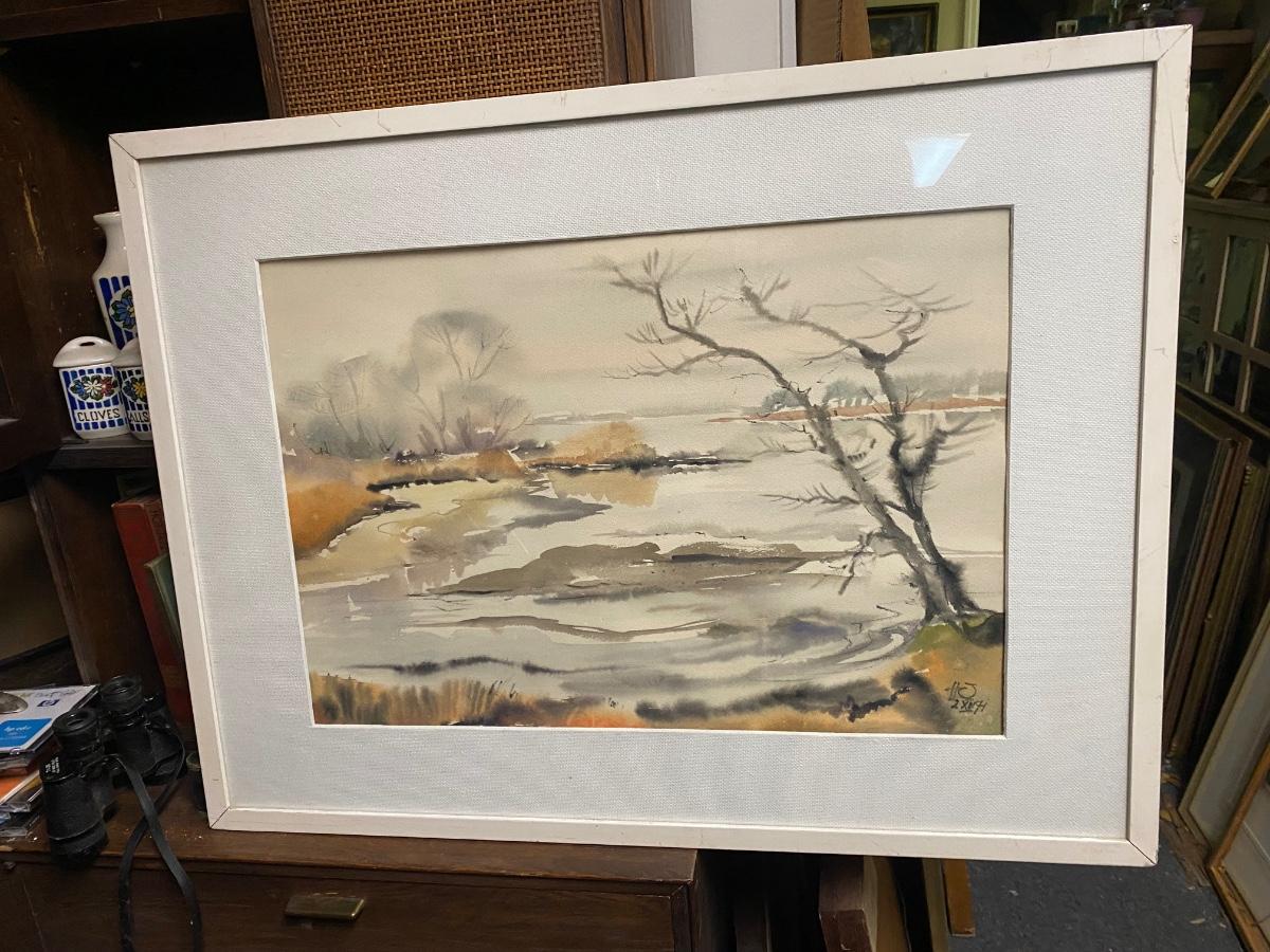 FRamed and signed moody watercolor, lake scene. Information included on back of art. 33x25.5