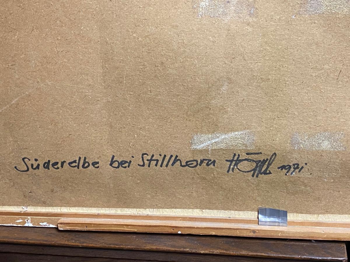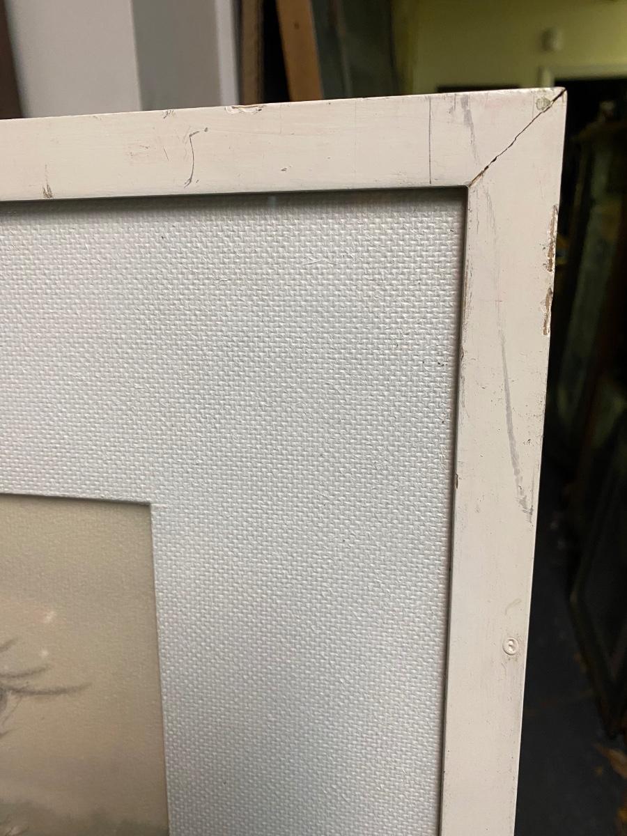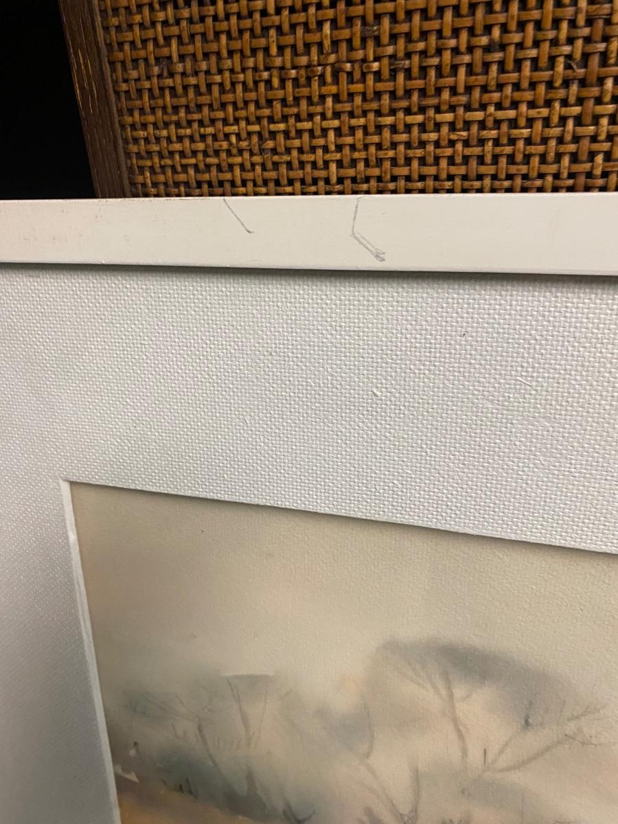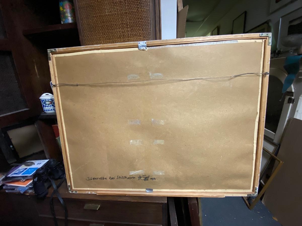 FRamed and signed moody watercolor, lake scene. Information included on back of art. 33x25.5