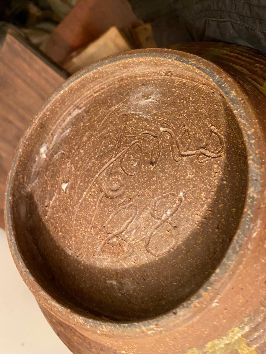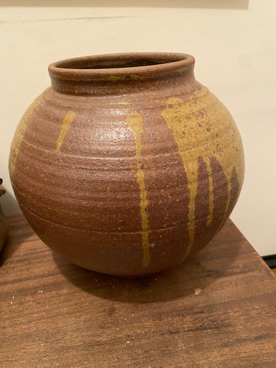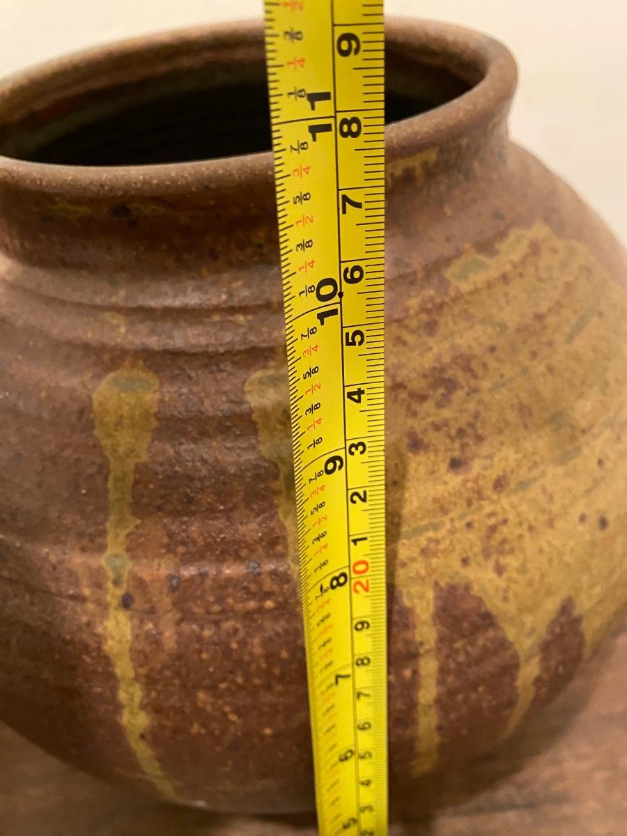 MOon jar style stoneware seramics with drip detail glaze. Signed and dated on bottom. 11"hx 9.5" round