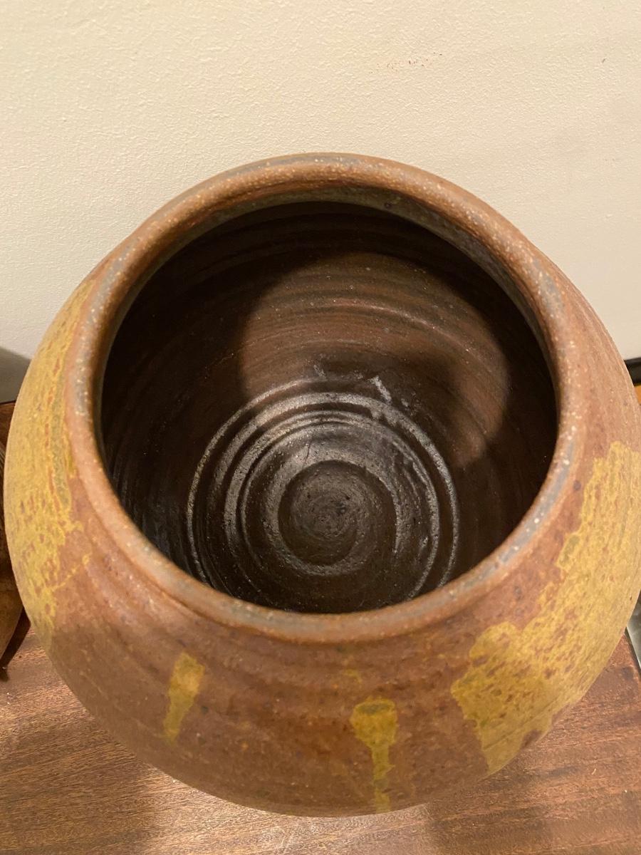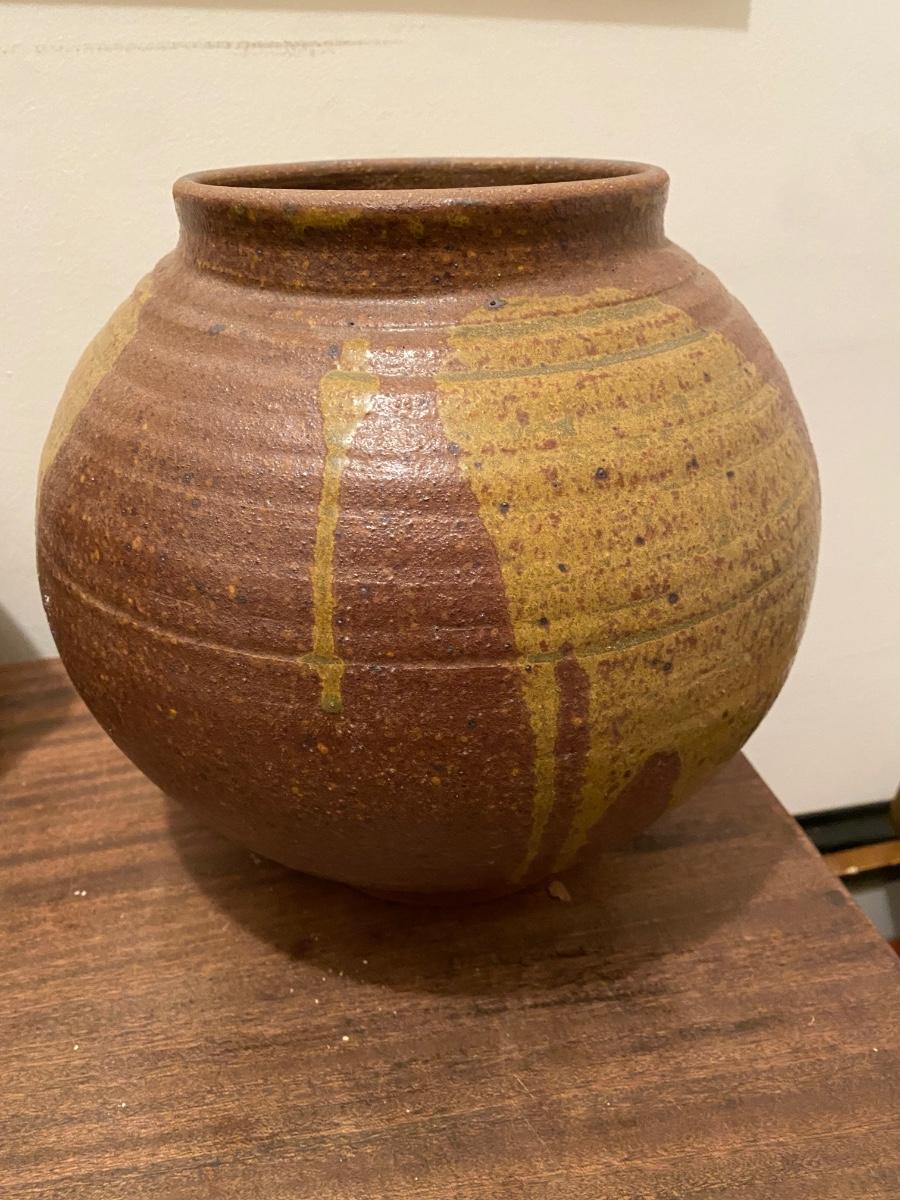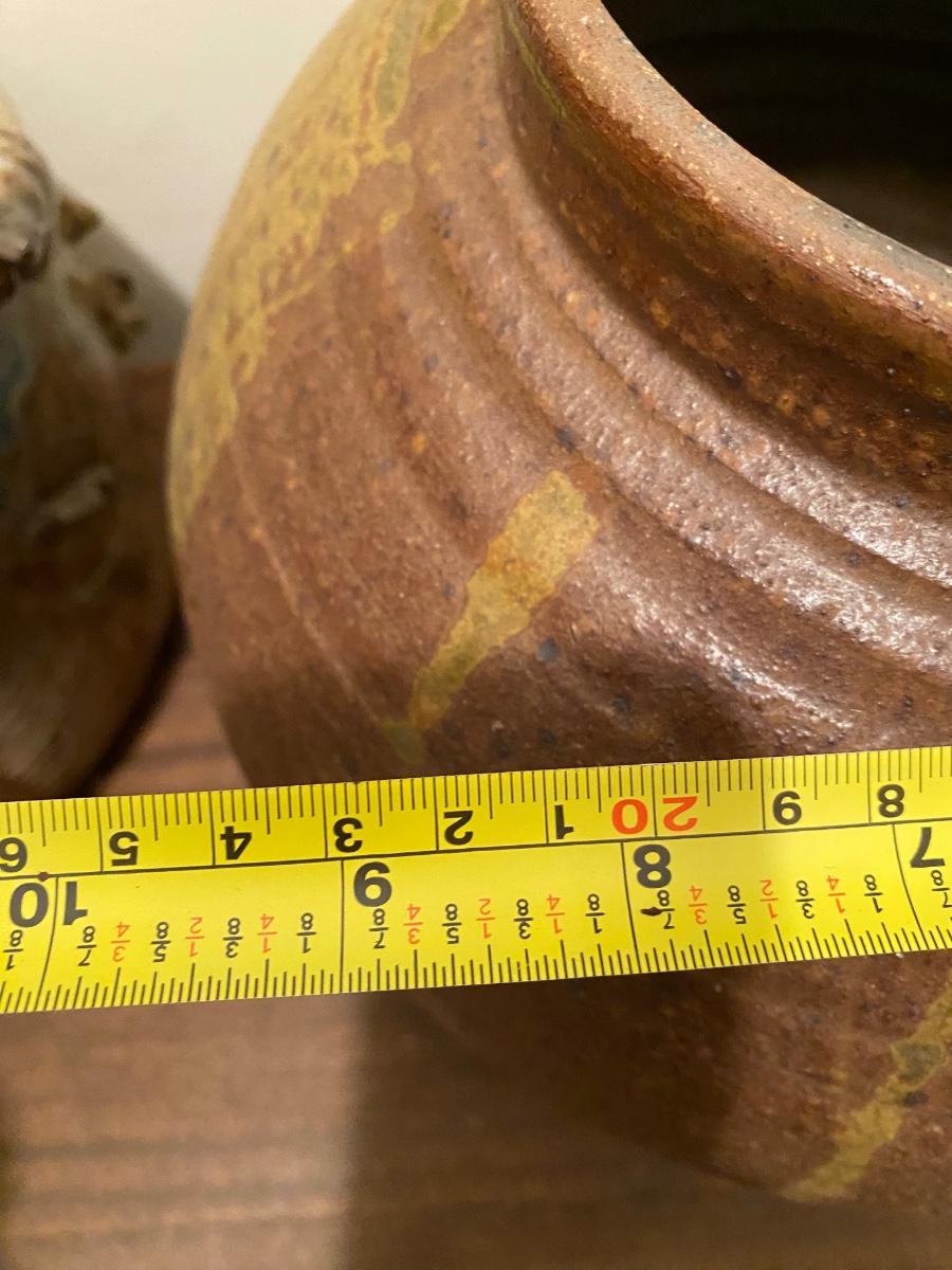 MOon jar style stoneware seramics with drip detail glaze. Signed and dated on bottom. 11"hx 9.5" round