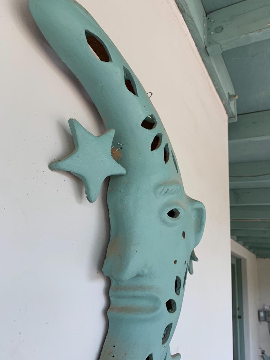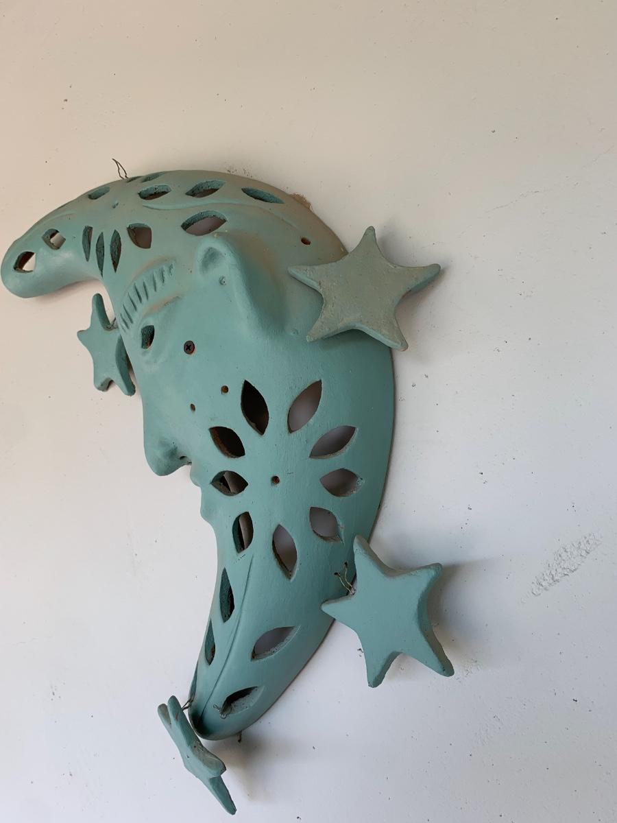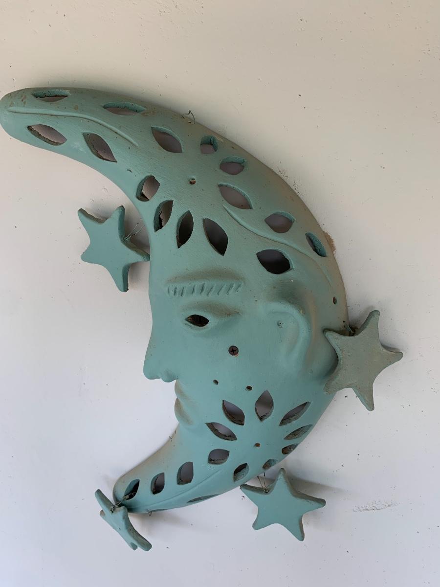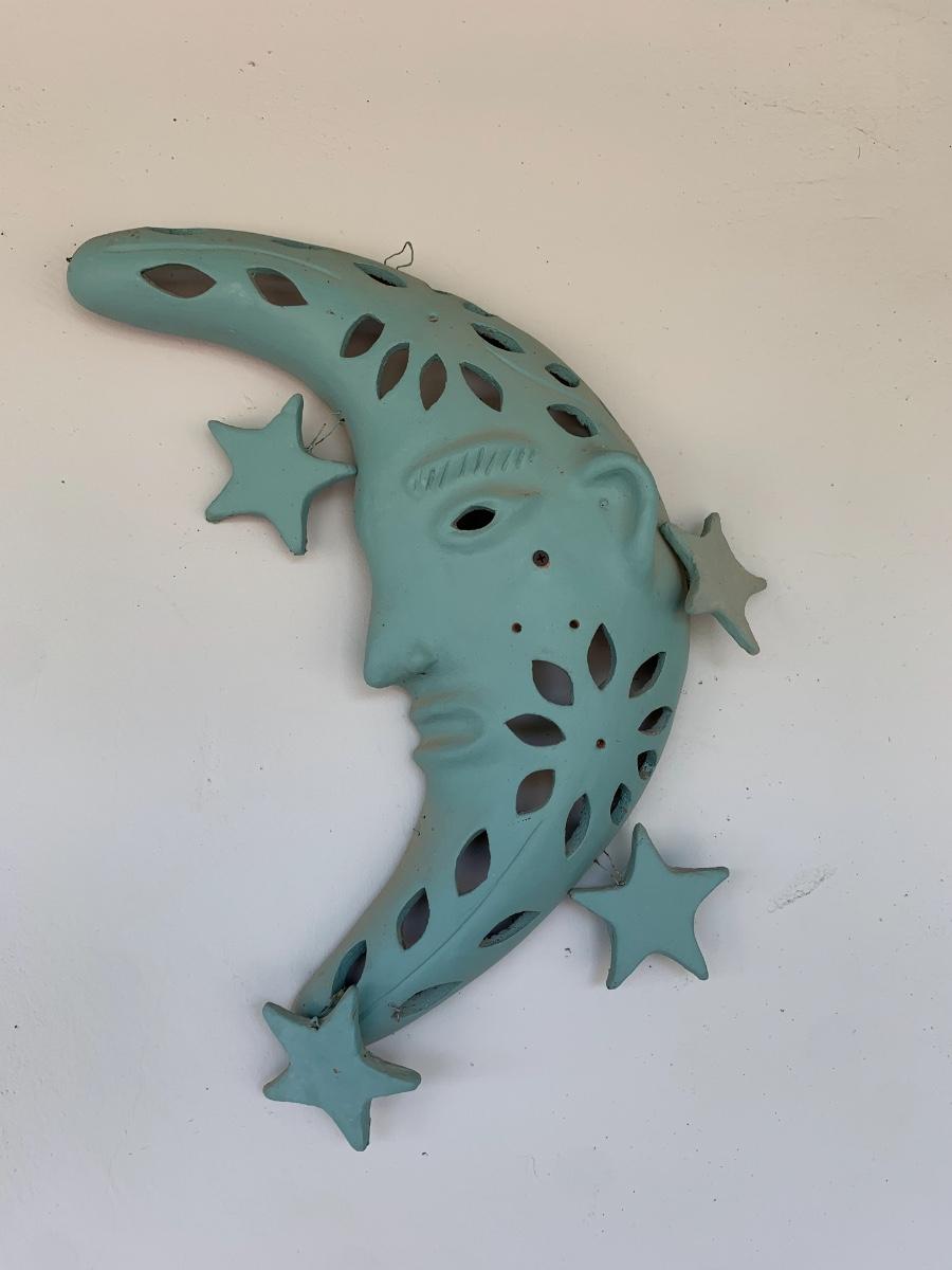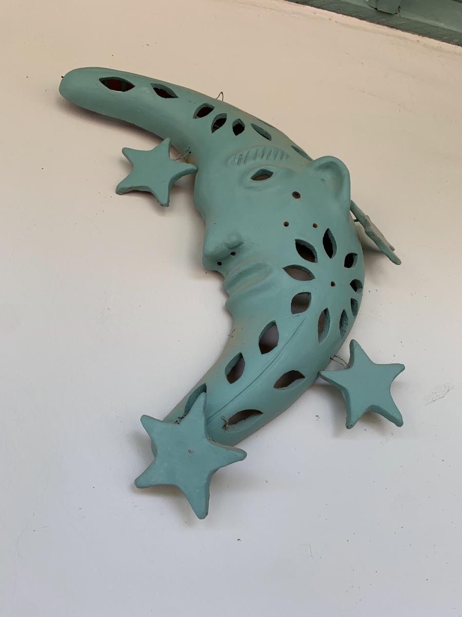 This lot includes a 22” terra cotta crescent moon painted aqua color with smaller terra cotta stars attached.
