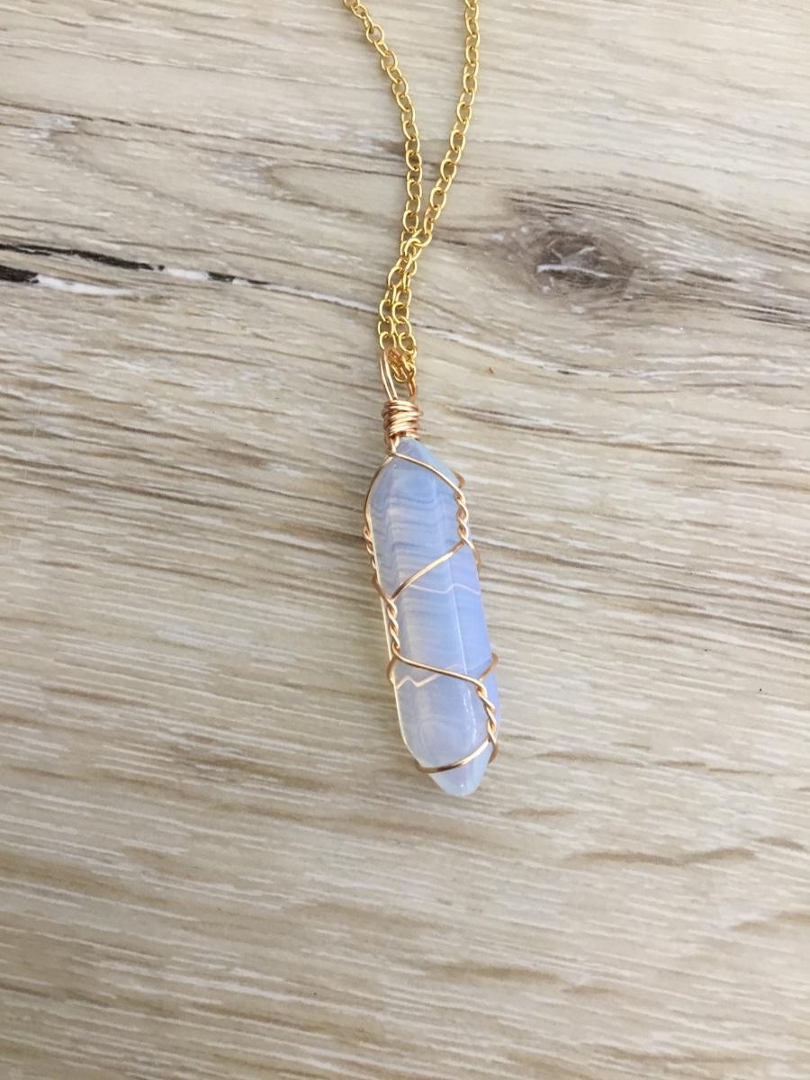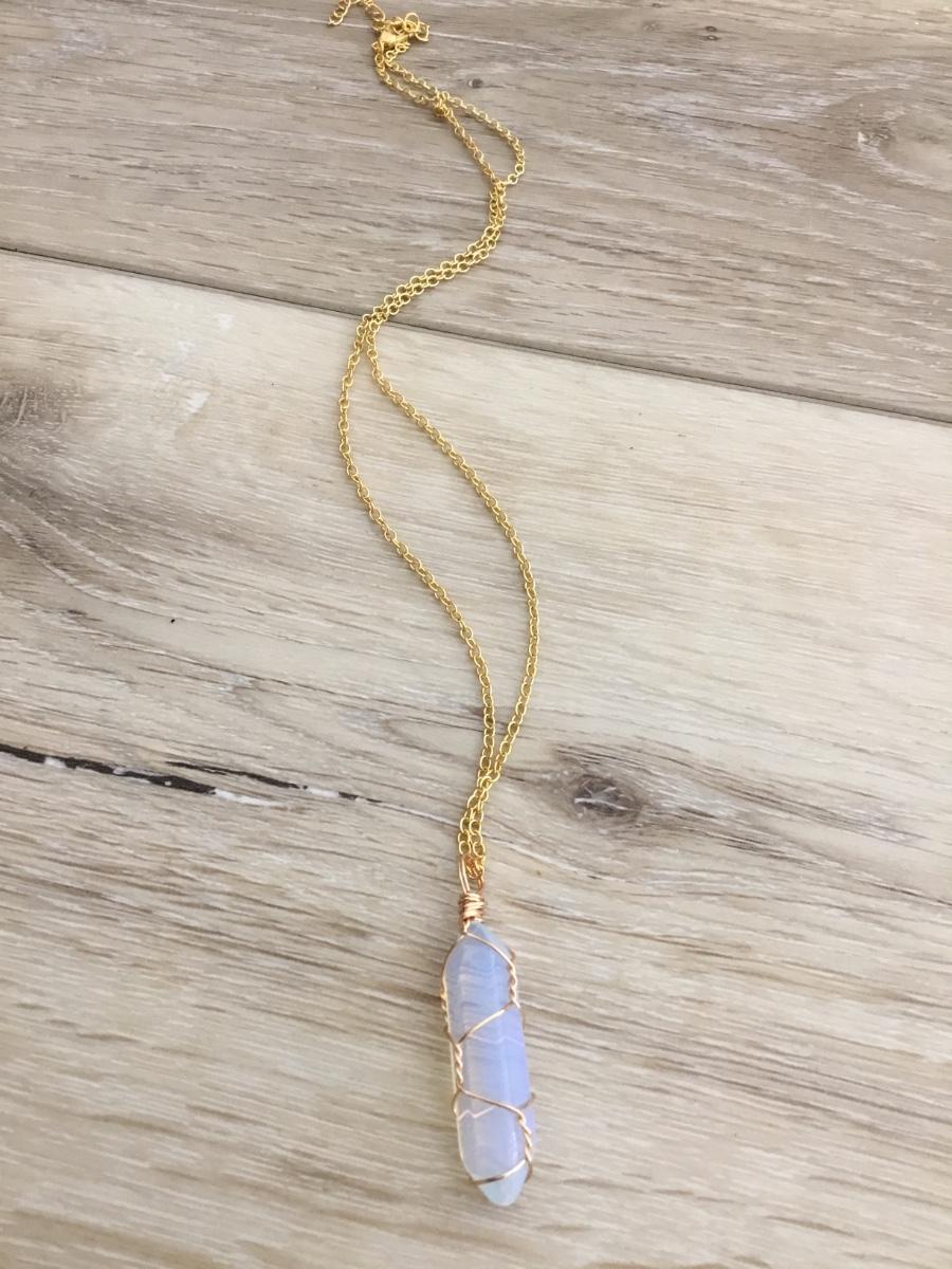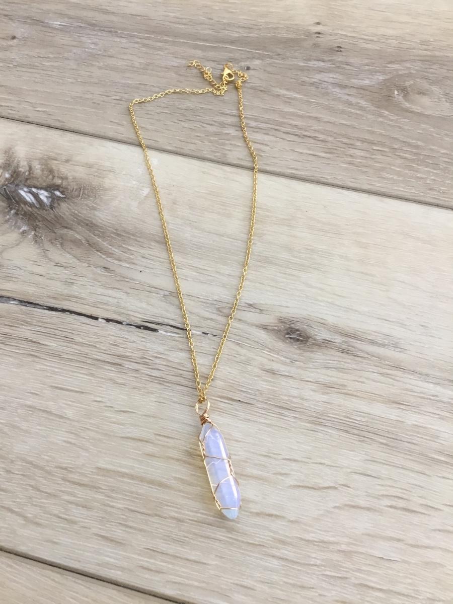 Moon stone wrapped pendant & gold tone chain necklace
