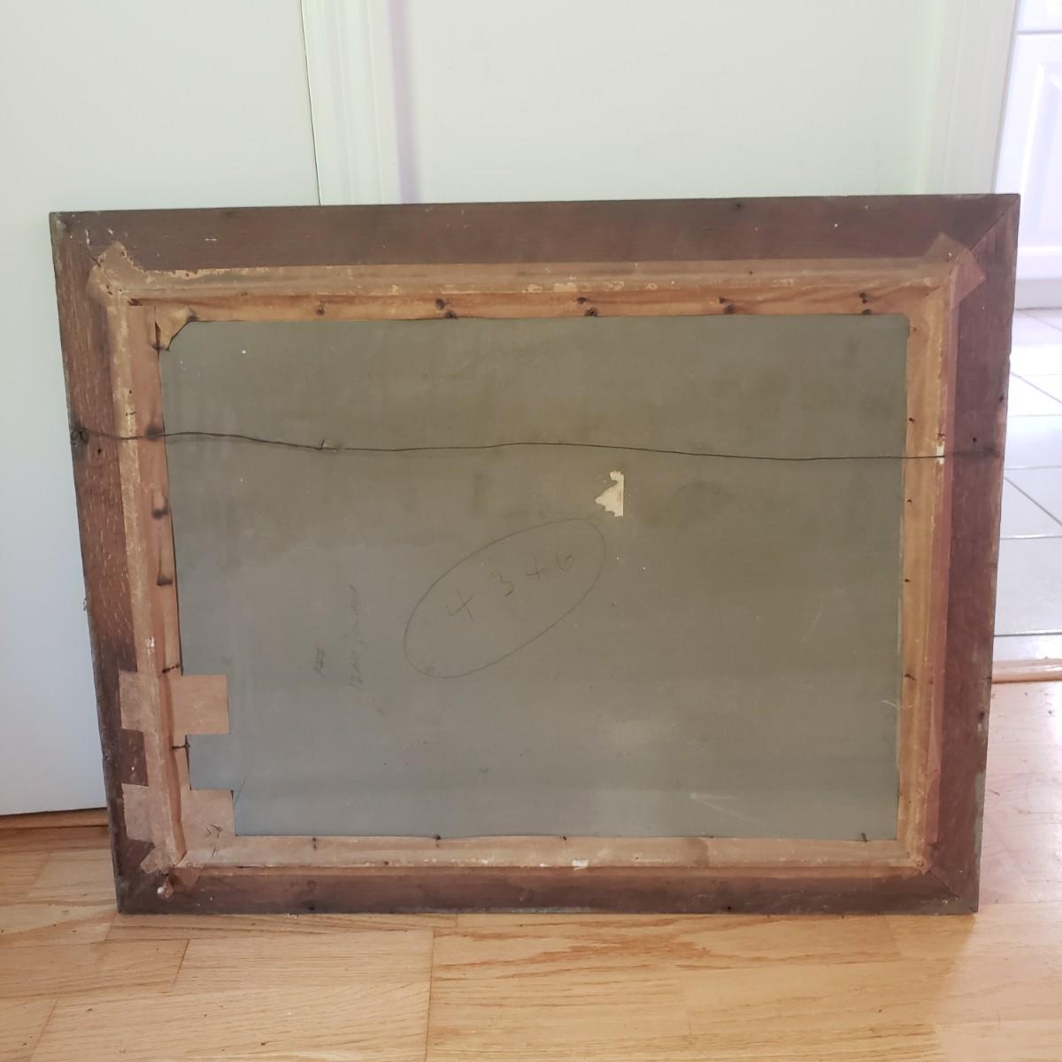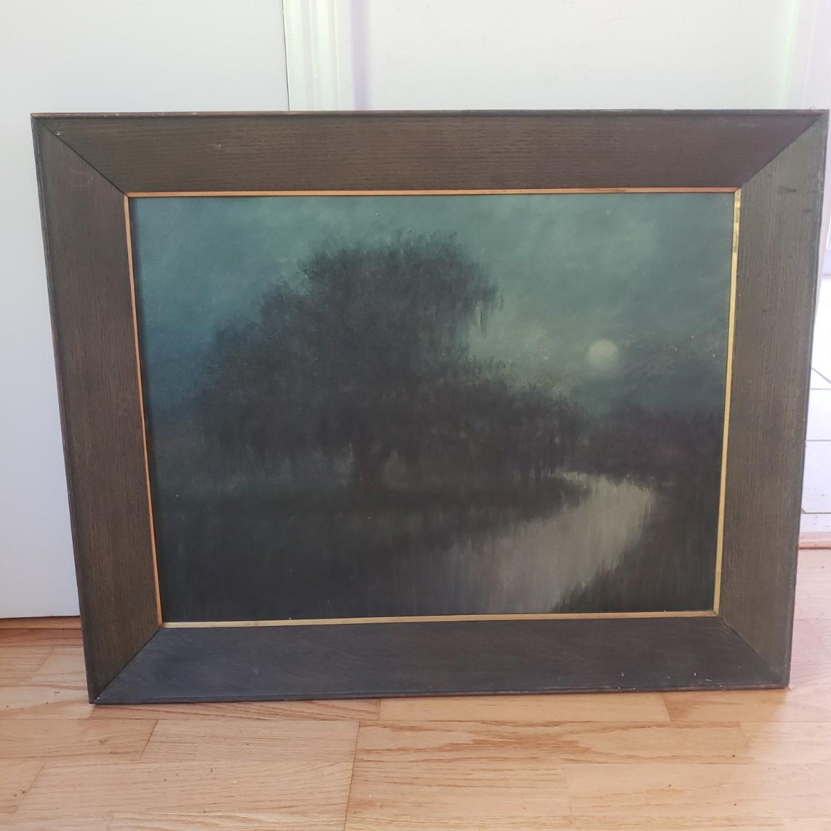 This vintage, possibly antique oil painting features a moonlit river and tree. There is an artist's signature, yet it's hard to decipher, see picture. The frame does not come with glass and measures 29" x 24"H. Due to its age, there are some chips off the frame.