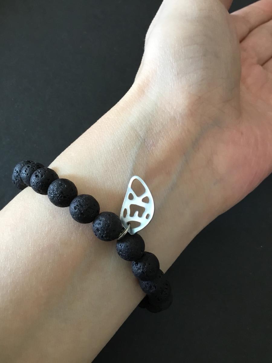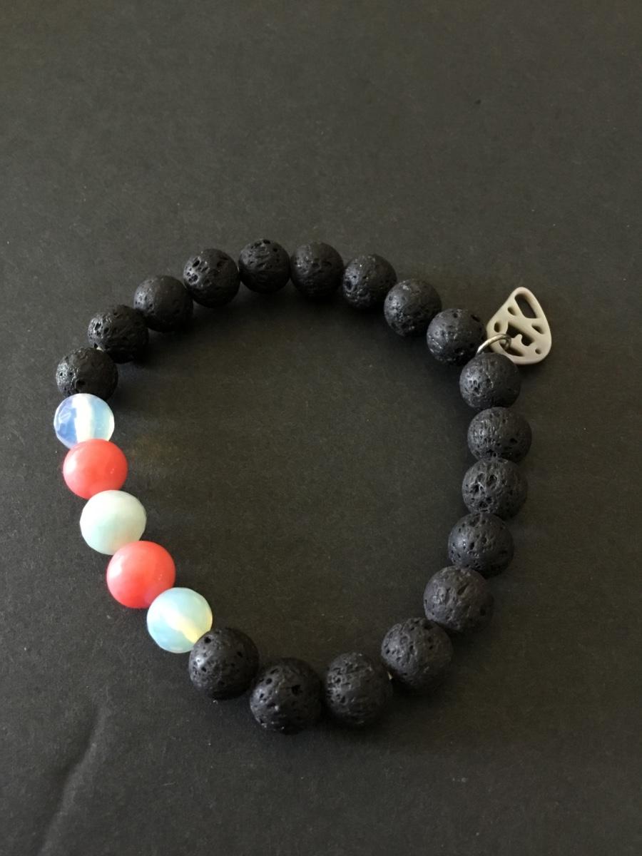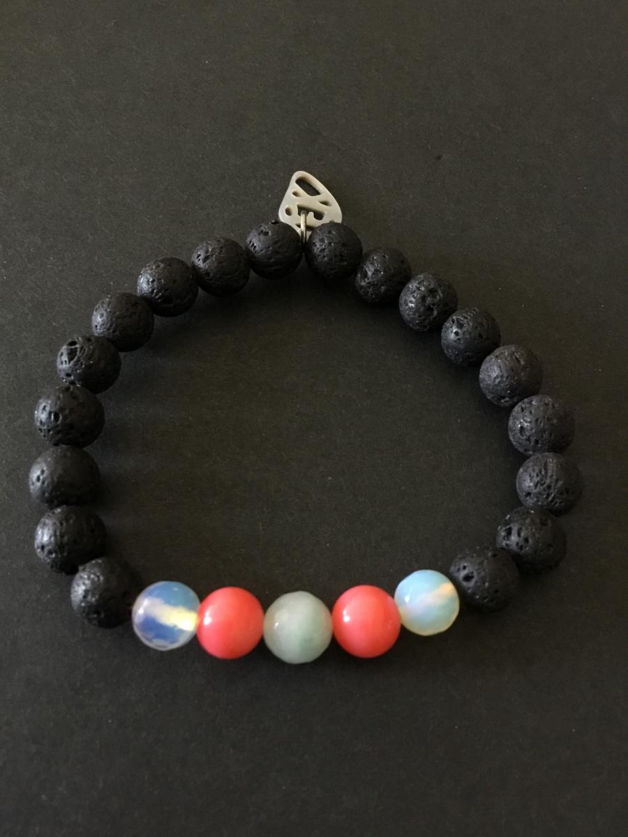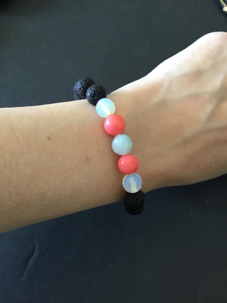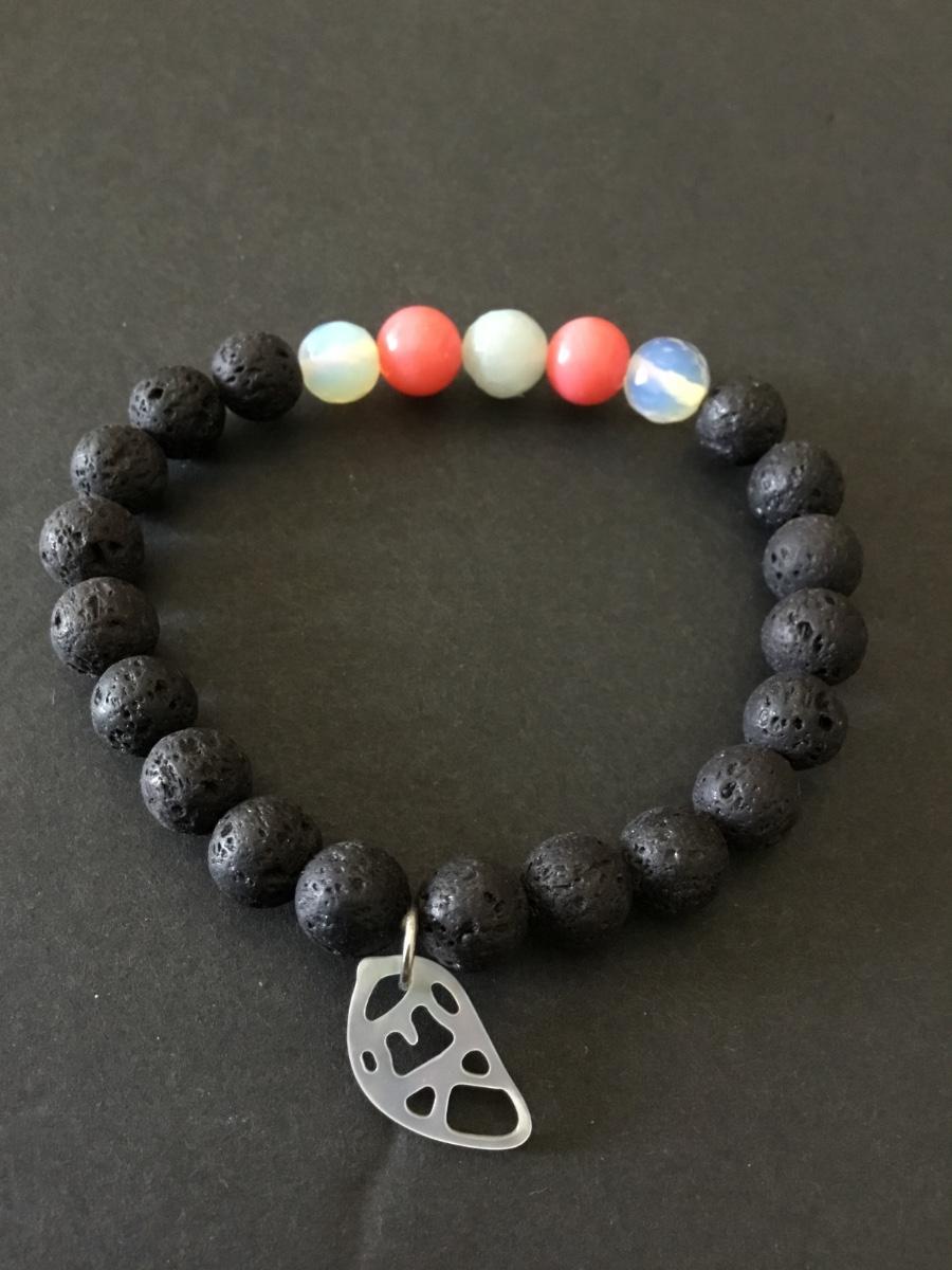 Moonstone & volcanic bead stretch bracelet, shell charm