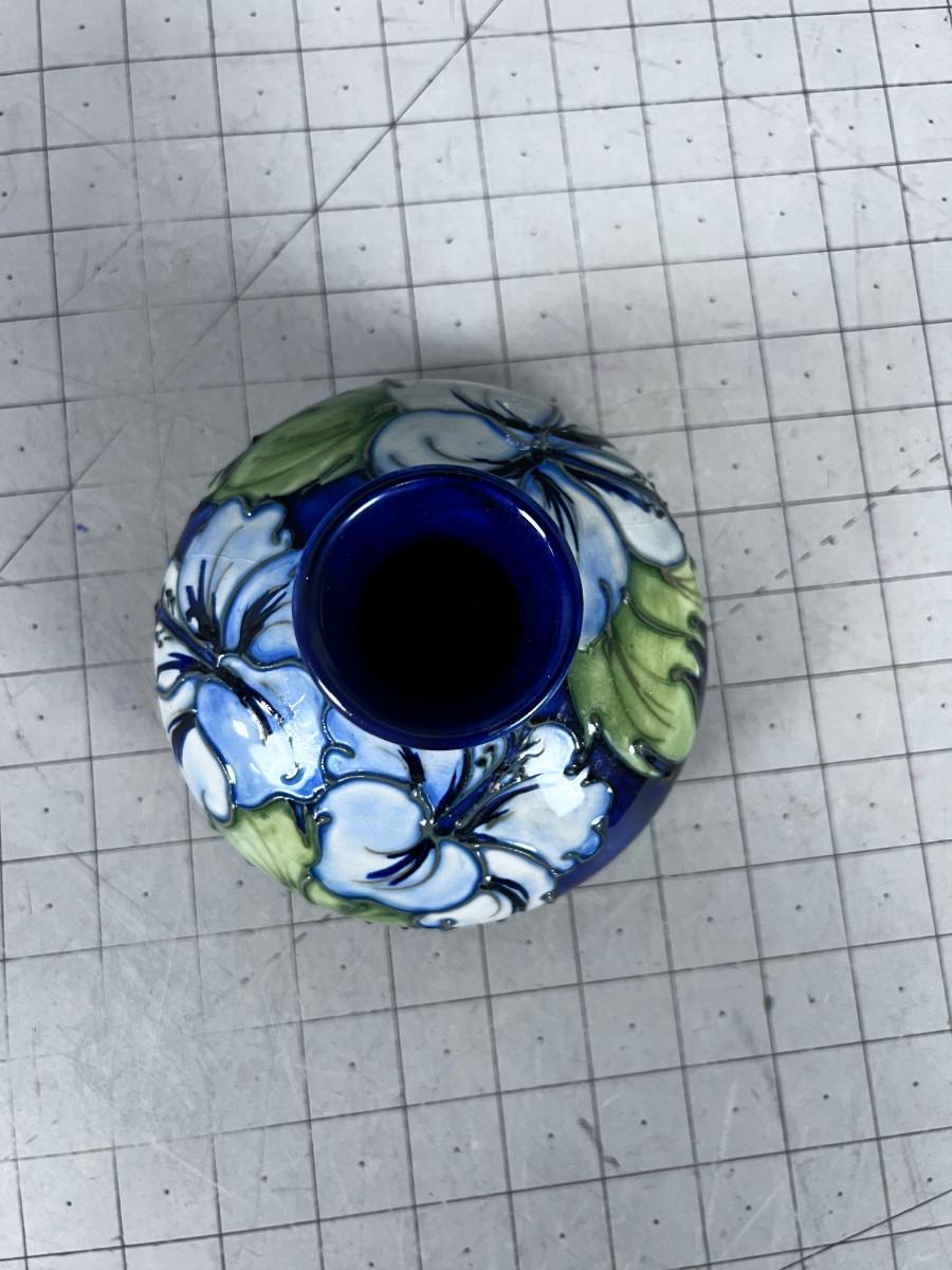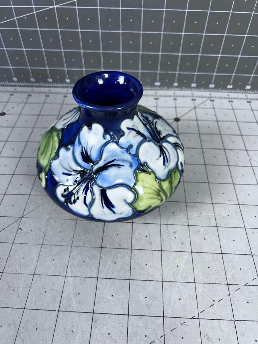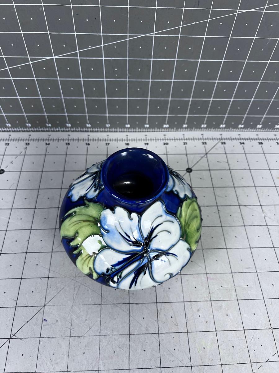 MOORCROFT, Made in England Navy Blue with Lily like flowers, Thick Pottery Vase