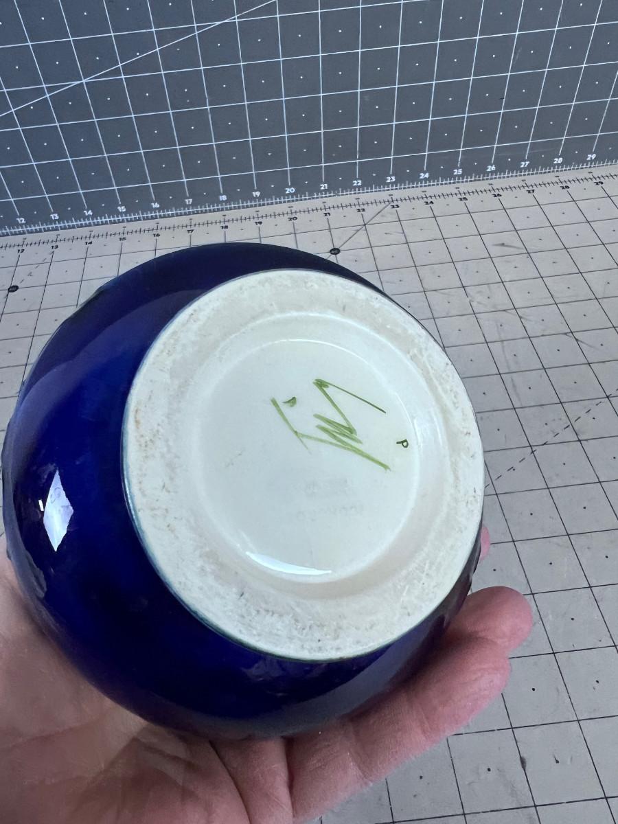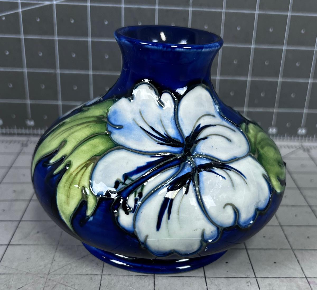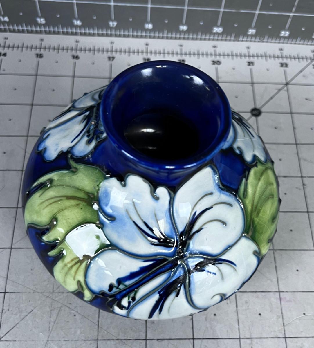 MOORCROFT, Made in England Navy Blue with Lily like flowers, Thick Pottery Vase