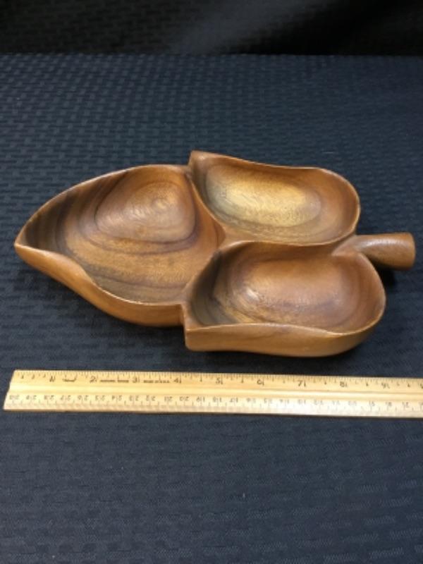 Up for auction is a vintage Monkeypod wood triple divided bowl. It is in used condition with some slight scuffing; see pictures.