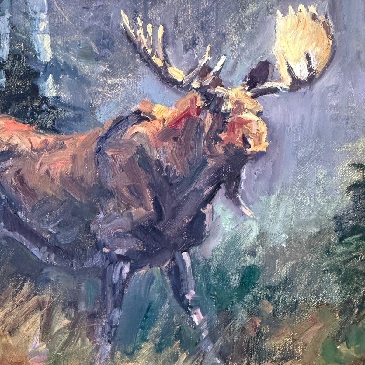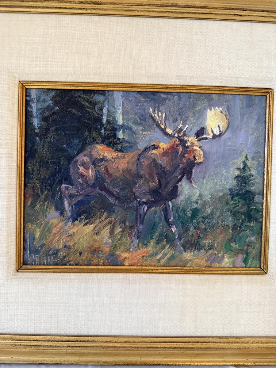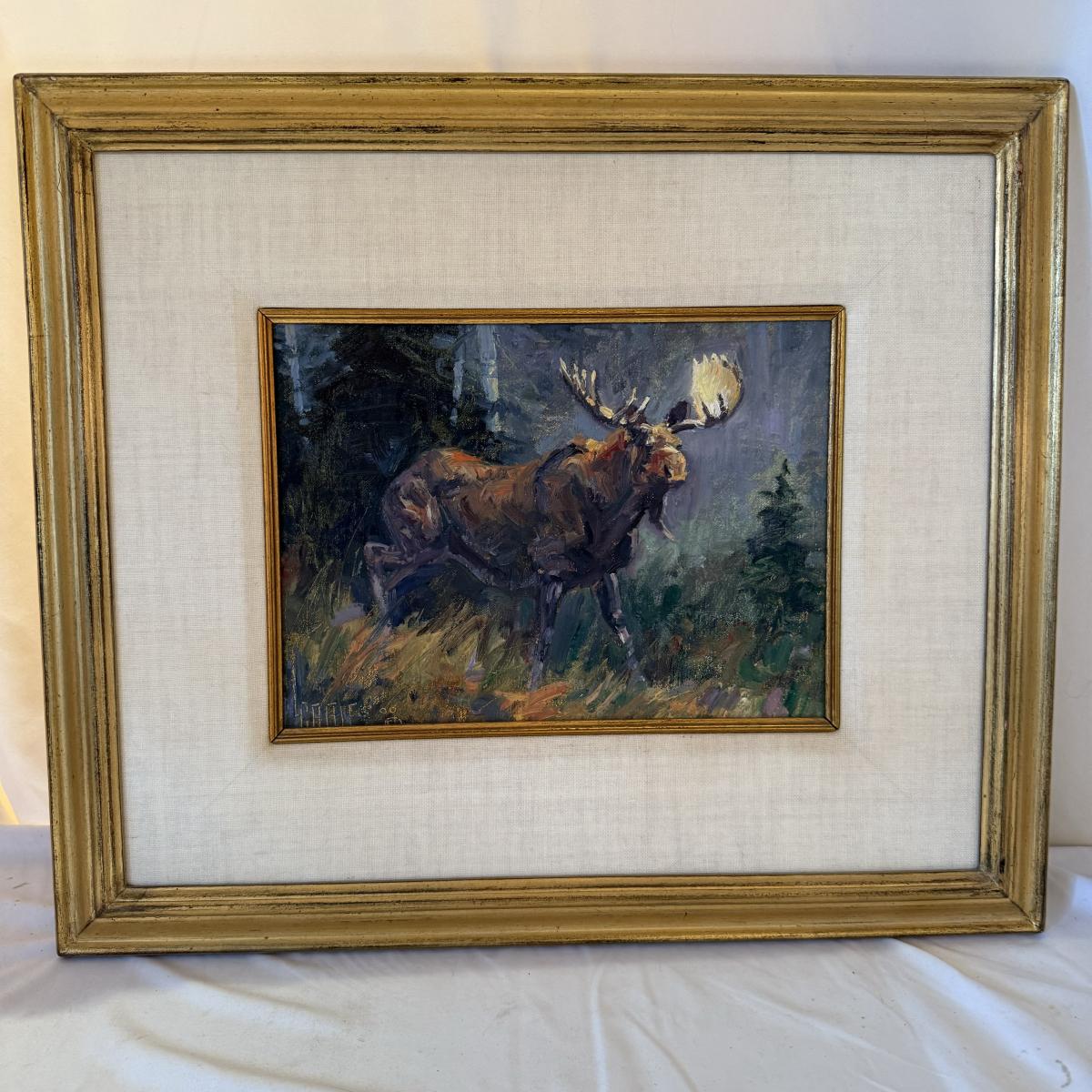 A canvas matted painting of a moose in a gold wooden frame. The piece measures 20” X 17” medium unclear, but appears to be acrylic.