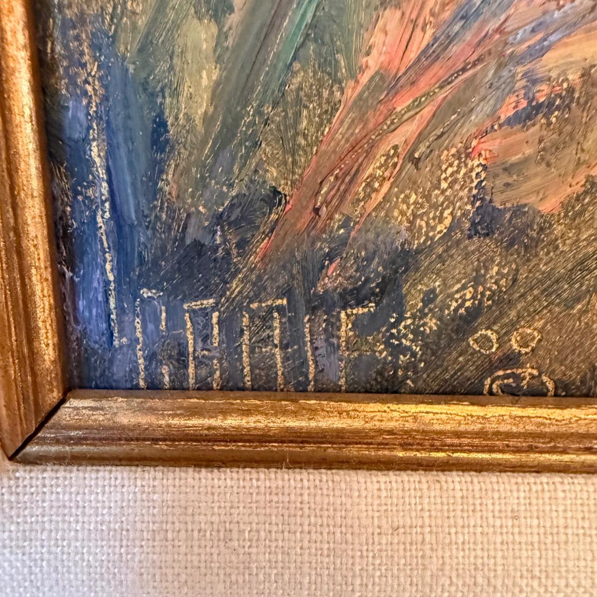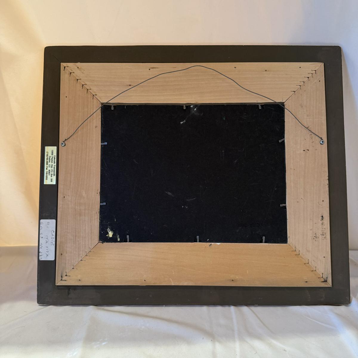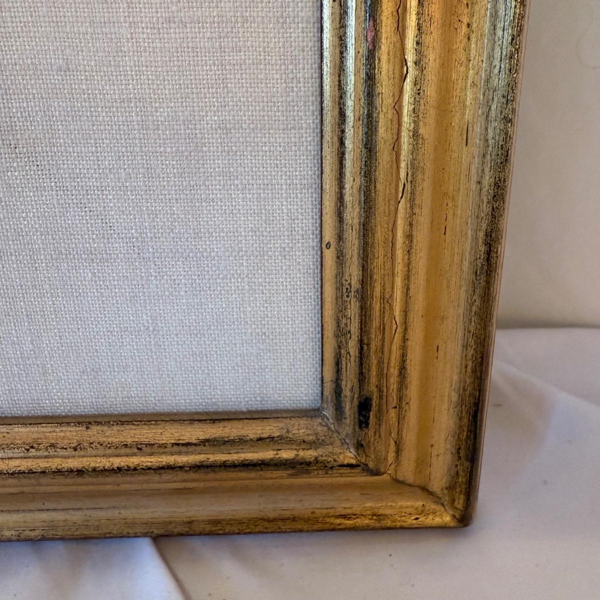 A canvas matted painting of a moose in a gold wooden frame. The piece measures 20” X 17” medium unclear, but appears to be acrylic.