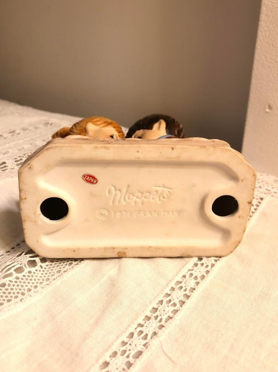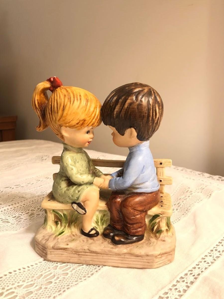 Adorable boy and girl holding hands and sitting on bench. 6" h.