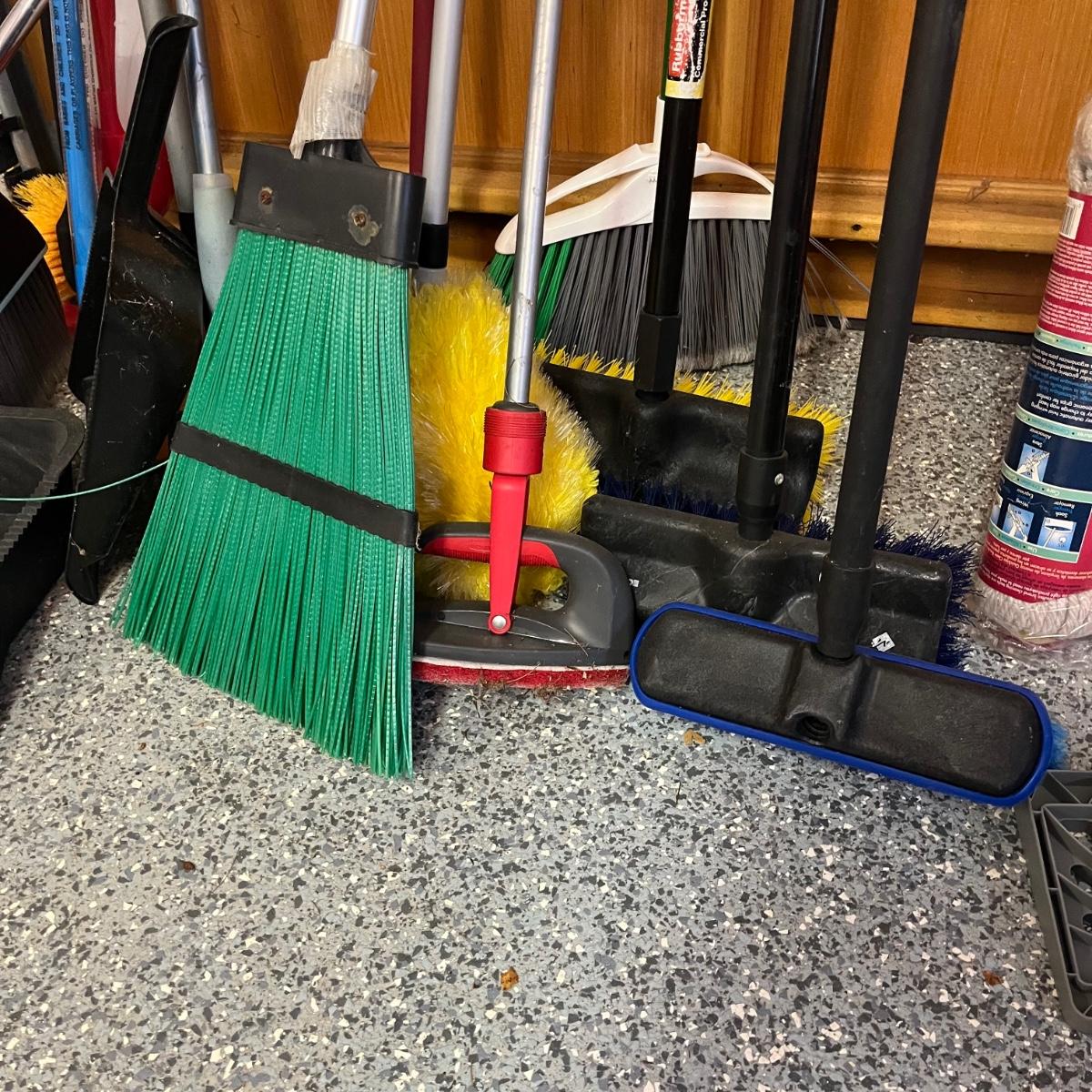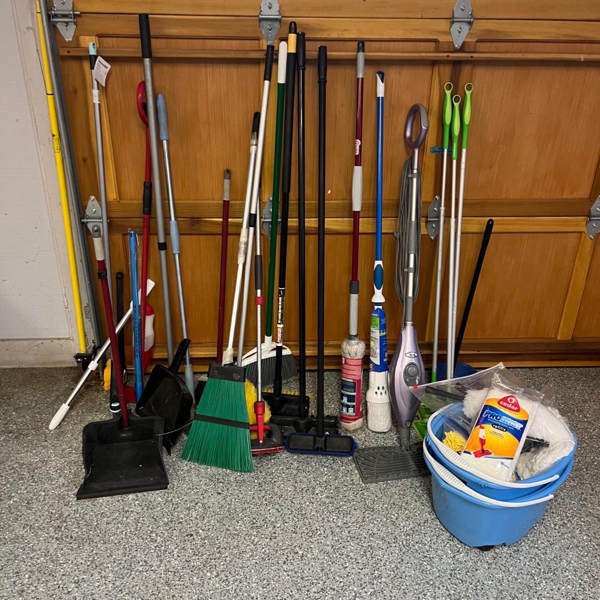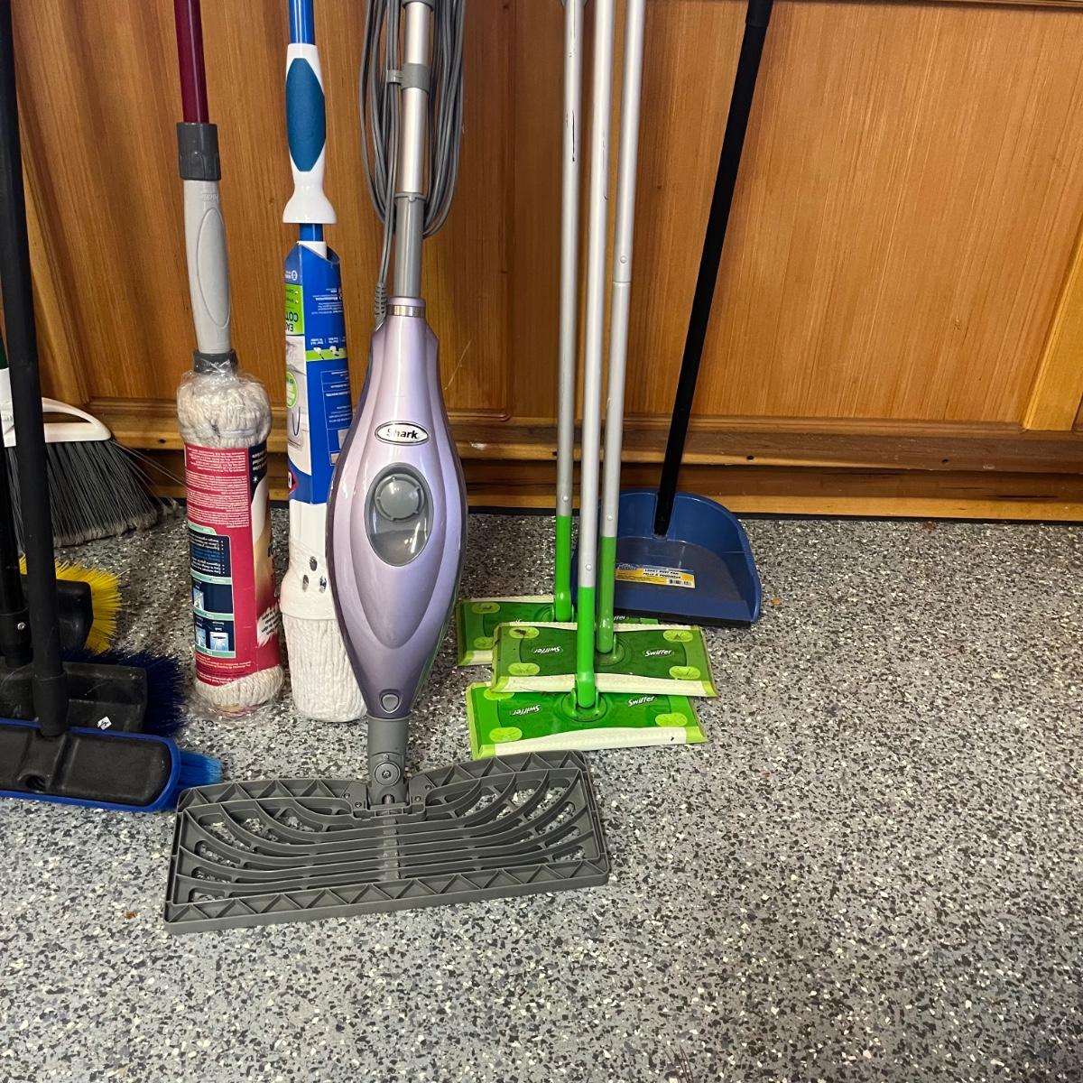 Lot includes a Shark Steam mop that powered on when plugged in. Also includes Swiffers, brooms, dustpans, mops, brushes and more.