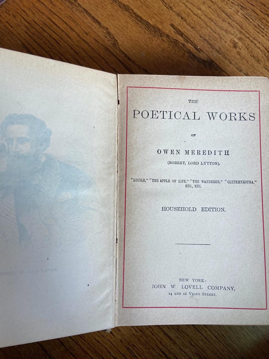 The Poetical Works of Owen Meredith, house hold edition, John W. Lovell Company, brown hardcover