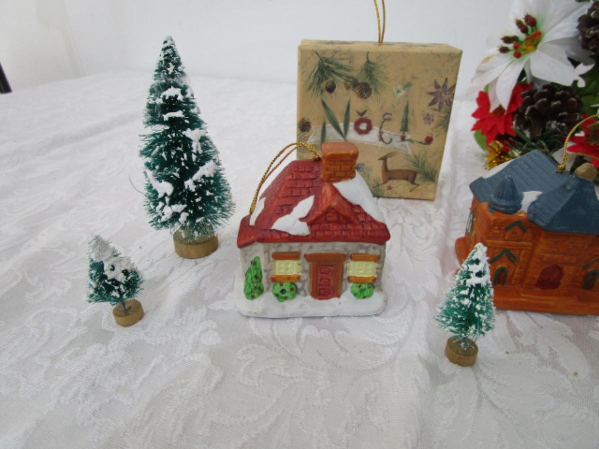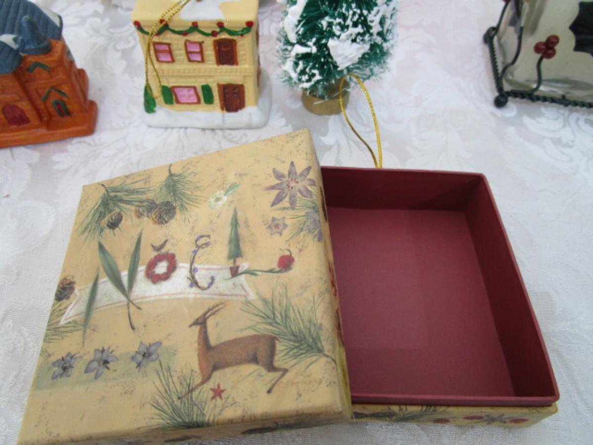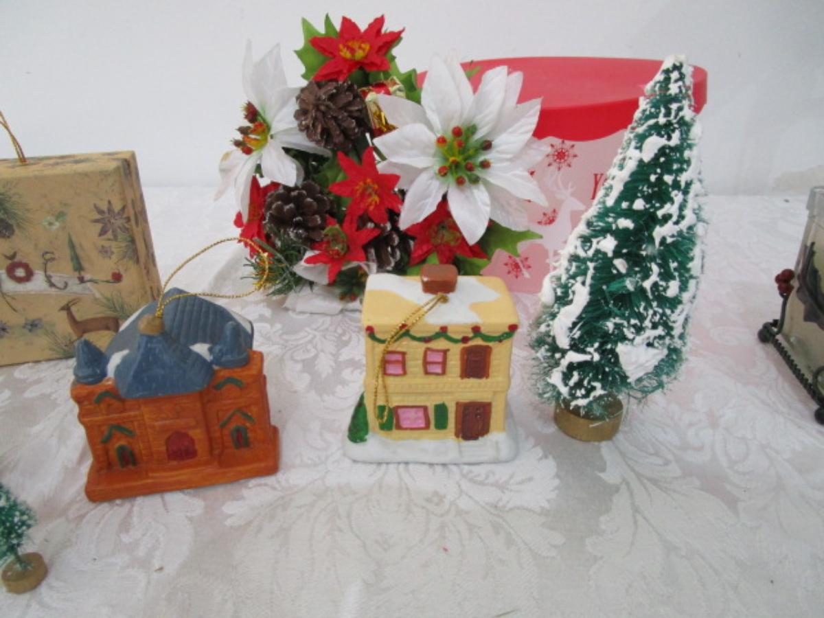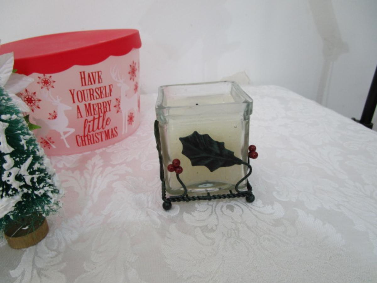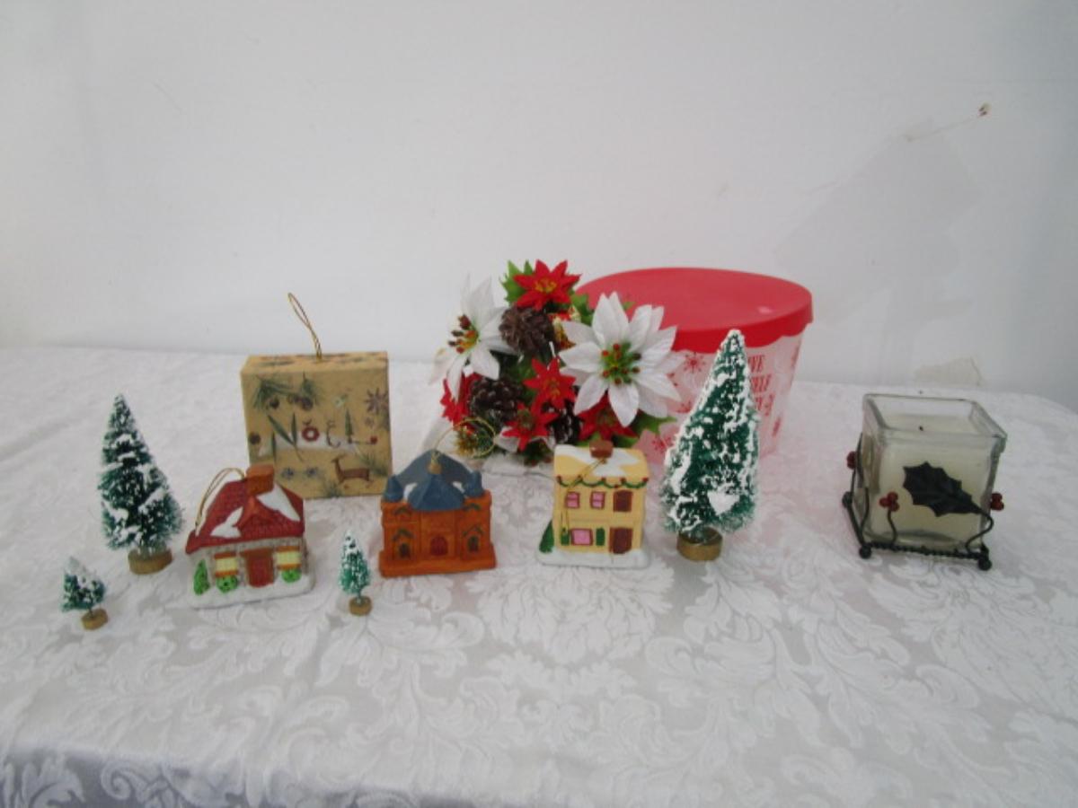 1 plastic Christmas bowl with lid, 3 bell ornaments, 1 candle, 4 frosted small trees, 1 small wreath, Christmas ornament that is also a box