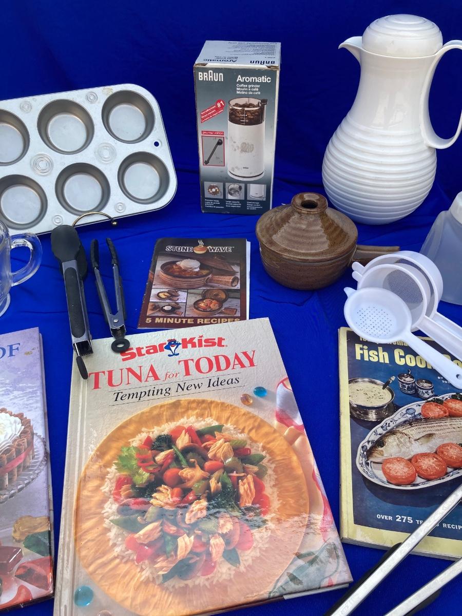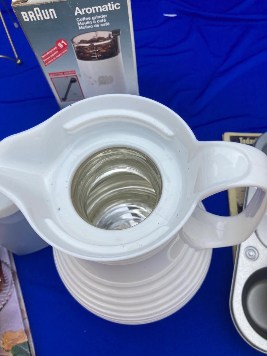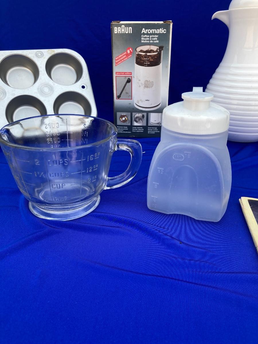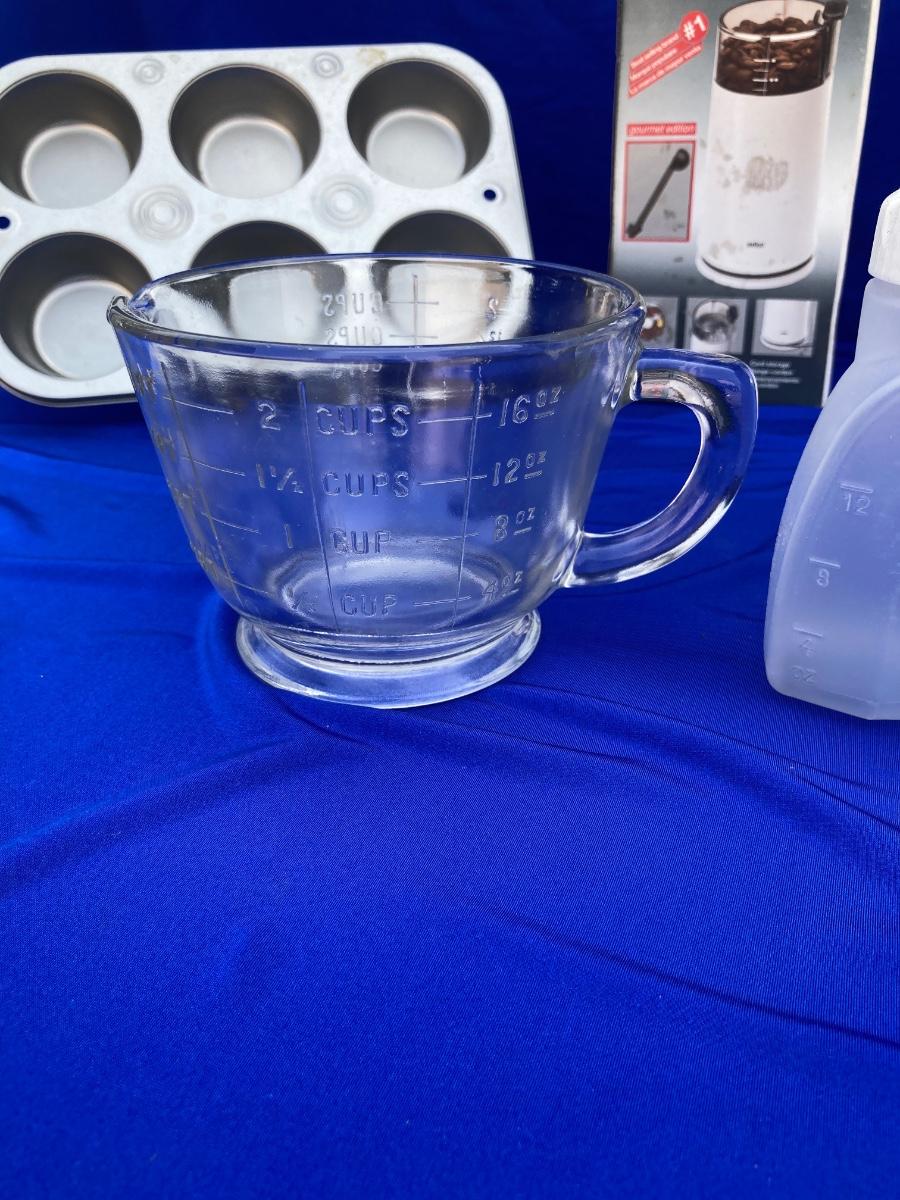 MORE GOOD KITCHEN STUFF, A NIB COFFEE GRINDER, COOL VINTAGE GLASS LIQUID MEASURER ,STONEWAVE MICROWAVE DISH & MORE