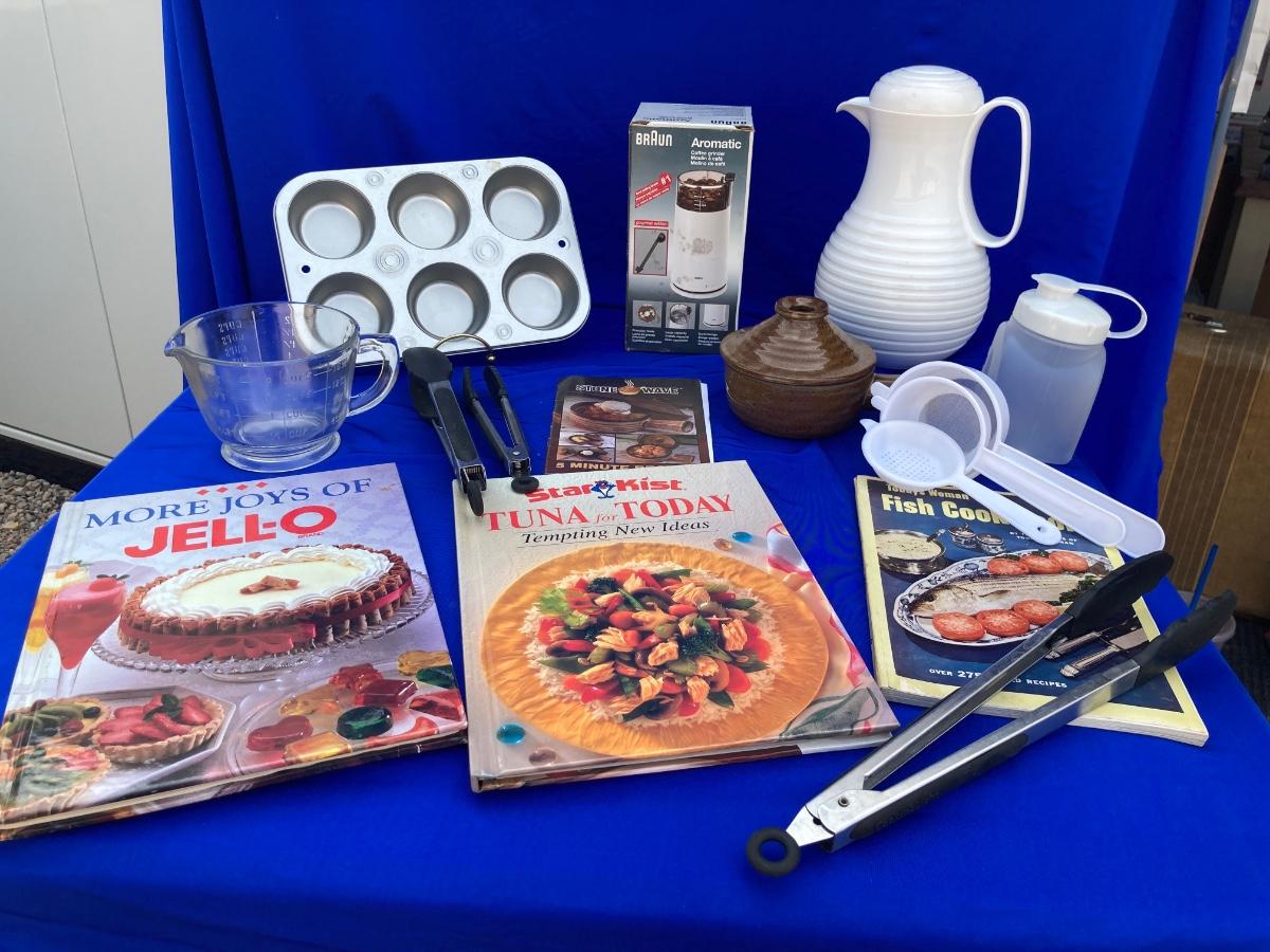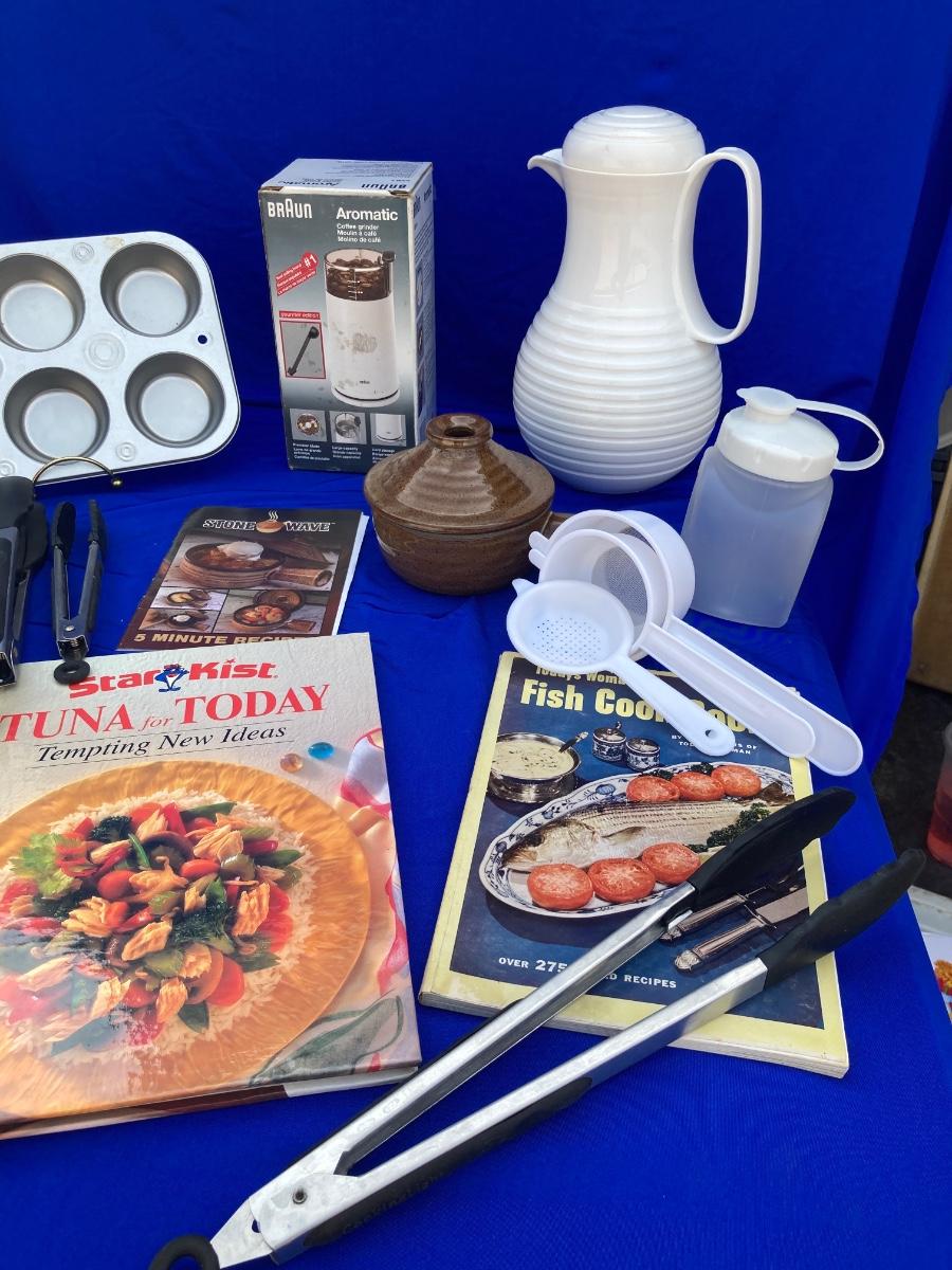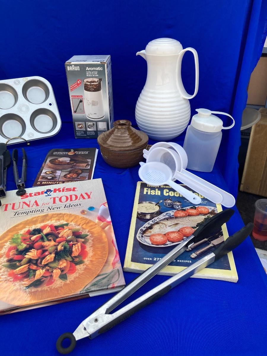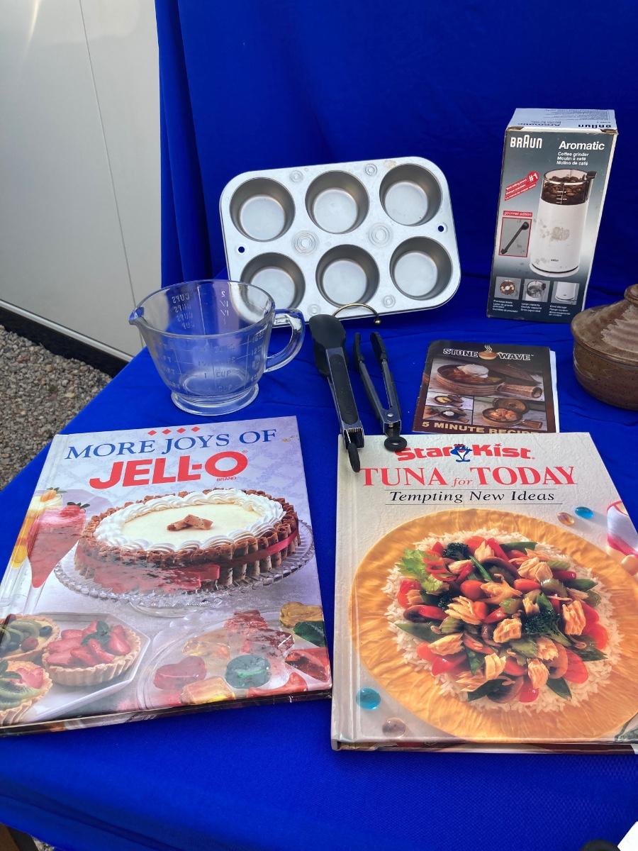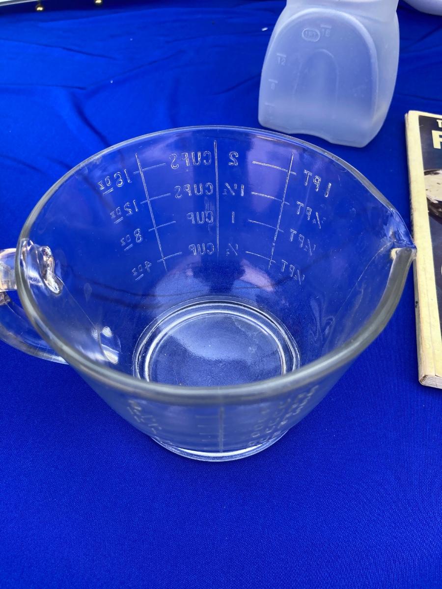 MORE GOOD KITCHEN STUFF, A NIB COFFEE GRINDER, COOL VINTAGE GLASS LIQUID MEASURER ,STONEWAVE MICROWAVE DISH & MORE