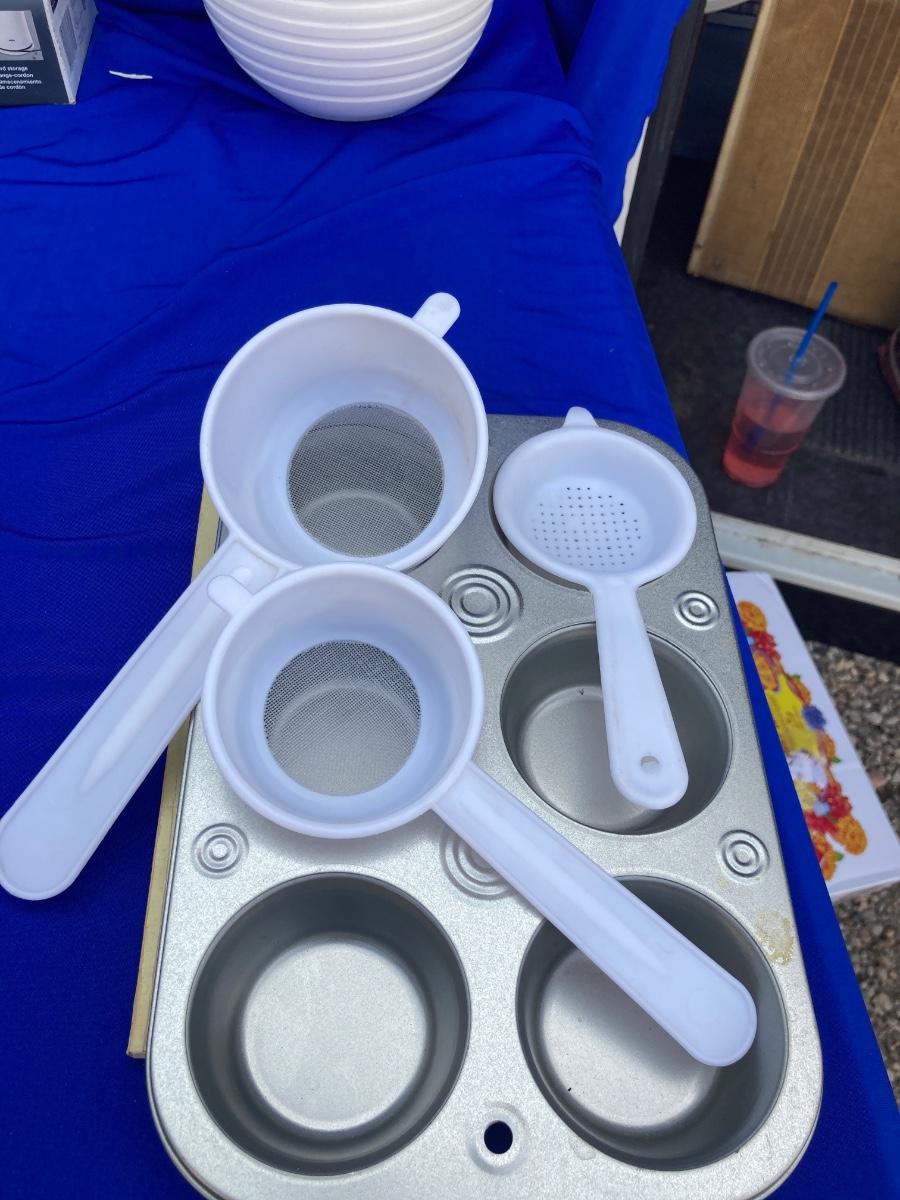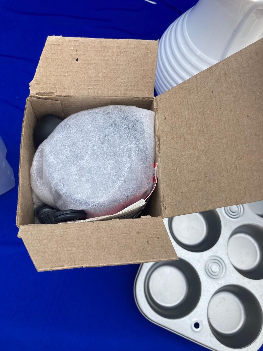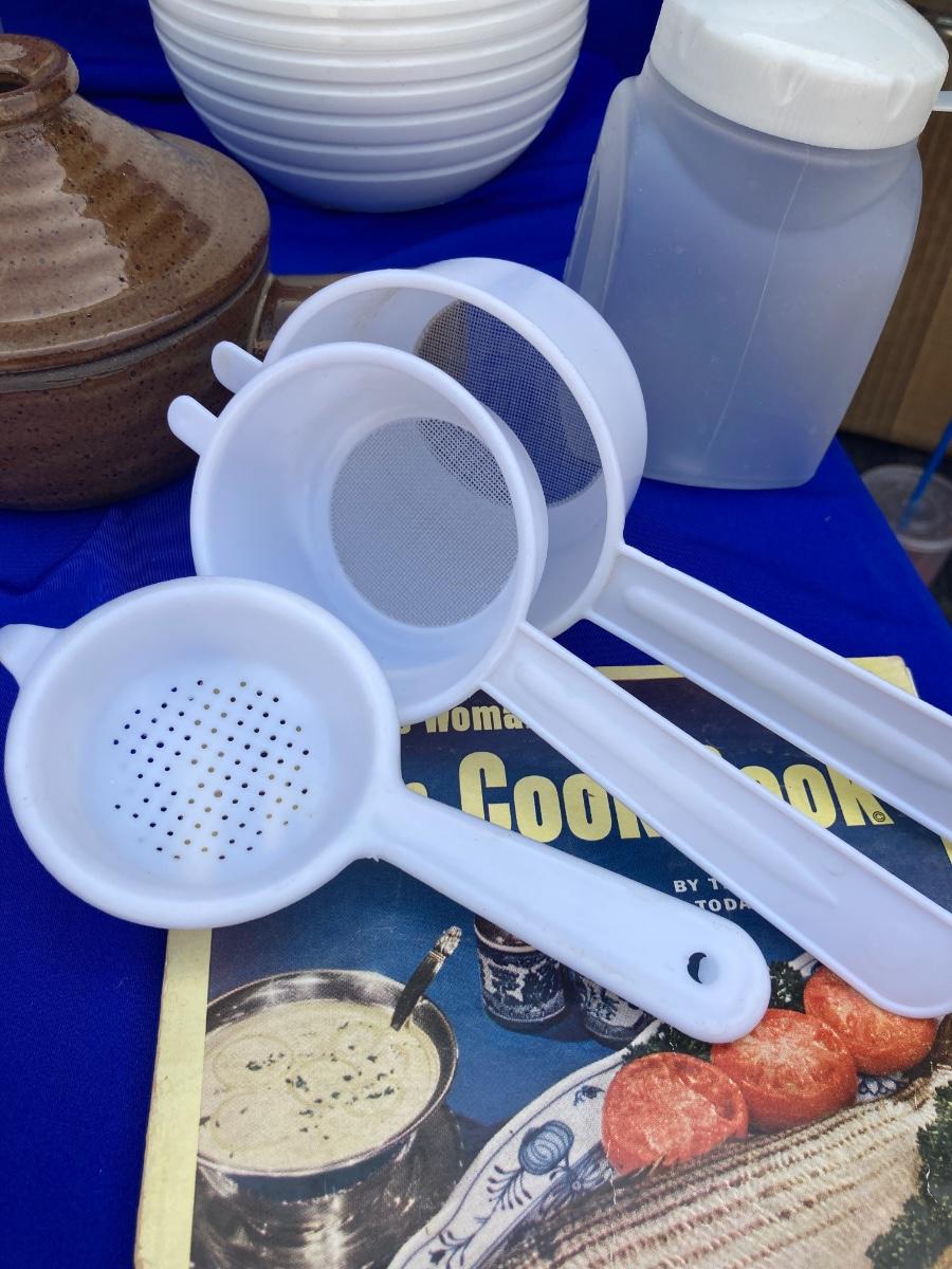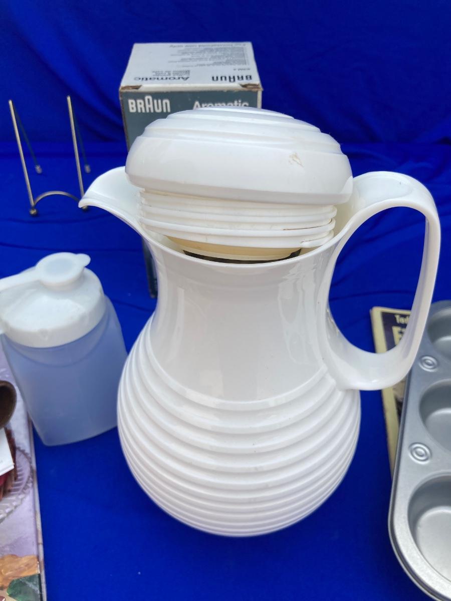 MORE GOOD KITCHEN STUFF, A NIB COFFEE GRINDER, COOL VINTAGE GLASS LIQUID MEASURER ,STONEWAVE MICROWAVE DISH & MORE