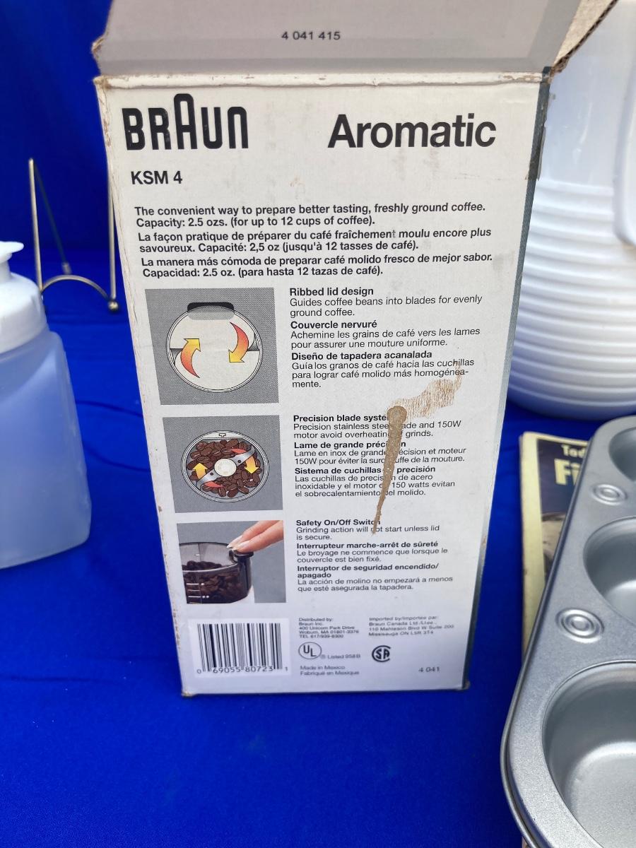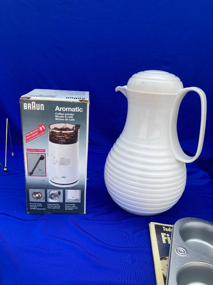 MORE GOOD KITCHEN STUFF, A NIB COFFEE GRINDER, COOL VINTAGE GLASS LIQUID MEASURER ,STONEWAVE  MICROWAVE DISH & MORE