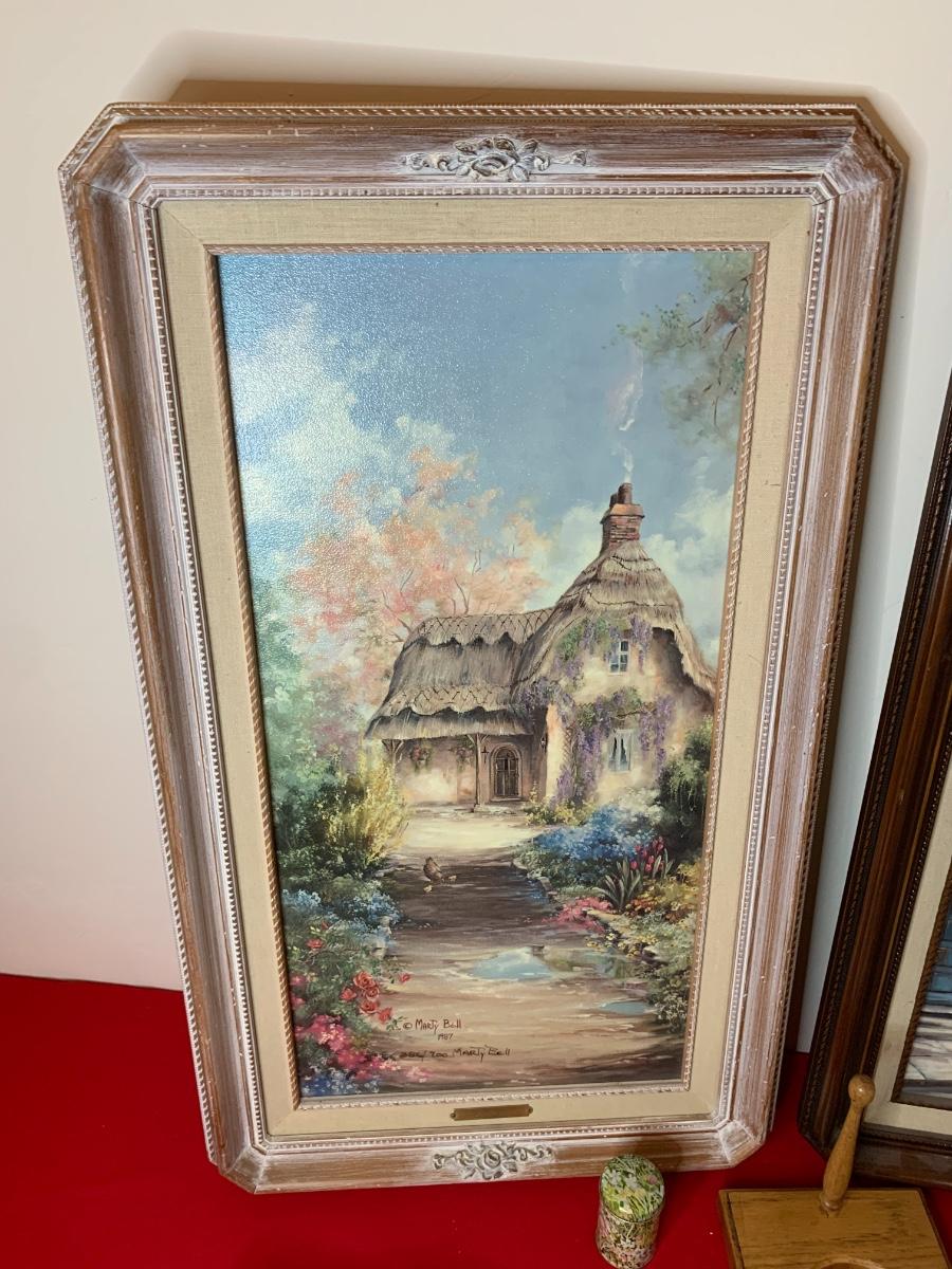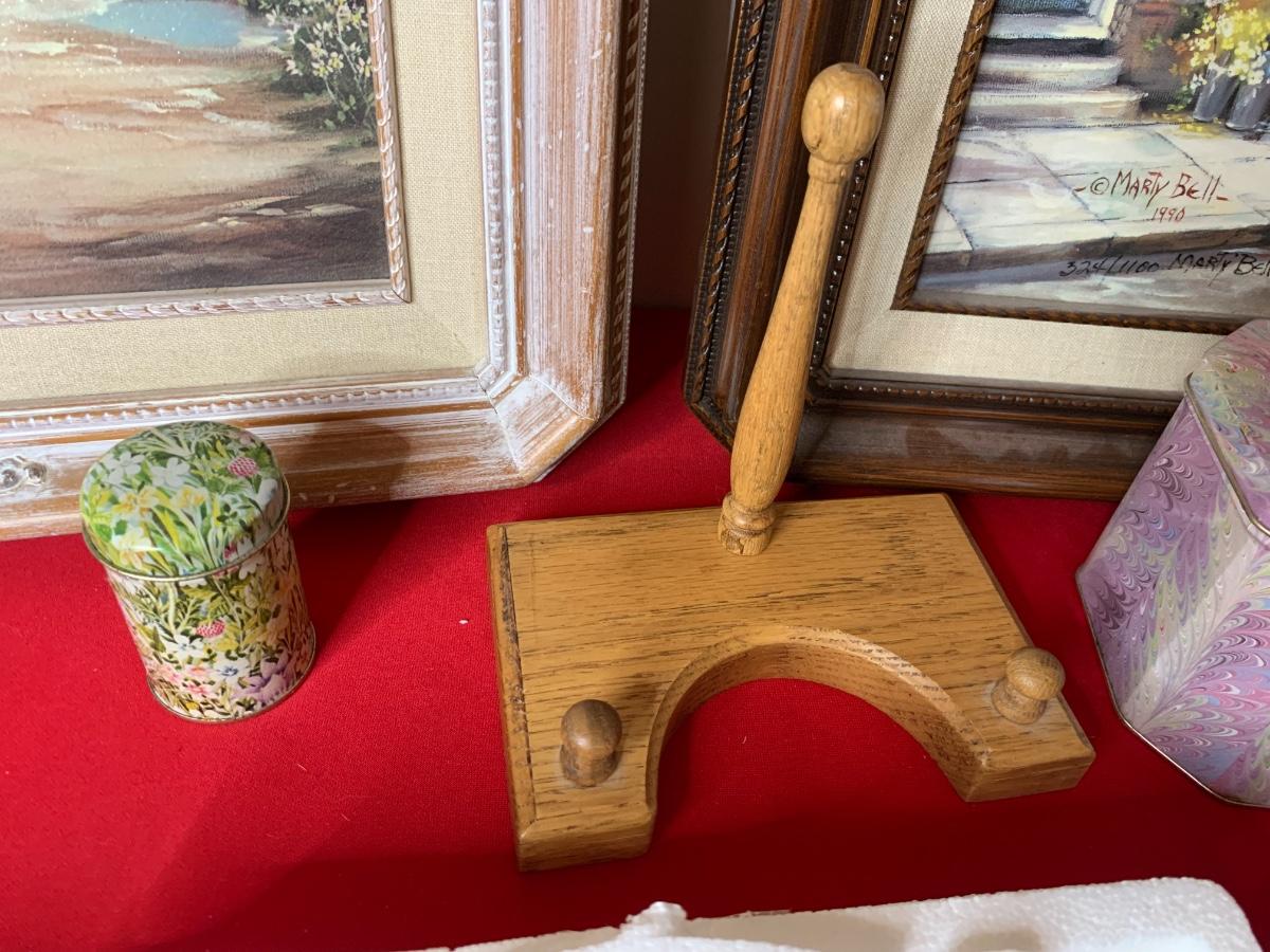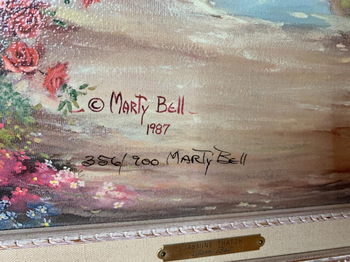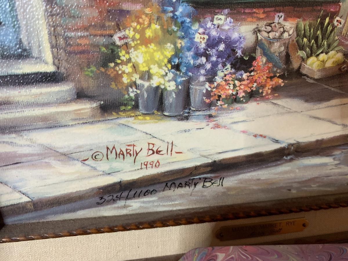 Lot includes two Marty Bell prints, singed and numbered. Frames are same but one has a white wash to the wood. 29” x 17”. Also includes a plate stand, 2 small tins and three Marty Bell Collectors plates. All in very good condition.