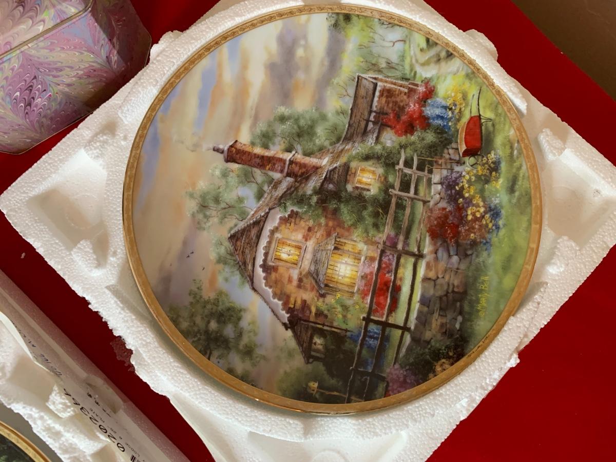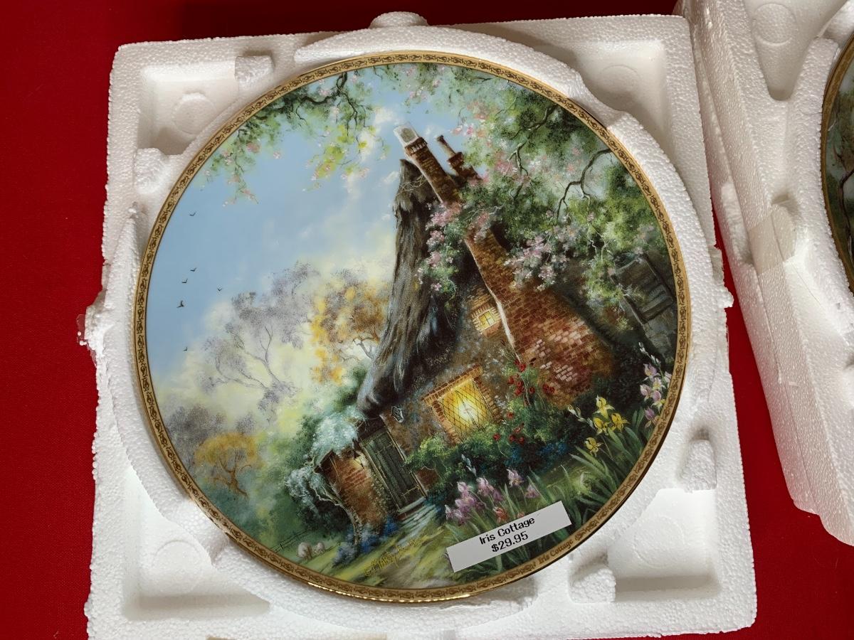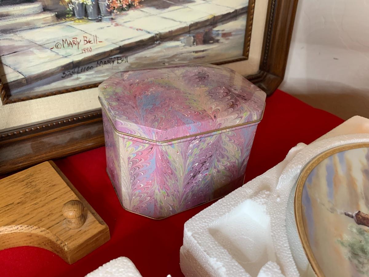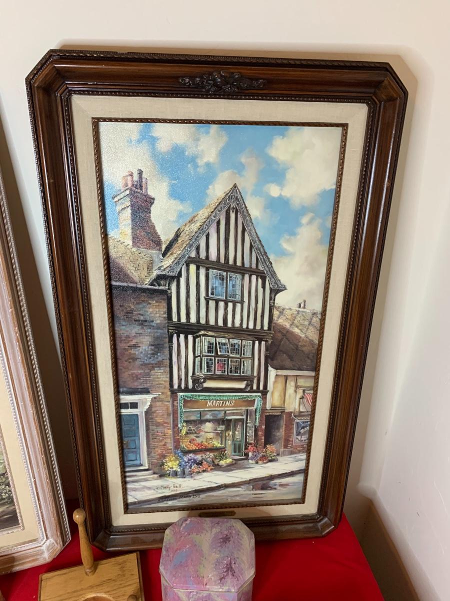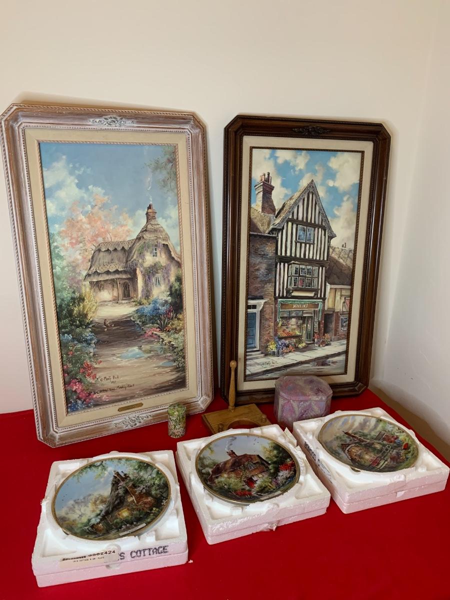 Lot includes two Marty Bell prints, singed and numbered. Frames are same but one has a white wash to the wood. 29” x 17”. Also includes a plate stand, 2 small tins and three Marty Bell Collectors plates. All in very good condition.