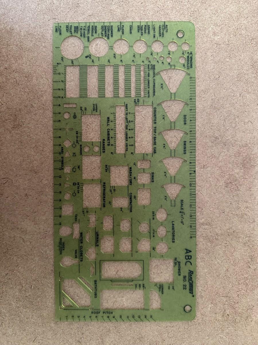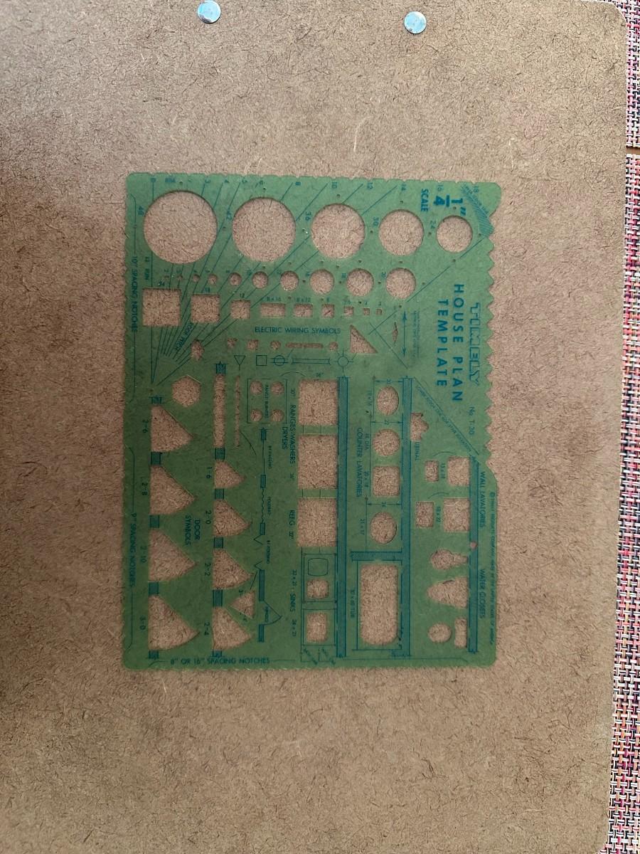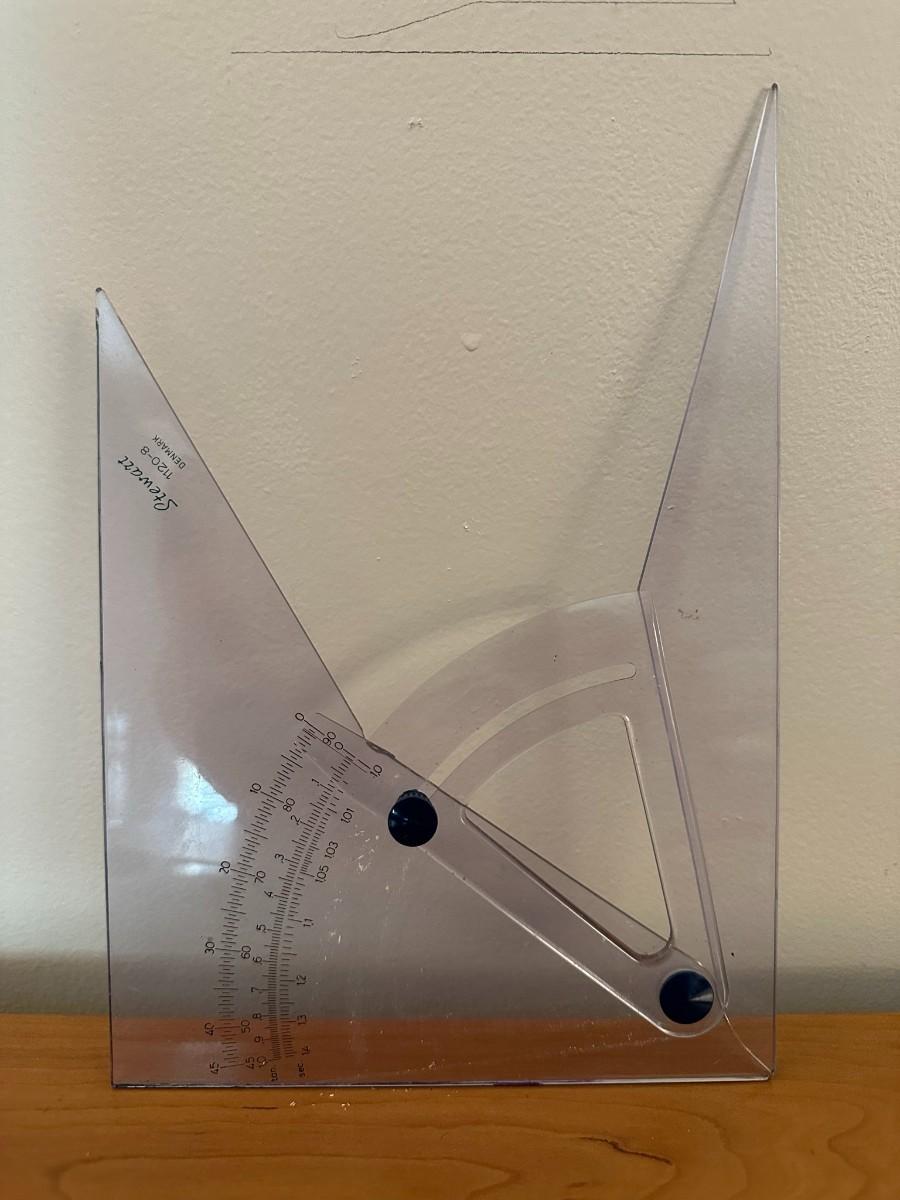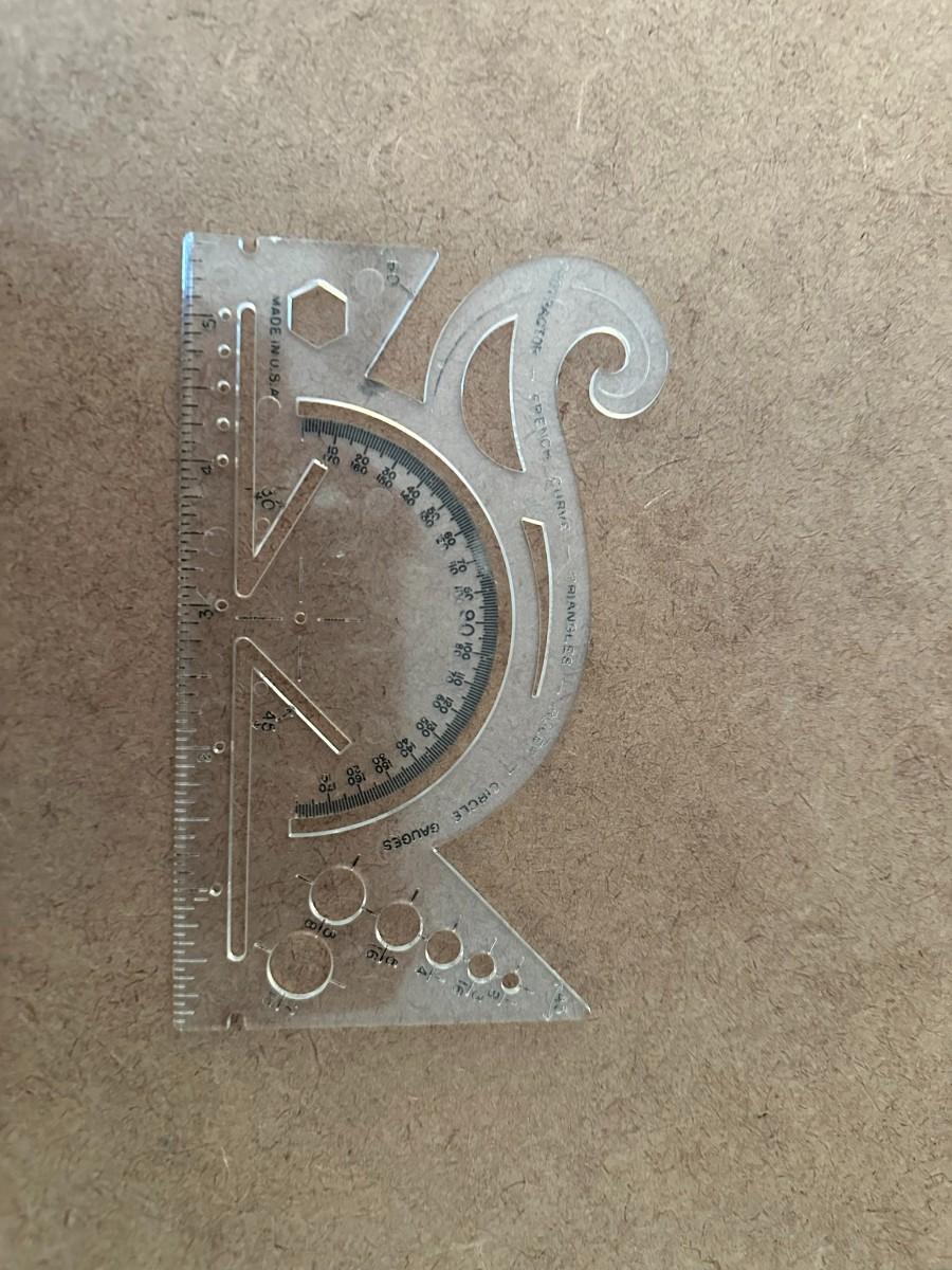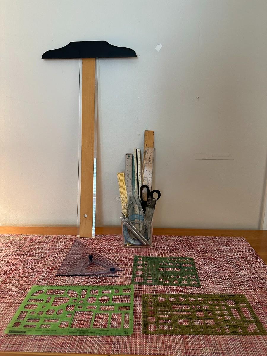 3 templates, Stewart angle tool, 3 protractors, gold ruler, plastic ruler, engineer slide ruler, 3 exacto knives, assorted rulers, scissors, blue circle tool, exacto blades, t-square and more pencil holders