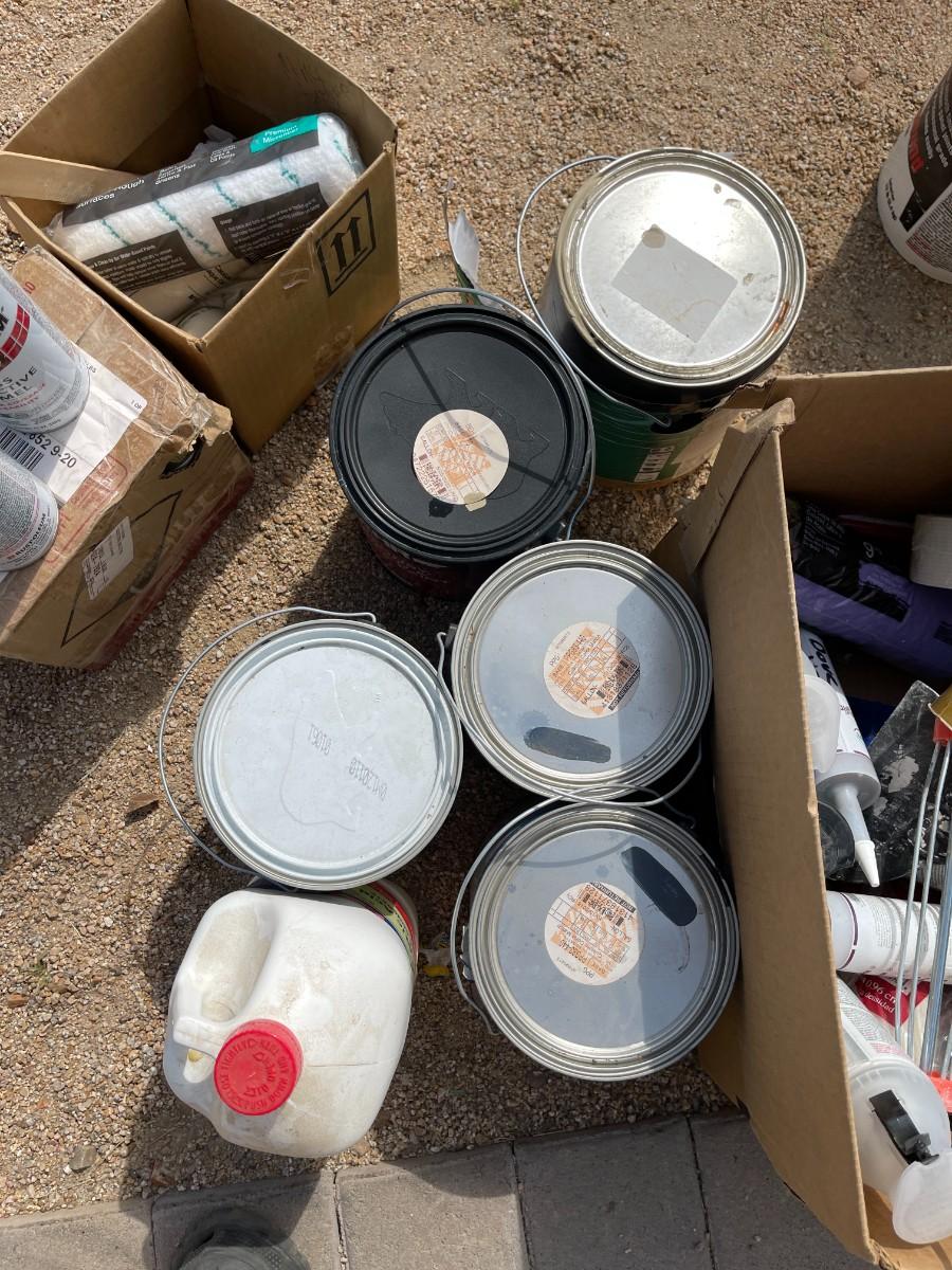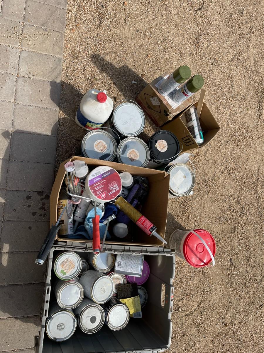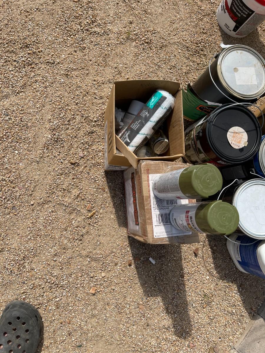 Includes a 8 cans of new flat OD Green, 2 gallons of a blue and various other materials for updating your walls