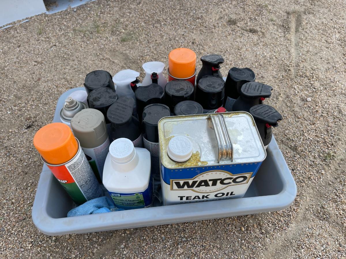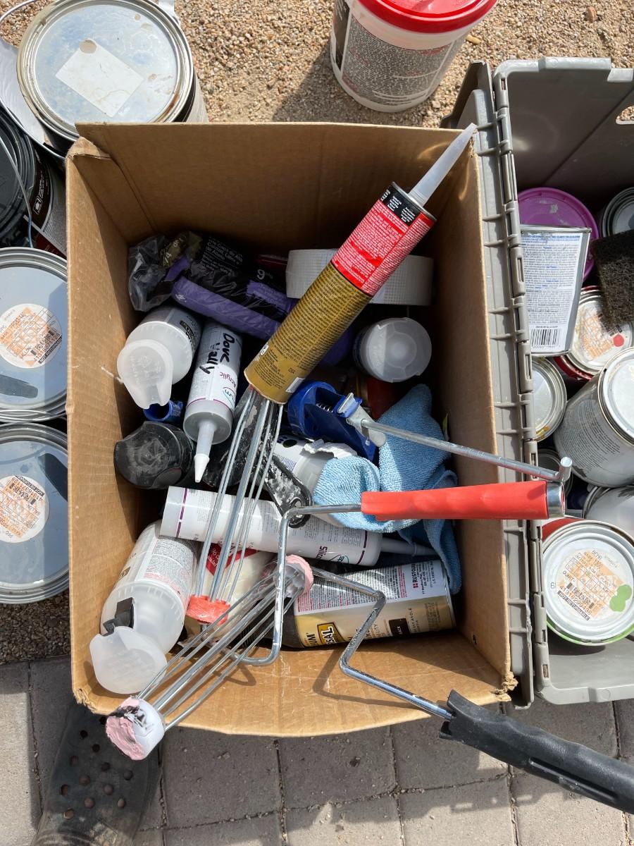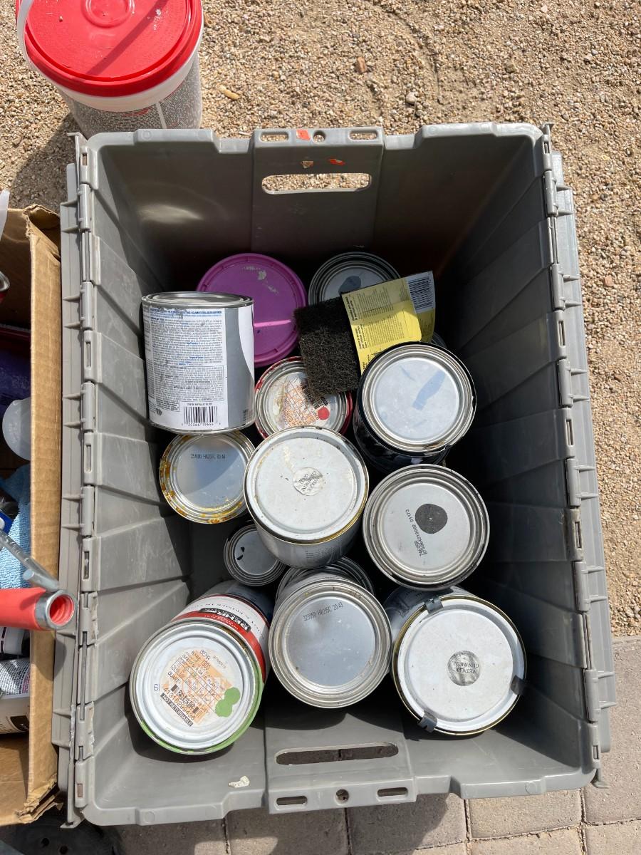 Includes a 8 cans of new flat OD Green, 2 gallons of a blue and various other materials for updating your walls