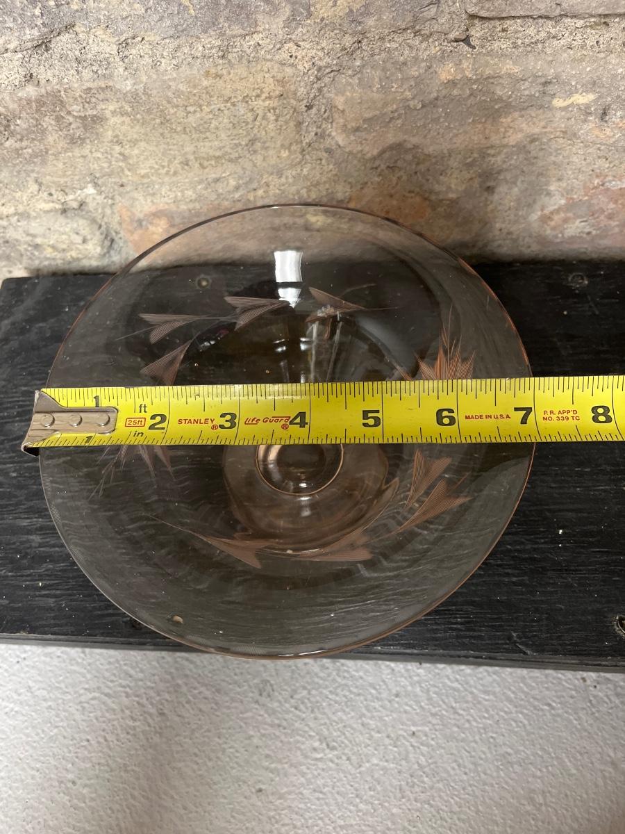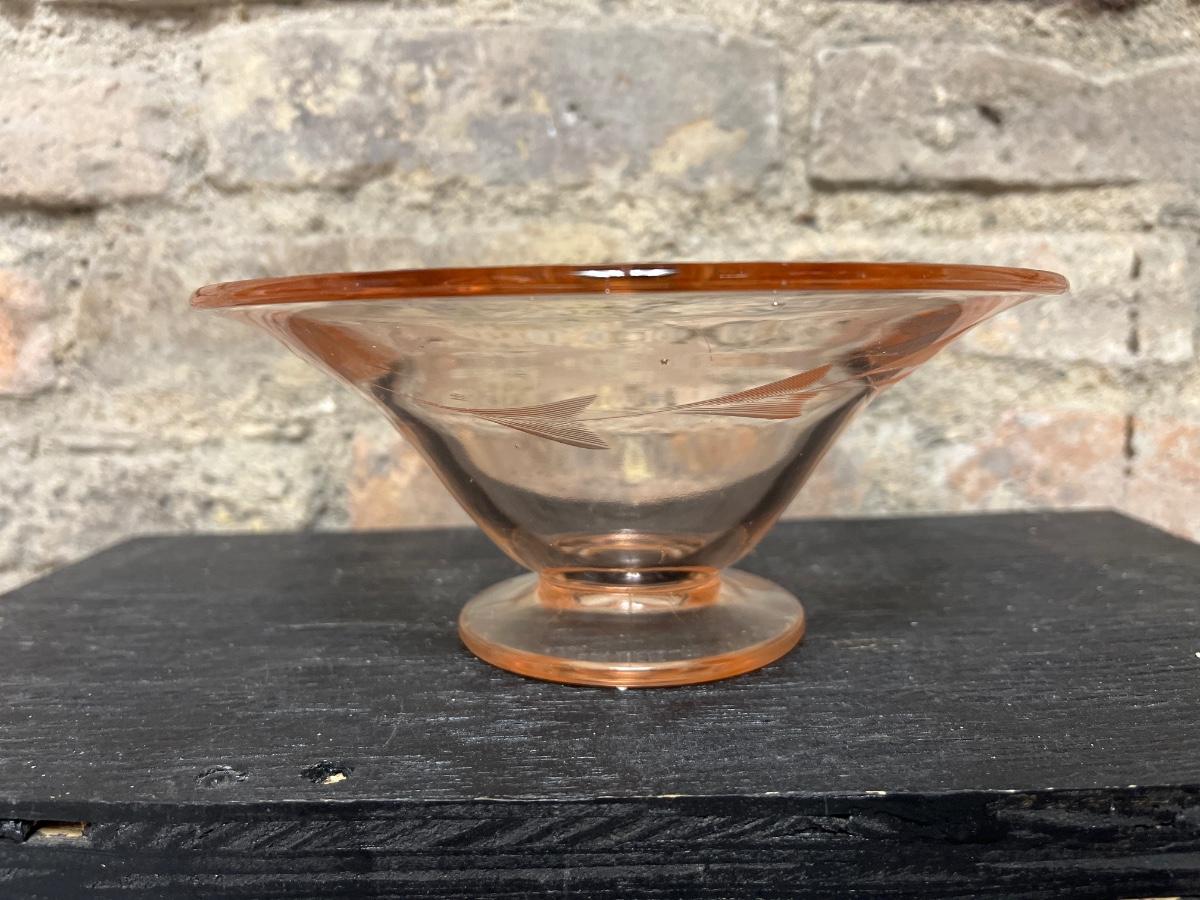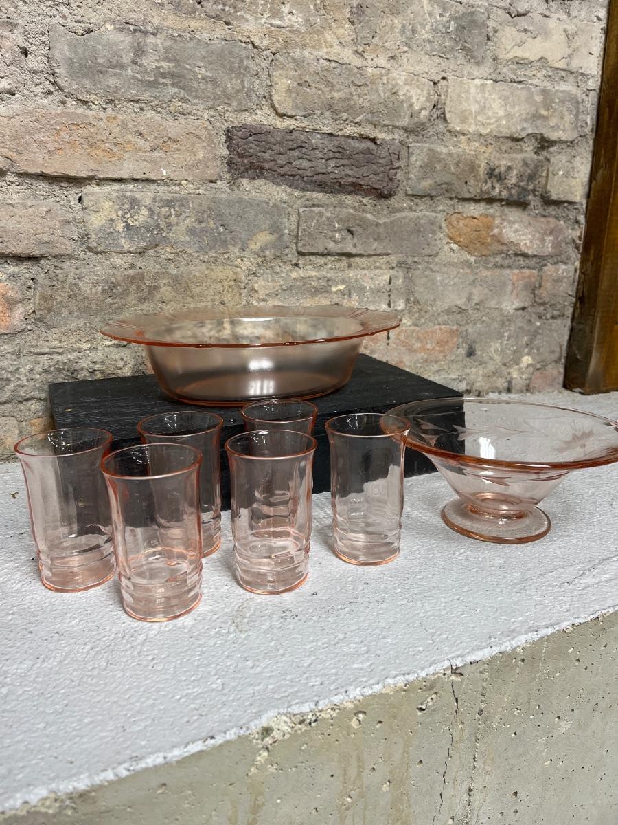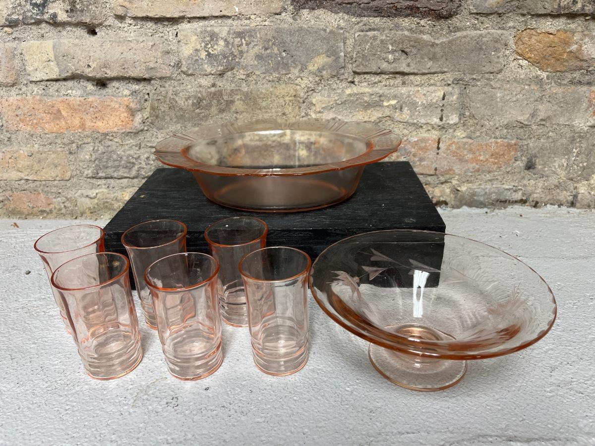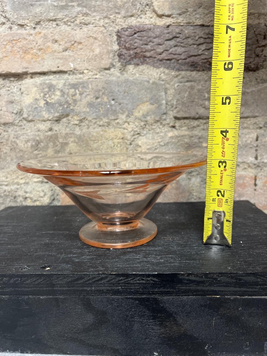 Macbeth Evan American Sweetheart vegetable bowl, Etched ( Heisey?) footed bowl, and six juice glasses