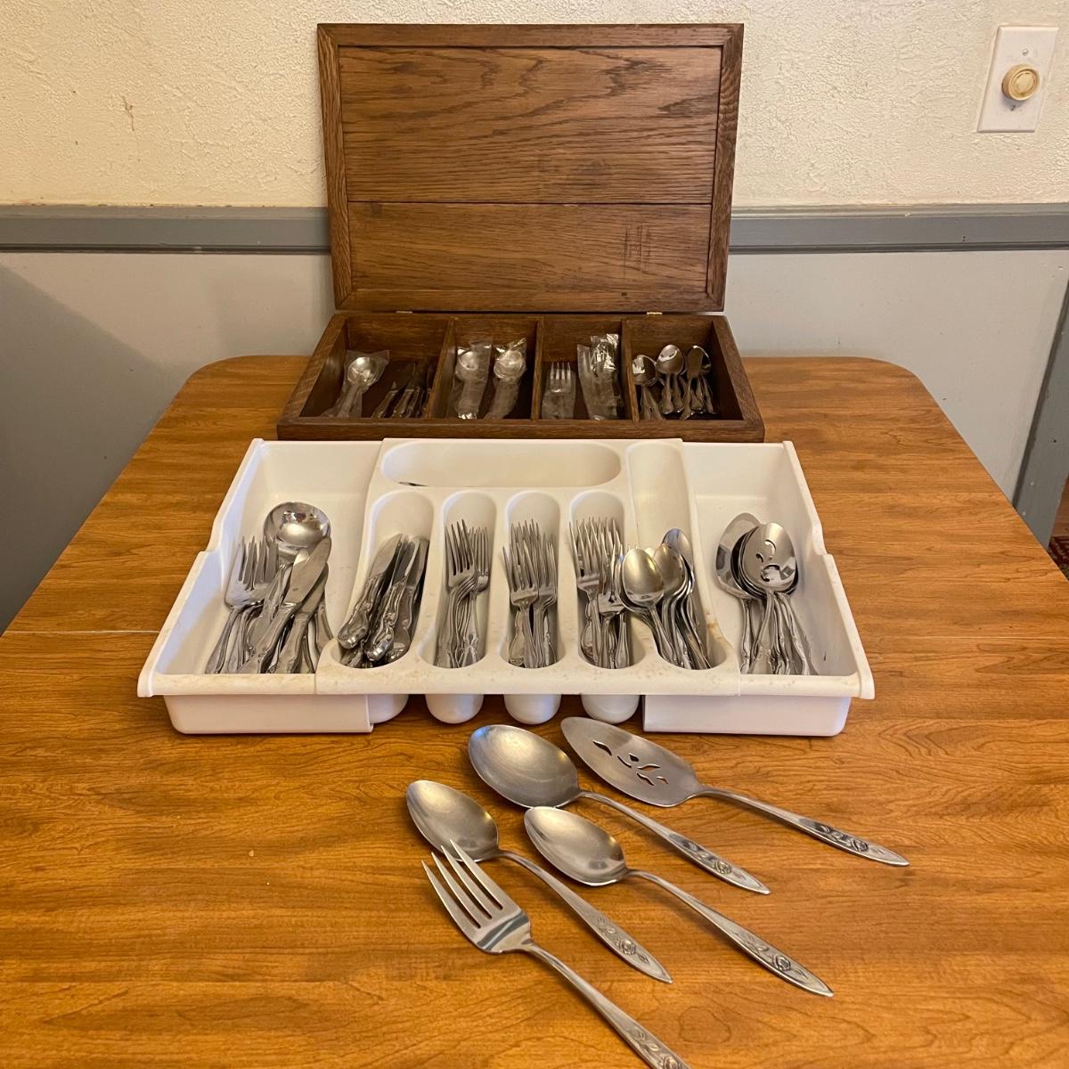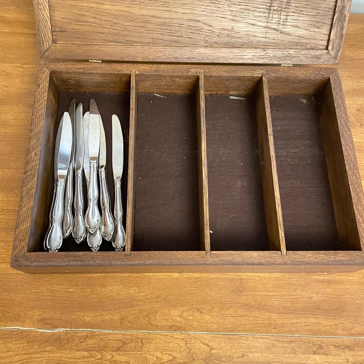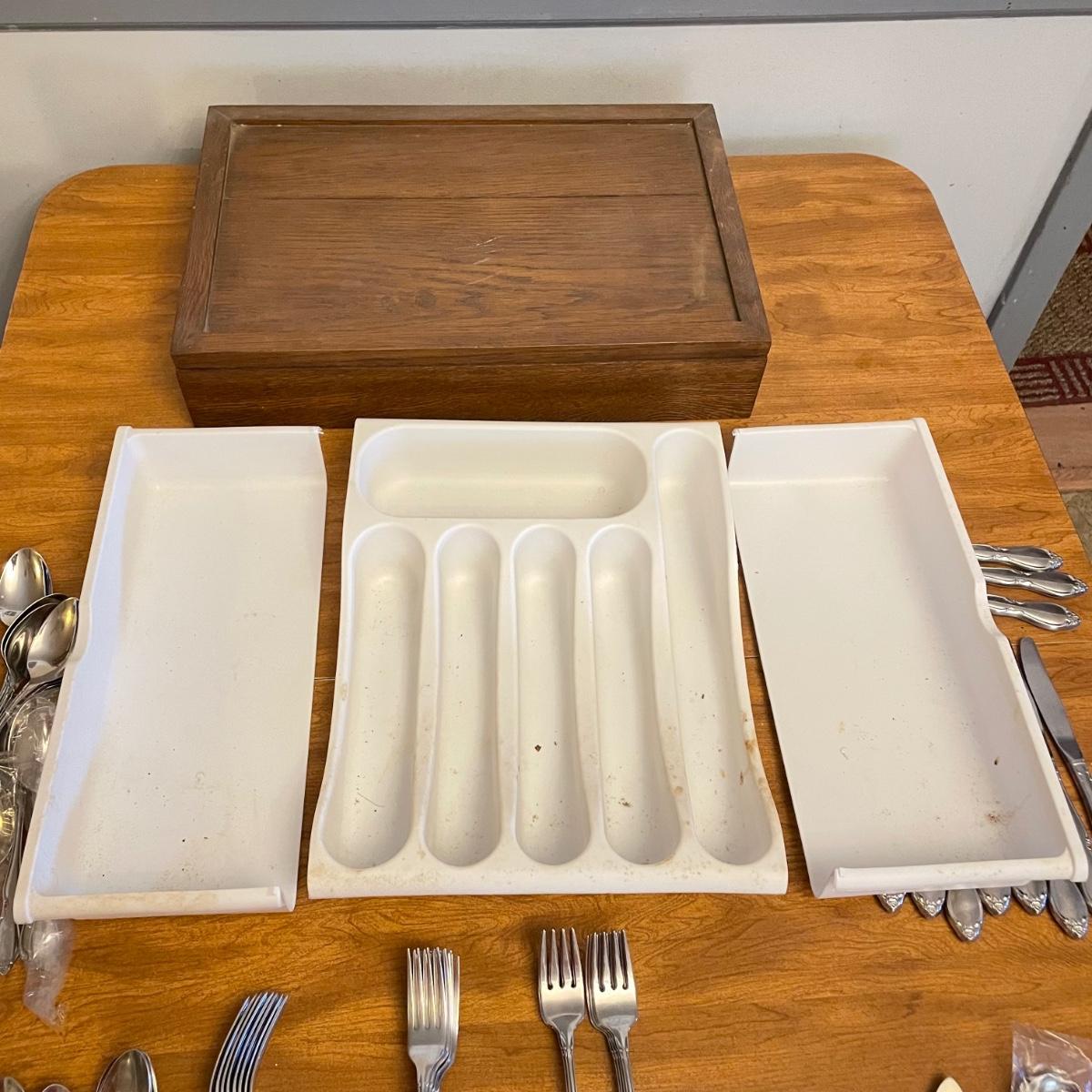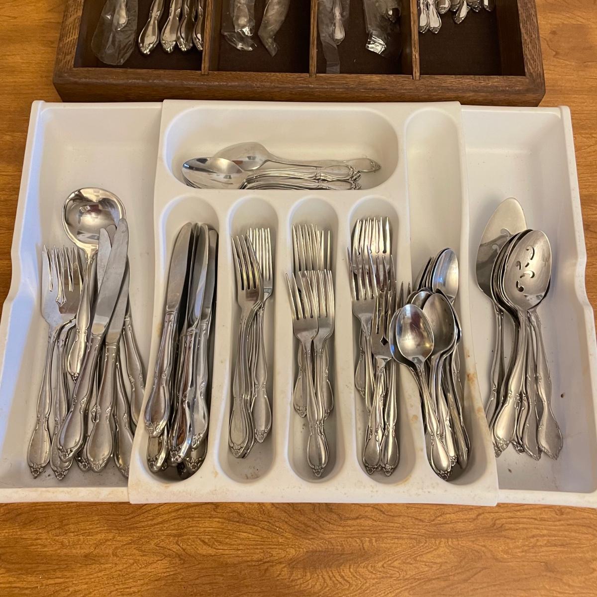 Large set of Oneida Cutlery, plus serving utensils and wooden case. Lot includes eight large dinner knives and eleven smaller dinner knives, eight dessert forks, eleven salad forks, and eight entree forks. There are twenty-six coffee/dessert spoons and twelve soup spoons. Additionally, there are eleven large and six smaller matching serving utensils, plus five more larger servers with large roses on the handles. See images. Box measures 19” x 12.5” x 3.75”. Plastic drawer liner has two separate sides to adjust width. Items should be cleaned before use. Local pick up only.